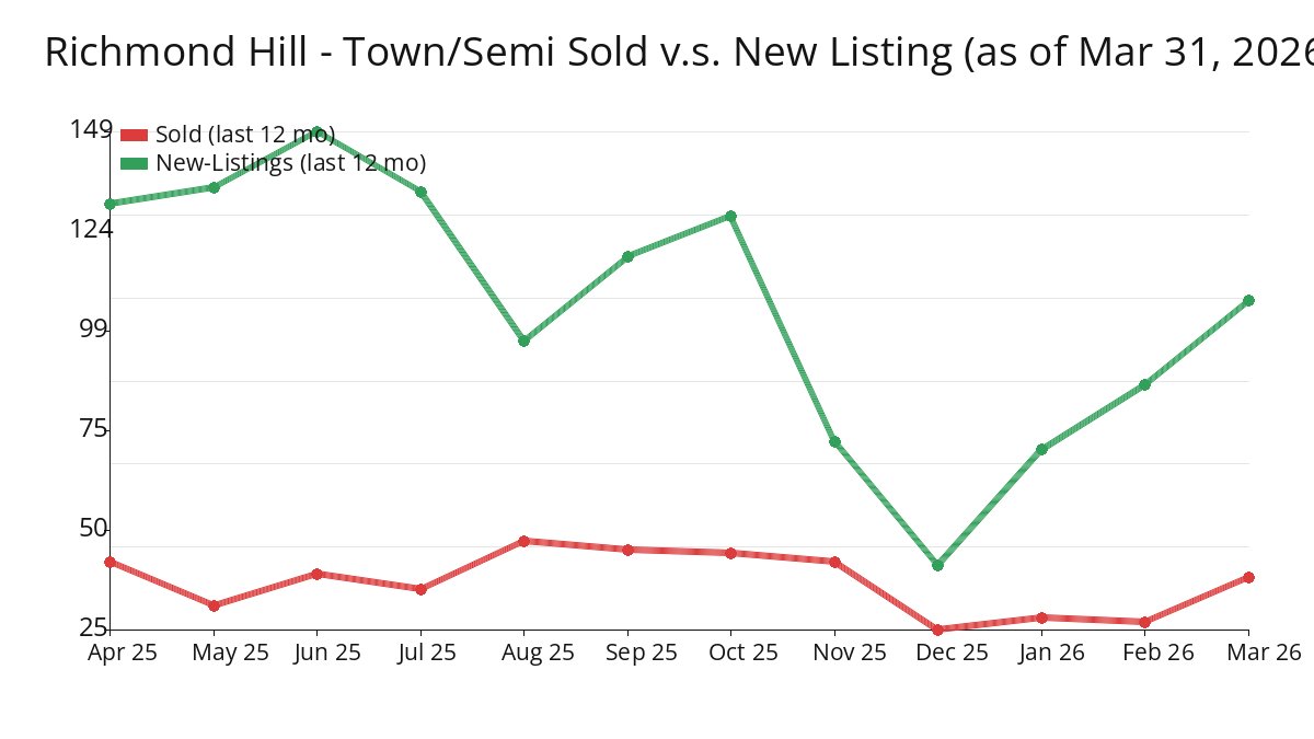 The average price of detached houses was -0.2% from the previous month, -7.6% from the same month last year. Approximately 65.8% of total freehold units sold in Richmond Hill were Detached houses. If you plan to buy a detached home in Richmond Hill, expect an average price around $1.6M. The current month of inventory of Detached dwellings is around 5.95. On average, Detached homes stay on the market for about 25 days before selling. To rent a Detached home, it will cost about $3.13K, MoM +0.4%, YoY -13.5%. Rental inventory indicates a Balanced Rental Market.