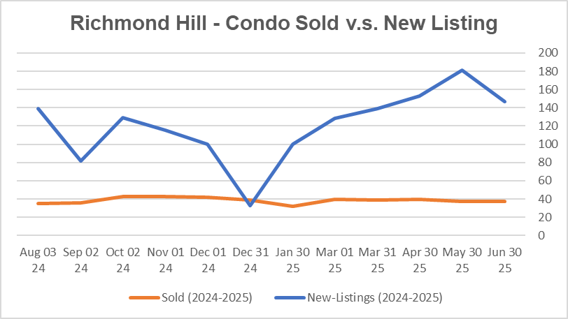 The condo market is a Strong Buyer's Market. It takes an average of 40 days to sell a condo unit in Richmond Hill. The average price was unchanged v.s. last month, down 11.6% from the same month previous year. The new listings were down 18.8% from the previous month, and up 2.1% from the same month last year.