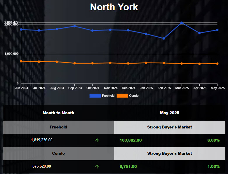 The freehold houses' average price, was up 1.2% from the previous month, down 4.8% from the same month last year. The average time to sell this type of home is around 22 Days. The current month of inventory of houses in North York is about 5.2. Therefore, this segment of housing is currently in a Strong Buyer's Market.
