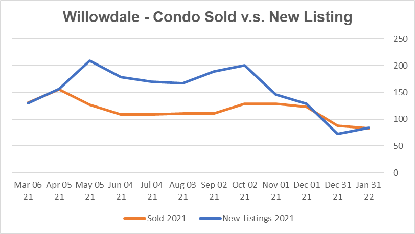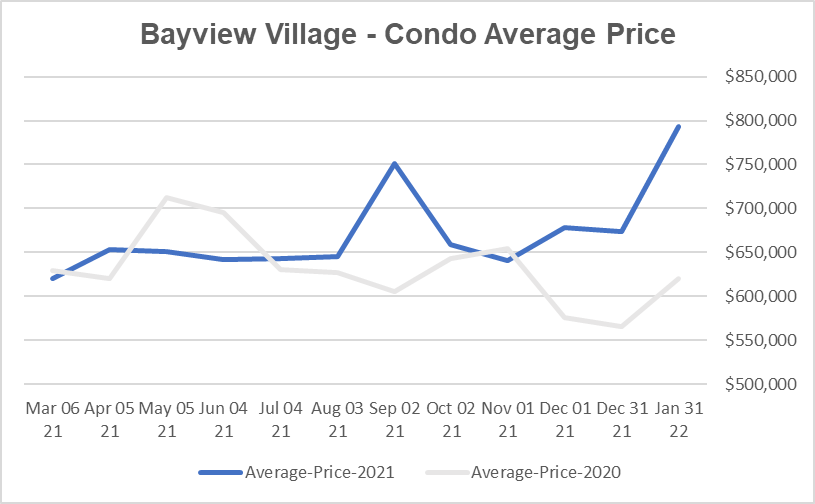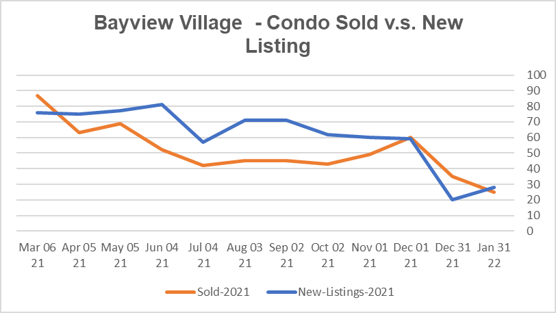 Bayview Village公寓市场目前是强劲卖家市场。公寓平均出售时间是23天。公寓均价同比12月上升17.7%,环比去年1月上升27.9%。新上市房源较12月增加了40.0%,比去年1月下降了58.2%。