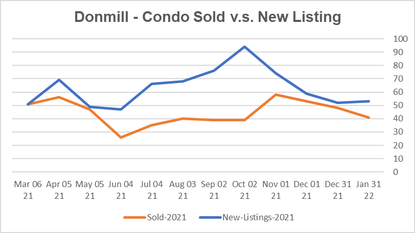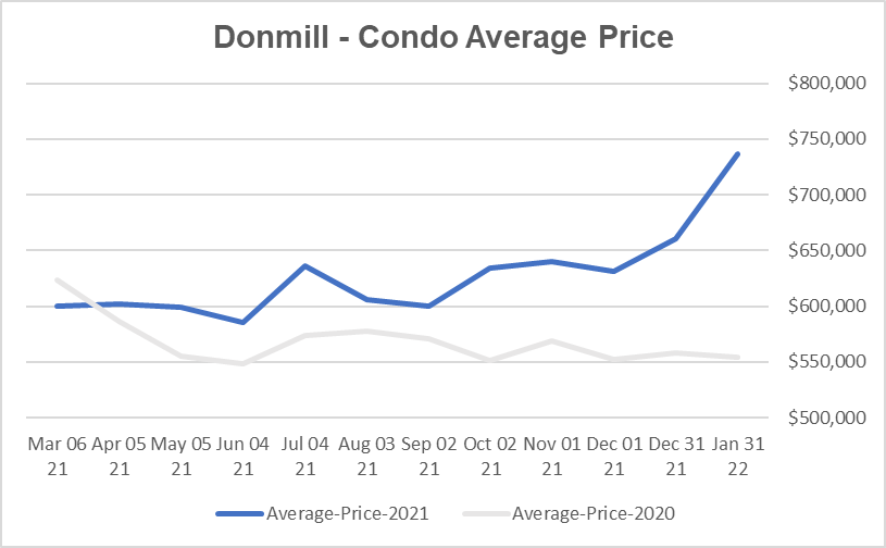 位于Donmill地铁站附近的公寓市场目前是强劲卖家市场。平均出售时间是19天。公寓均价同比12月上升11.6%,环比去年1月上升32.9%。新上市房源较12月增加了1.9%,比去年1月上升了29.3%。 租赁市场租金相对稳定,500尺带车位户型平均租金接近2000加元,目前市场库存量不到一个月。