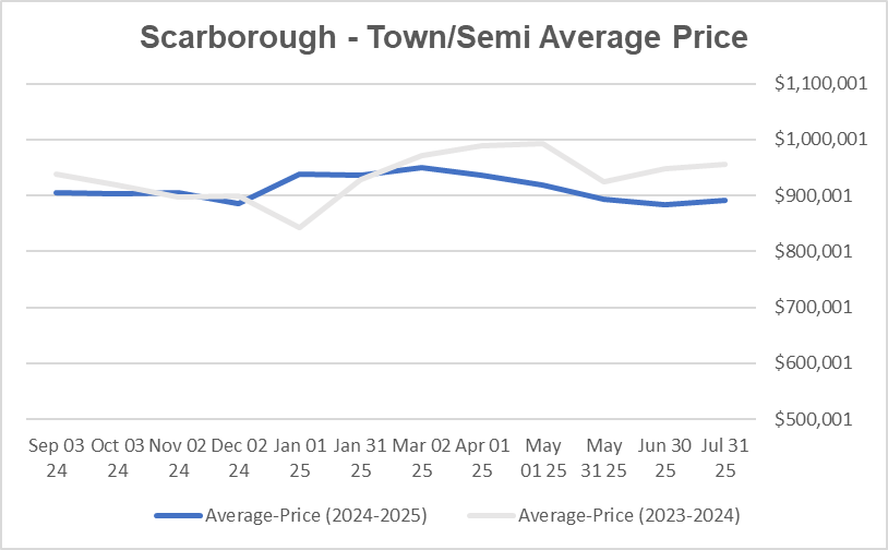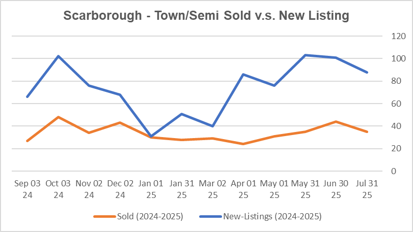 镇屋半独立市场平均价格和6月持平. 较去年7月下跌6.8%, 同类户型平均出售时间为26.9天; 本月士嘉堡该类房屋库存约为3.9。 这部分住房目前处于买家市场。
