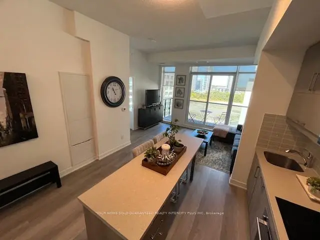 Welcome to the beautiful, luxury condos of Gallery Square in Downtown Markham. This spacious 2 bedroom and 2 bath unit boasts 10ft tall ceilings, stunning floor to ceiling windows and a walk out balcony overlooking the courtyard and green space. Spacious and functional open concept layout makes for a very bright and comfortable area for living and entertaining. Modern cabinetry, vinyl floors throughout, quartz countertops and so many building amenities to enjoy including a fitness centre, yoga rooms, game room, party room and guest suites. Security/concierge, guest parking and easy access to transit and transportation. A short walk to entertainment, dining, and the civic centre. One underground parking spot & one storage locker are included.