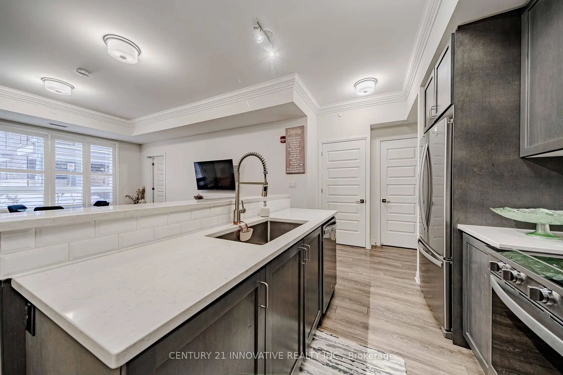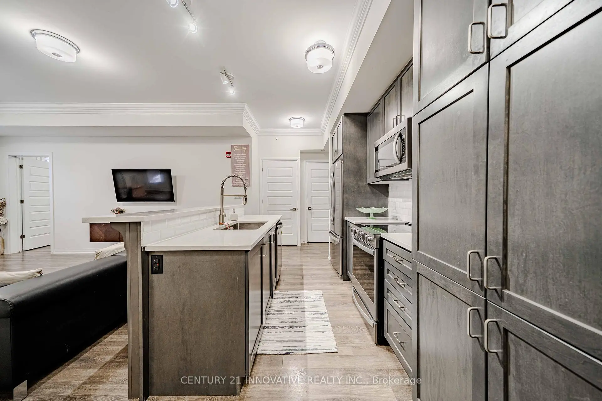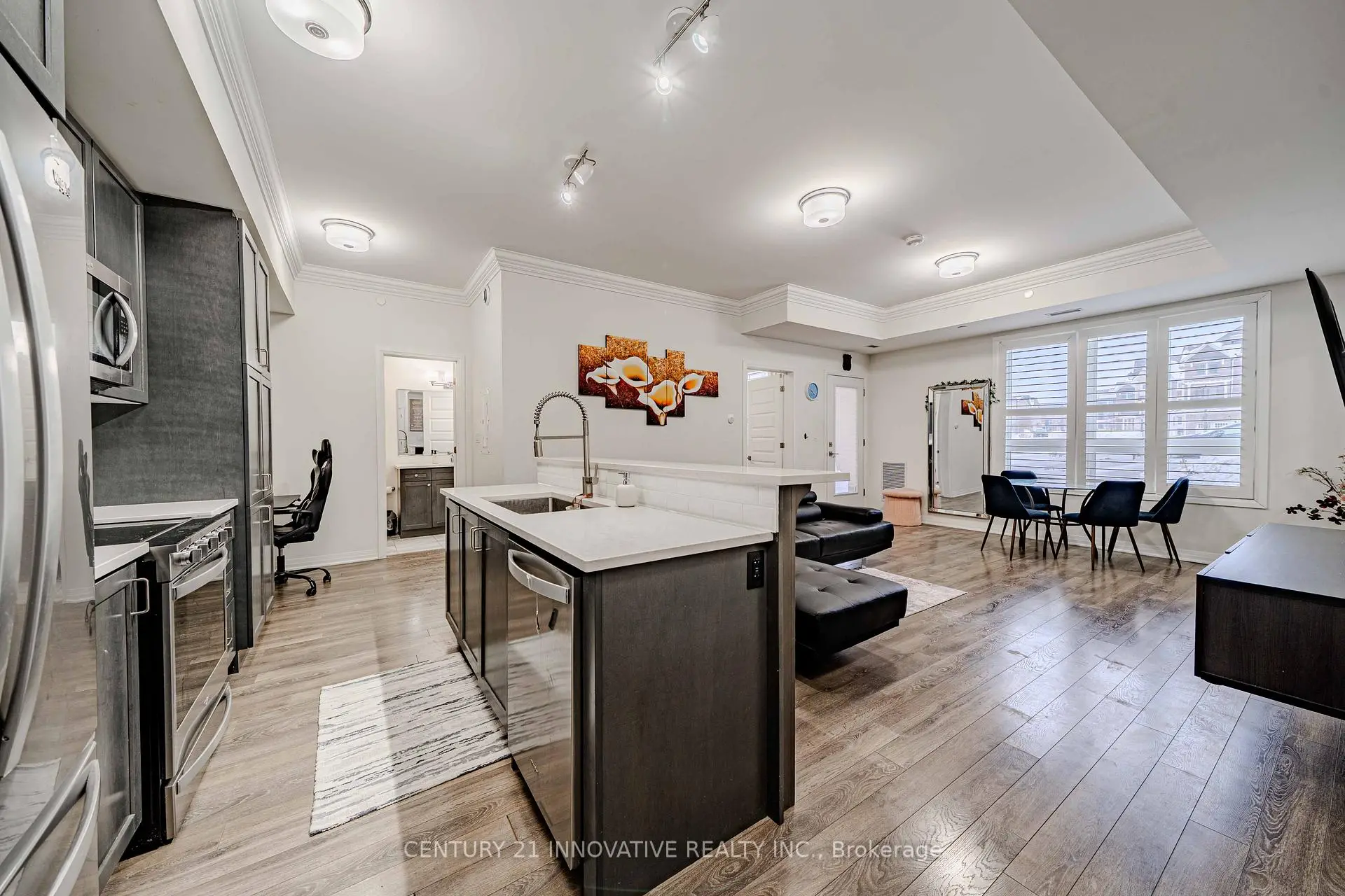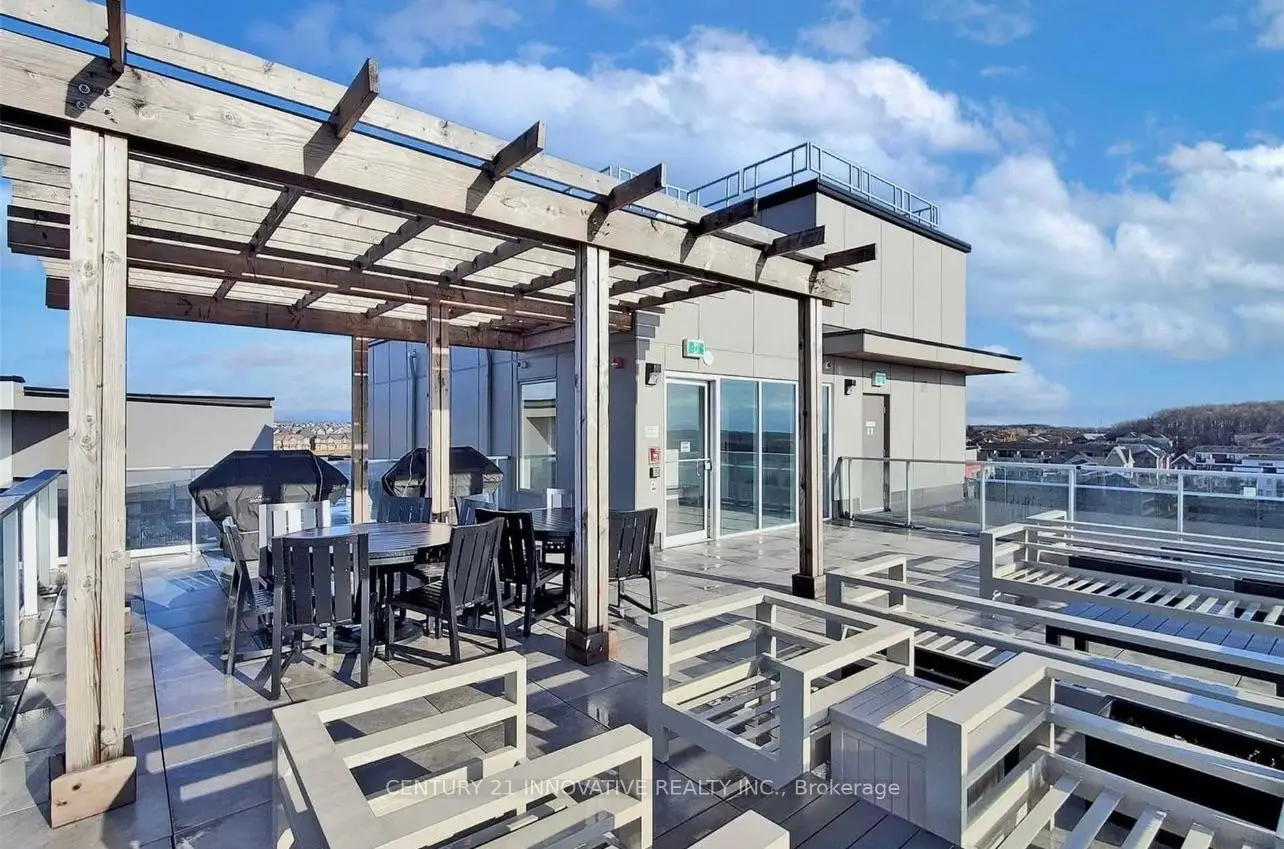 Welcome to the crown jewel of Markham in the highly sought-after community of Cornell, offering this beautifully upgraded 2-bedroom + den, 2 full bathroom home with a stunning open-concept layout designed for modern living. Enjoy a private walkout patio with convenient access to visitor parking, perfect for everyday ease and entertaining. With over $50k in upgrades, this immaculate unit features laminate flooring throughout, smooth 10-foot ceilings with elegant 7" crown moulding, and large windows that flood the space with natural light. The designer kitchen showcases quartz countertops, a large island, ceramic backsplash, single undermount sink, and an oversized custom builder pantry, while the upgraded bathrooms provide spa-like finishes including quartz countertops, raised vanities with extra storage, glass walk-in shower with full-height tile and pot lighting, high-efficiency dual flush toilets, premium fixtures, and large-format stone floor tiles. Additional highlights include a spacious primary bedroom with walk-in closet, custom fitted double-door closet in the second bedroom, California shutters throughout, full-size stainless steel laundry with steamer feature, high-efficiency water heater, and internet included in condo fees. Residents enjoy excellent building amenities including a party room with pool table, fully equipped fitness centre, and rooftop BBQ patio. Includes 1 parking space and 1 locker, all appliances, electrical light fixtures, and window coverings, and is ideally located close to transit, schools, community centre, library, hospital, and parks, offering the perfect blend of comfort, convenience, and upscale community living.