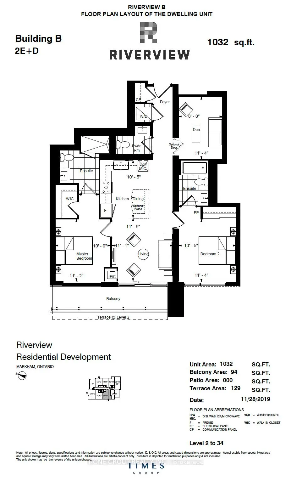 Welcome to Riverview Condos by Times Group, a two-year-new luxury residence in the heart of highly sought-after Unionville. This bright and spacious 1,032 sq. ft. corner unit offers 2 bedrooms plus a large den (ideal as a 3rd bedroom), 2.5 bathrooms, and a functional split-bedroom layout, with each bedroom featuring its own ensuite bath for maximum privacy.Enjoy 9-ft ceilings, an open-concept living and dining area, unobstructed west views with balcony, and quality finishes throughout, including laminate flooring, crown moulding, quartz countertops, and a modern kitchen with built-in stainless steel appliances. The primary bedroom includes a large walk-in closet. Meticulously maintained and move-in ready.This well-managed building features 24/7 concierge, secure smart entry, automated parcel lockers, a two-storey amenity pavilion, fully equipped gym, indoor pool, sauna, yoga room, business centre, library, party/lounge rooms, BBQ rooftop terrace, outdoor park, and ample visitor parking (outdoor & underground).Low maintenance fees include heat, air conditioning, internet , one parking space, and one locker.Located within the top-ranking Unionville High School catchment, and minutes to Whole Foods, LCBO, Downtown Markham, Main Street Unionville, restaurants, cinema, Toogood Pond, GO Station, Hwy 404 & 407, and public transit on Hwy 7.