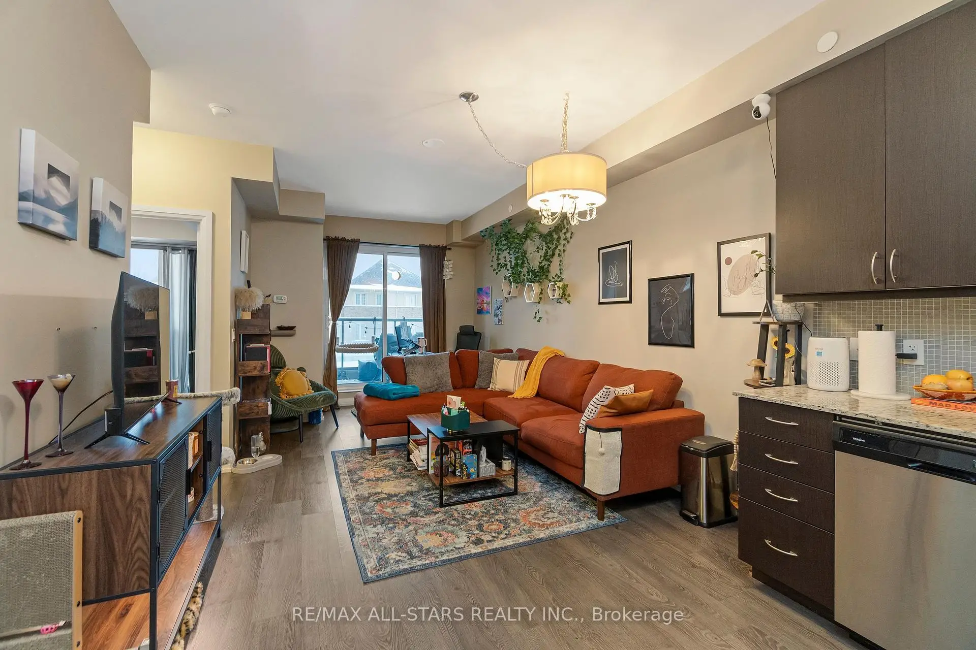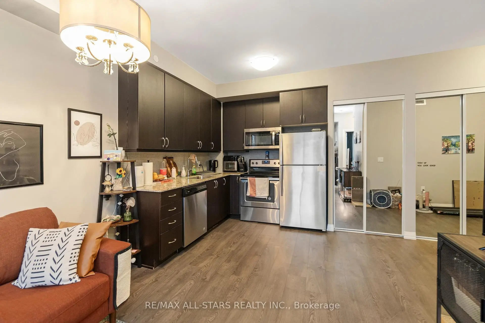 Amazing value in one of Markham's most convenient and walkable locations "The Mark", 221-9560 Markham Rd is the perfect opportunity for a first-time buyer, downsizer or savvy investor looking for lifestyle and long-term potential. Enjoy the ease of walking to the GO Train for a stress-free commute, and spend your weekends exploring Main Street festivals, local restaurants, shops, groceries, pharmacies and the surrounding nature trails just steps from your door. This well-managed boutique building offers concierge service and impressive amenities including a gym, incredible party/media/dining area/games room, guest suite, pet wash, car wash and an amazing rooftop terrace w bbq & outdoor garden area. Inside, the 683 sq ft 1 bedroom + den layout has 9 ft ceilings and is bright, open and highly functional, with a proper entryway that leads into a versatile den seamlessly integrated into the living space - ideal for working from home without feeling confined. The upgraded kitchen features granite countertops, stainless steel appliances and exceptional storage including a built-in pantry and front hall closet. The spacious living area accommodates full - sized furniture and opens to a west-facing balcony with high ceilings and large windows that fill the space with natural light-perfect for enjoying afternoon sun or evening summer cocktails. Laminate flooring runs throughout the main living areas for a modern, low-maintenance finish. The bedroom offers generous closet space, wall-to-wall windows and its own walk-out to the balcony, complete with remote control blinds for added comfort and convenience. One underground parking space and locker (locker: approx 5.9 feet by 2.8 feet) are included, making this an outstanding opportunity in a prime Markham location.