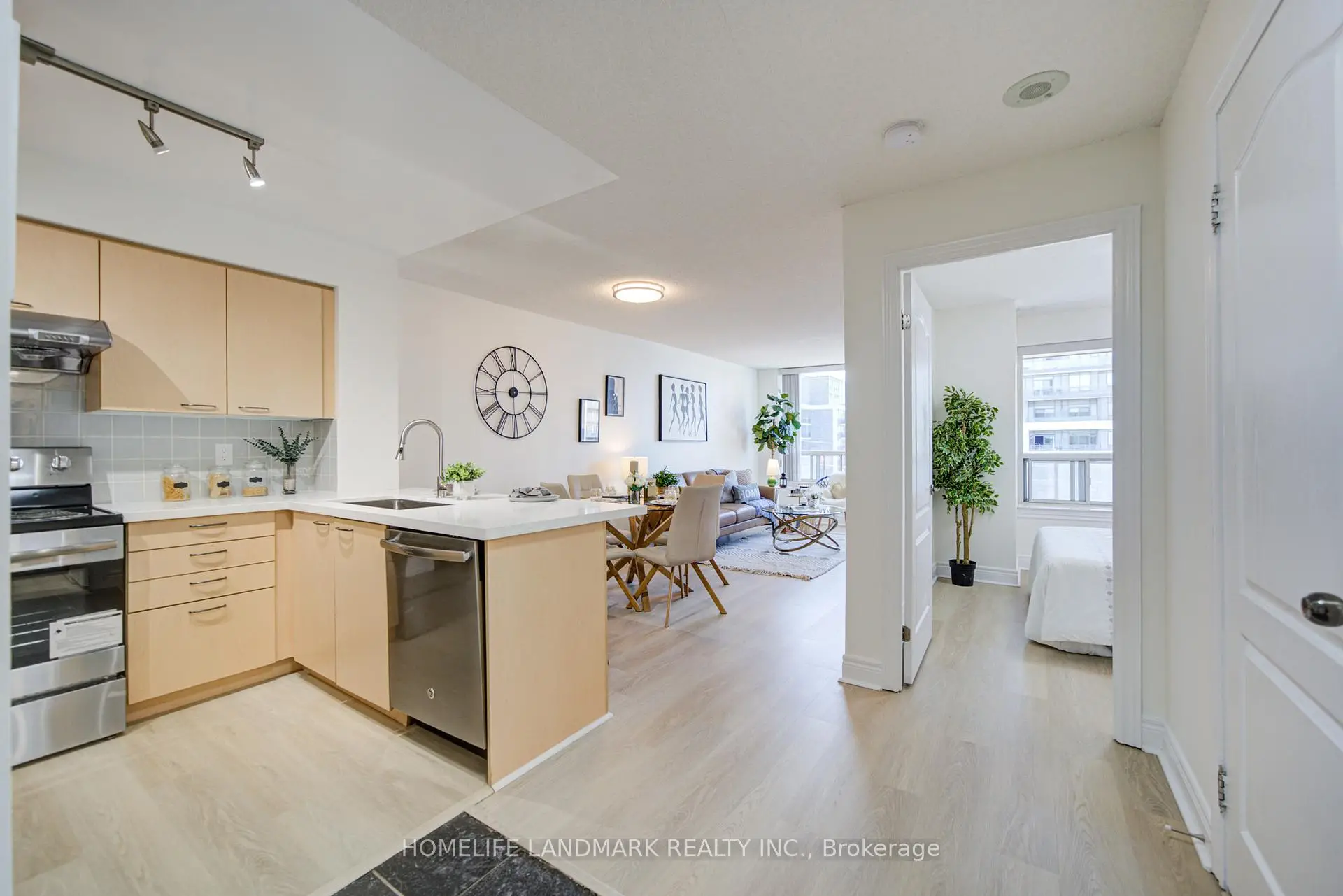 Bright and spacious 1-bedroom suite (605 sq.ft.) at Thornhill Towers in the highly desirable Commerce Valley community. One of the largest 1-bedroom layouts with unobstructed north views and a private balcony. Fully upgraded with brand new laminate flooring, fresh paint, and modern light fixtures. Open-concept kitchen with breakfast bar, brand new stainless steel stove & hood fan, newer built-in dishwasher & fridge (approx. 2 yrs), and new granite countertop & sink. Renovated bathroom with brand new vanity & cabinetry. Unbeatable location just steps to shopping, supermarkets, restaurants, cafes, and public transit including the Viva Rapidway, with easy access to Highways 7, 404, and 407-making commuting effortless.A fantastic opportunity to own a stylish, upgraded home in a highly convenient and vibrant community with endless dining, shopping, and everyday amenities at your doorstep. ***Located in a highly desirable school district with access to St. Robert CHS (IB program) and St. Theresa of Lisieux CHS (Gifted/AP program)***