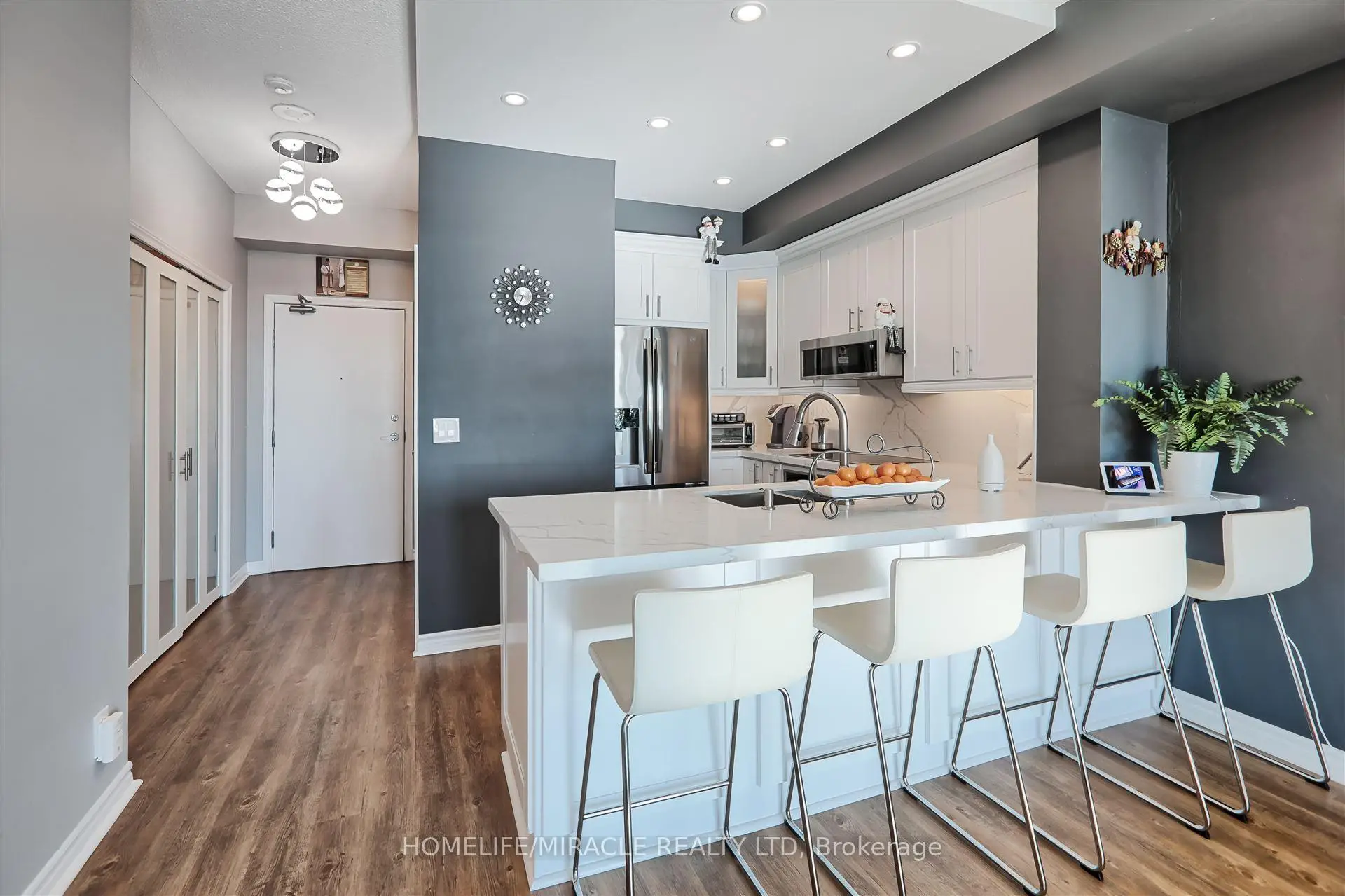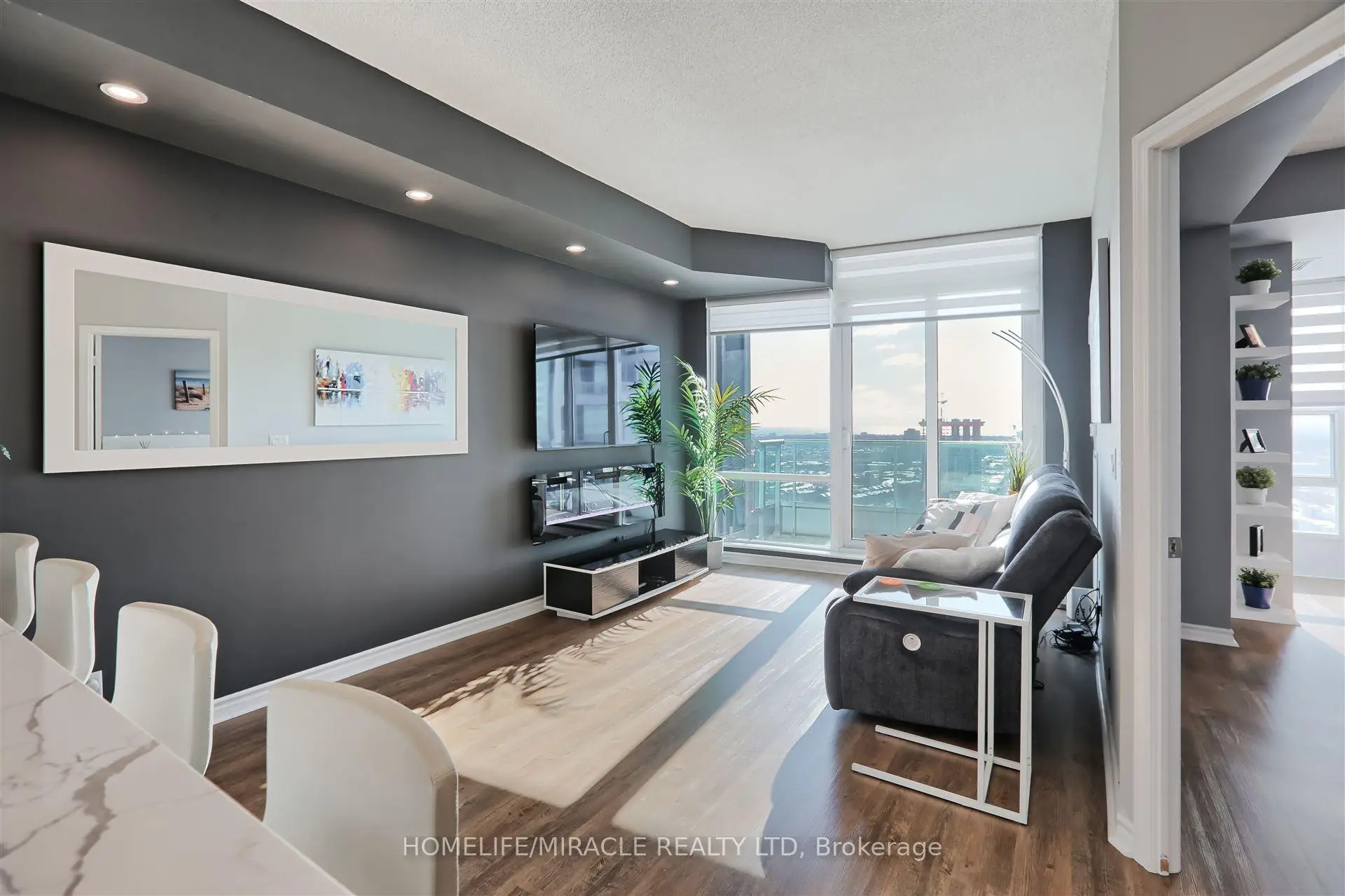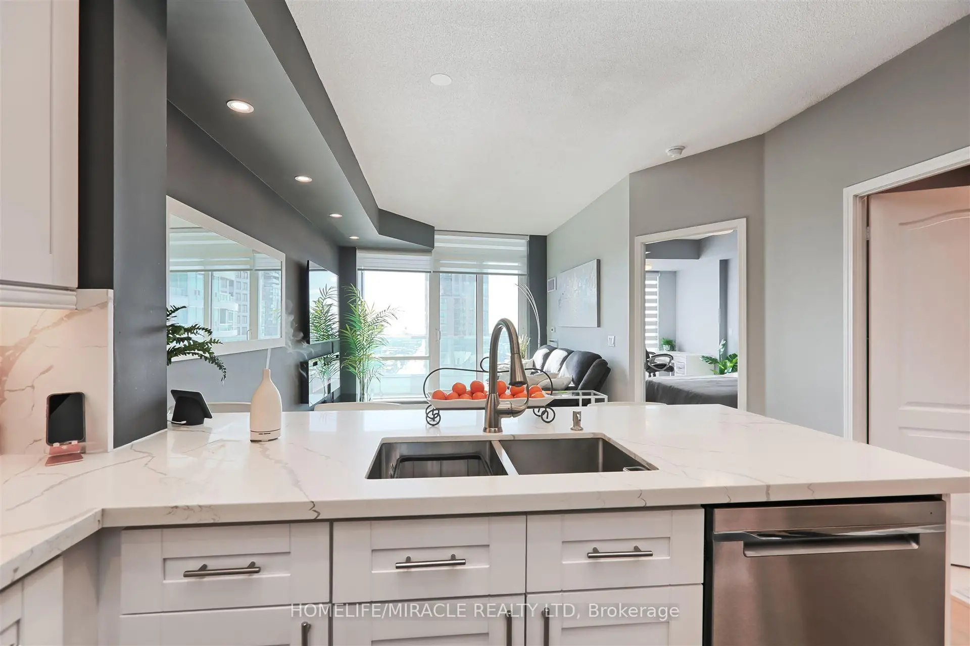 Stunning 1-Bedroom + 2 Den Condo in the Heart of Mississauga. Experience luxury living in this beautifully renovated condo, featuring a spacious layout and modern upgrades. The large den is currently used as a custom walk-in closet but can easily be converted into a second bedroom. Completely renovated in 2020, this unit boasts 9' ceilings, luxury vinyl flooring, and sleek pot lights throughout. The gourmet kitchen is equipped with quartz countertops, a stylish backsplash, a corner cabinet with a Lazy Susan, and a pull-out spice rack. The bedroom includes a generously sized closet with built-in organizers, while zebra blinds add a touch of elegance. Enjoy breathtaking city and lake views, with the added convenience of parking located near the elevator. This building offers 5-star amenities and is just minutes from Square One, GO Transit, and major highways. A must-see!
