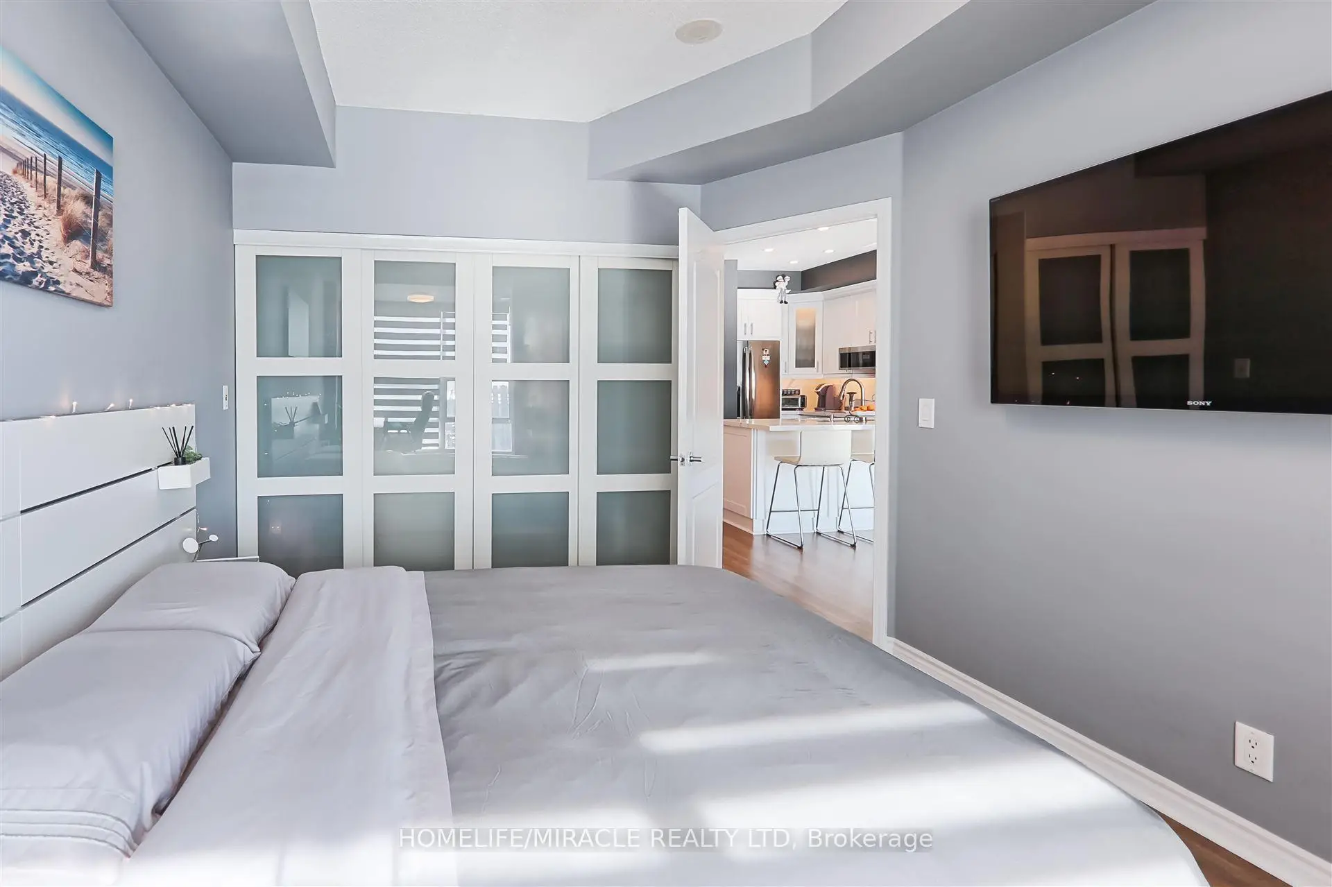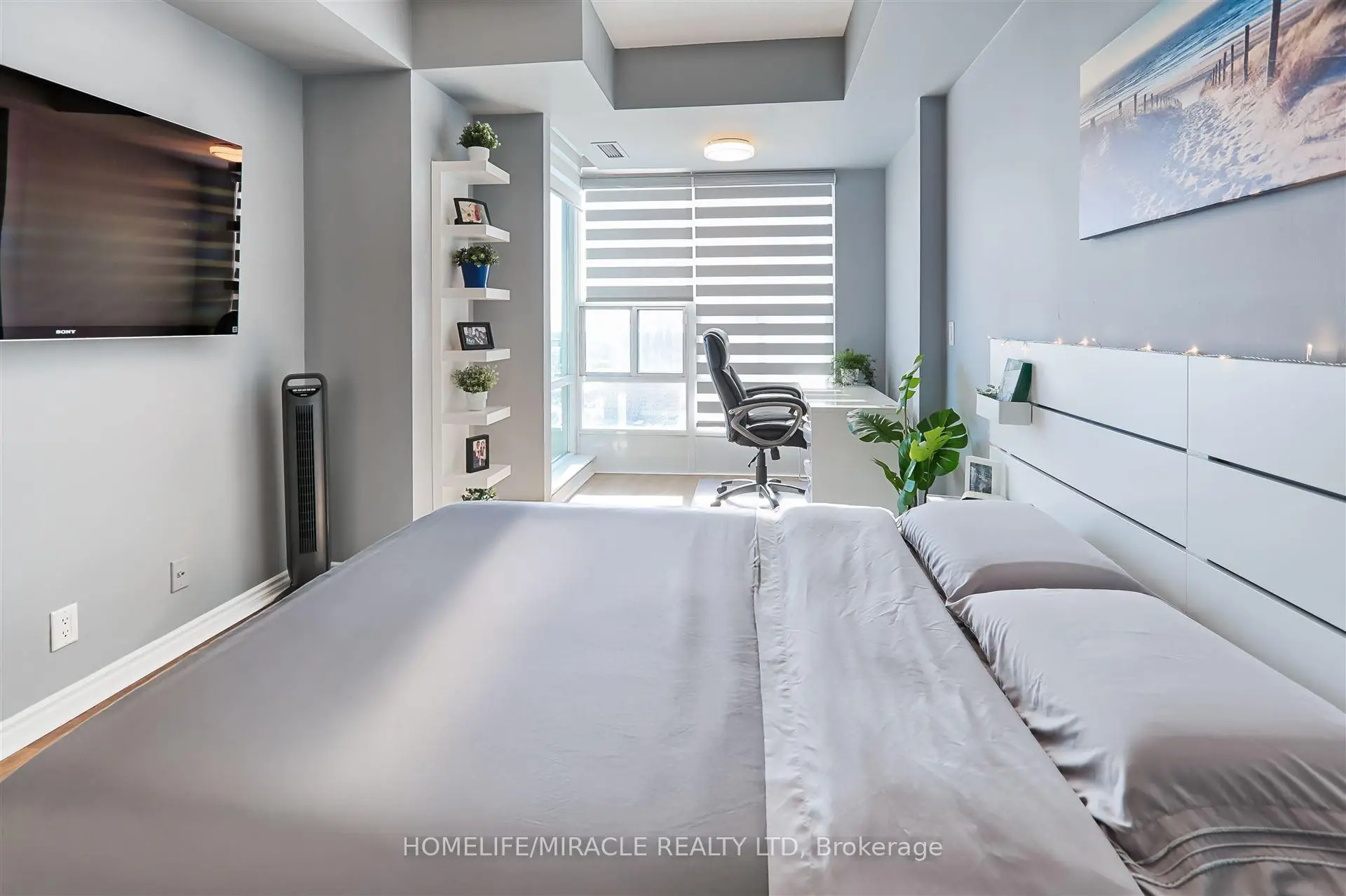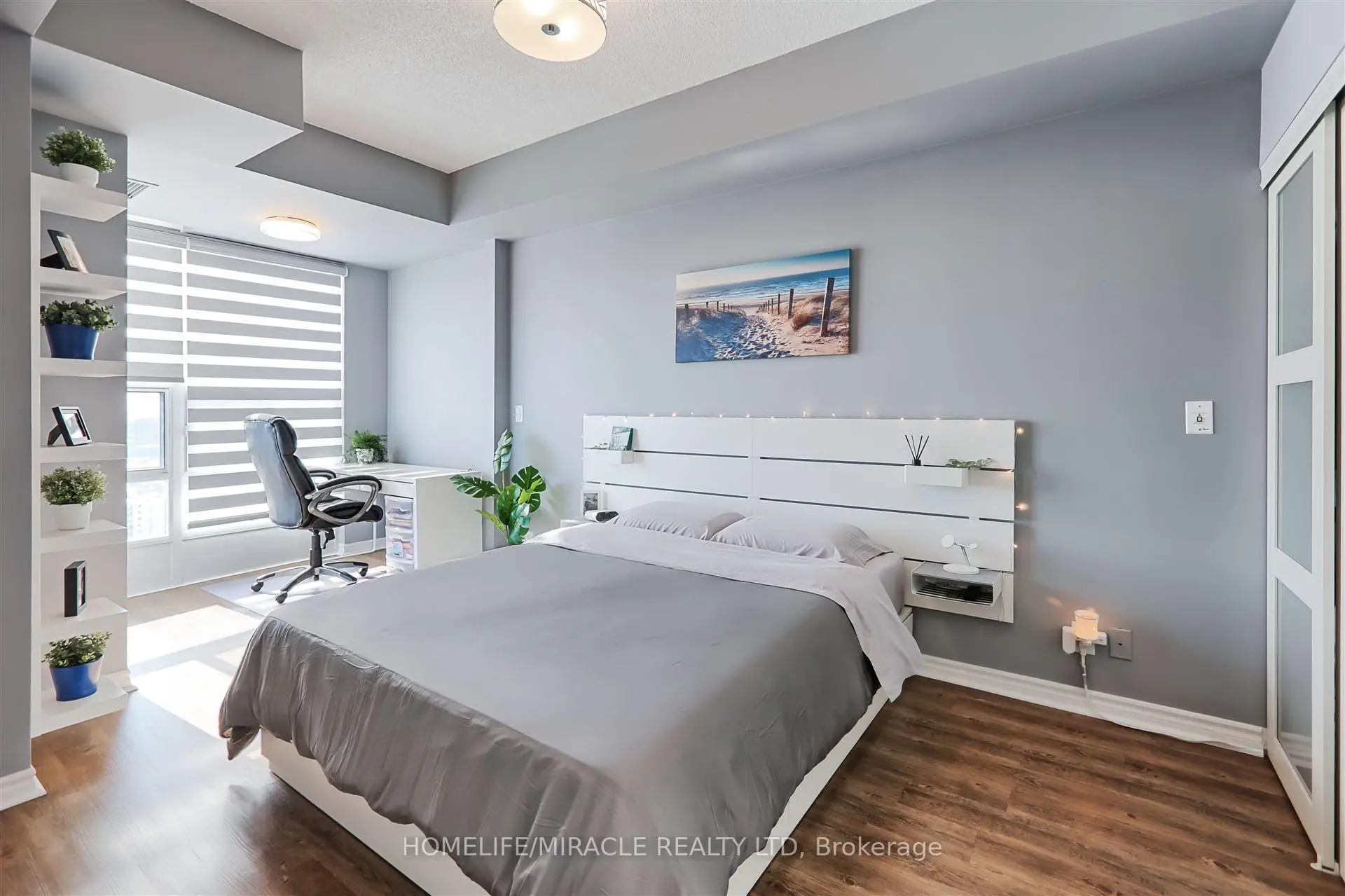 Stunning 1-Bedroom + 2 Den Condo in the Heart of Mississauga. Experience luxury living in this beautifully renovated condo, featuring a spacious layout and modern upgrades. The large den is currently used as a custom walk-in closet but can easily be converted into a second bedroom. Completely renovated in 2020, this unit boasts 9' ceilings, luxury vinyl flooring, and sleek pot lights throughout. The gourmet kitchen is equipped with quartz countertops, a stylish backsplash, a corner cabinet with a Lazy Susan, and a pull-out spice rack. The bedroom includes a generously sized closet with built-in organizers, while zebra blinds add a touch of elegance. Enjoy breathtaking city and lake views, with the added convenience of parking located near the elevator. This building offers 5-star amenities and is just minutes from Square One, GO Transit, and major highways. A must-see!
