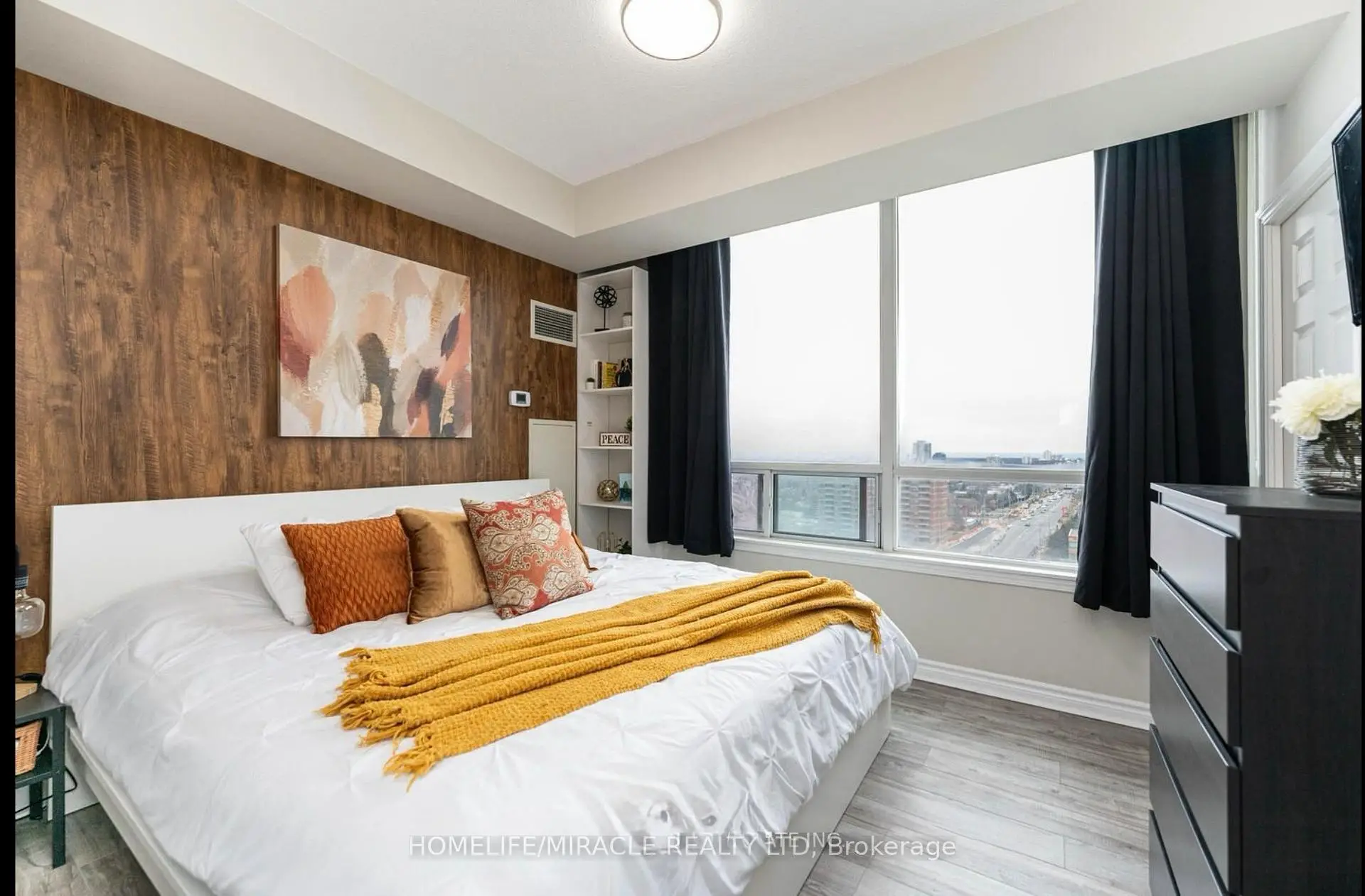 Experience elevated living in this premium south-east facing suite with unobstructed panoramic views of downtown Toronto and Lake Ontario. This spacious 2-bedroom plus sun-filled den, 2-bath residence showcases a highly efficient layout with all rectangular rooms, maximizing usable space and design flexibility. The primary retreat features a fully customized walk-in closet and a spa-inspired 4-piece ensuite. Floor-to-ceiling windows bathe the home in natural light, complemented by 9-ft ceilings and elegant hardwood flooring in the living and dining areas. The bright sunroom/den offers a refined space for a home office or lounge. Thoughtfully upgraded with custom shelving in all wardrobes and bathrooms for exceptional, organized storage.All-inclusive maintenance fees cover heat, hydro (electricity), water, parking, building insurance, common elements, and car wash facilities - enjoy true worry-free living with no extra utility costs. Ideally located steps from Square One Shopping Centre, schools, GO Transit, public transit, and the upcoming LRT, in one of the city's most sought-after urban communities.