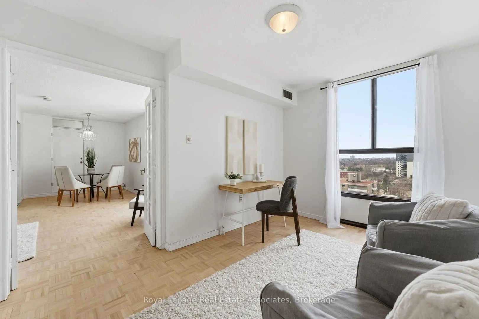 With 1265 square feet, 2 large bedrooms and a huge den graced with double French doors, this spacious and bright unit is just what you've been looking for! The kitchen features modern white cabinetry, stainless steel appliances, ceramic floors, tile backsplash, double sink and lots of storage. Perfect for creating those wonderful holiday meals! The open concept living/dining space features large windows for lots of natural light, warm parquet floors and a walkout to the lovely balcony - a wonderful place to relax at the end of the day. The bedrooms include hardwood floors, big windows and large closets and the oversize den can easily serve as a third bedroom. Both washrooms have been updated with modern finishes, soft-close cabinets and ceramic flooring. There's an ensuite storage room and a massive ensuite laundry room with even more storage space! Public Transit options are plentiful with nearby Cooksville GO, numerous bus routes and the upcoming Hurontario LRT. Easy access to the QEW or 403 and just 16 minutes to Pearson Airport. Trillium Hospital is close by and there are fantastic shopping and restaurant options all along Dundas and Hurontario. Explore the numerous parks and trails in the vicinity, pop over to Cooksville Library for a good read or enjoy skating, fitness and swimming at Mississauga Valley Community Centre. This neighbourhood has everything you and your family need!