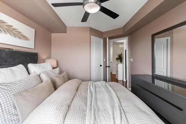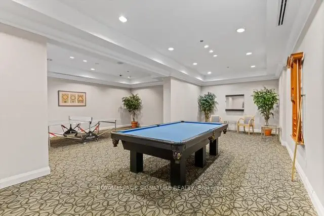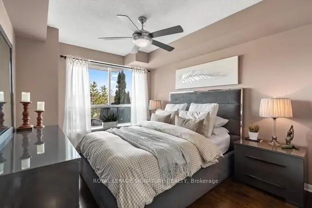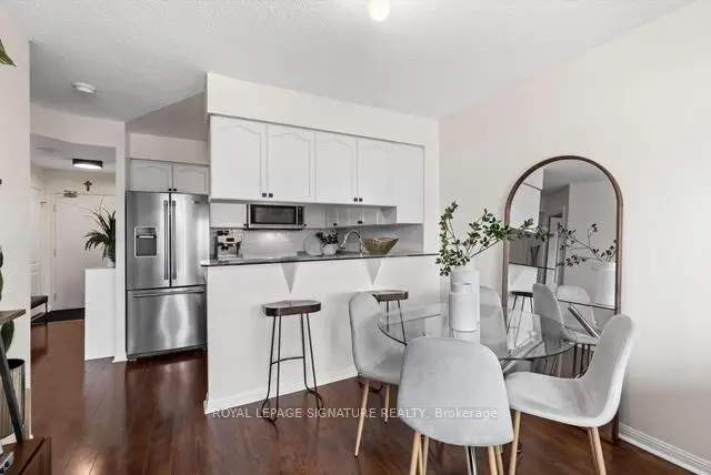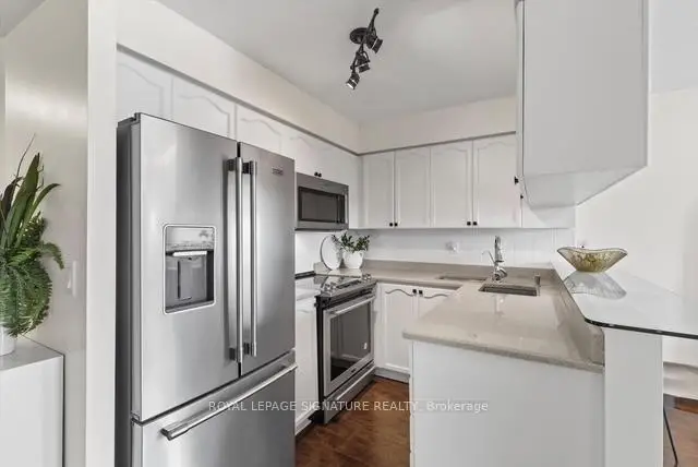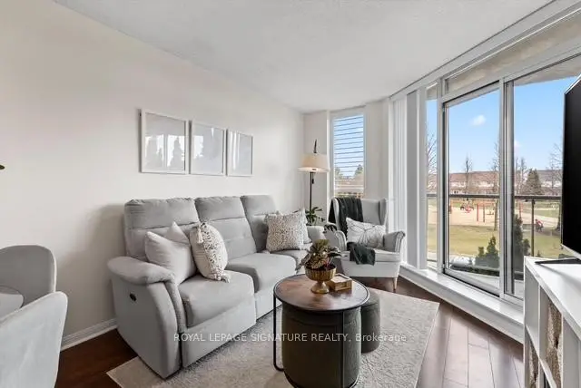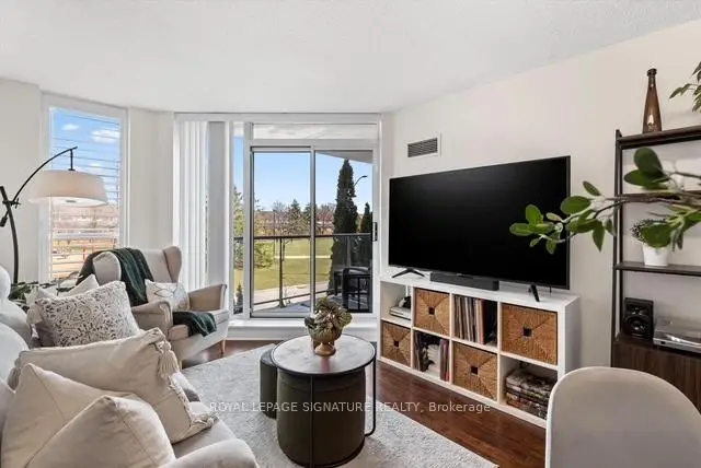 Stunning 1+1 condo in the sought-after Village Terraces, showcasing a bright, carpet-free interior with unobstructed southeast views overlooking tranquil green space. Finished in neutral tones, this sun-filled suite offers a functional open-concept layout, ideal for comfortable everyday living, all tucked away on a quiet cul-de-sac in a family-friendly neighbourhood. The updated kitchen is complete with stainless steel appliances, a reverse osmosis water filtration system, and a convenient breakfast bar, seamlessly connecting to the generous dining and living areas. Step out onto a large private balcony with a natural gas hookup-perfect for outdoor dining or relaxing in the sun. Modern 4 pc bathroom has been tastefully updated. The spacious king-size primary bedroom features a walk-in closet and beautiful southeast views. A versatile den provides the flexibility to be used as a second bedroom, home office or workout space. Enjoy a well-maintained building offering 24-hour concierge service, fitness centre, sauna, party/meeting room, workshop, library, car wash and ample visitor parking. Unbeatable location! Just minutes from Port Credit Village, Lake Ontario waterfront trails and marina, restaurants, shops, excellent schools and Sherway Gardens. Easy access to Port Credit and Long Branch GO, QEW and 427.Additional features include in-suite laundry for everyday convenience, an exclusive locker and separate access to bike storage room at no additional cost. The unit also offers an extra wide parking spot with no adjacent vehicle - spot is equipped for larger vehicles. This unit has lower maintenance fees compared to other similar units in the building-providing exceptional value.