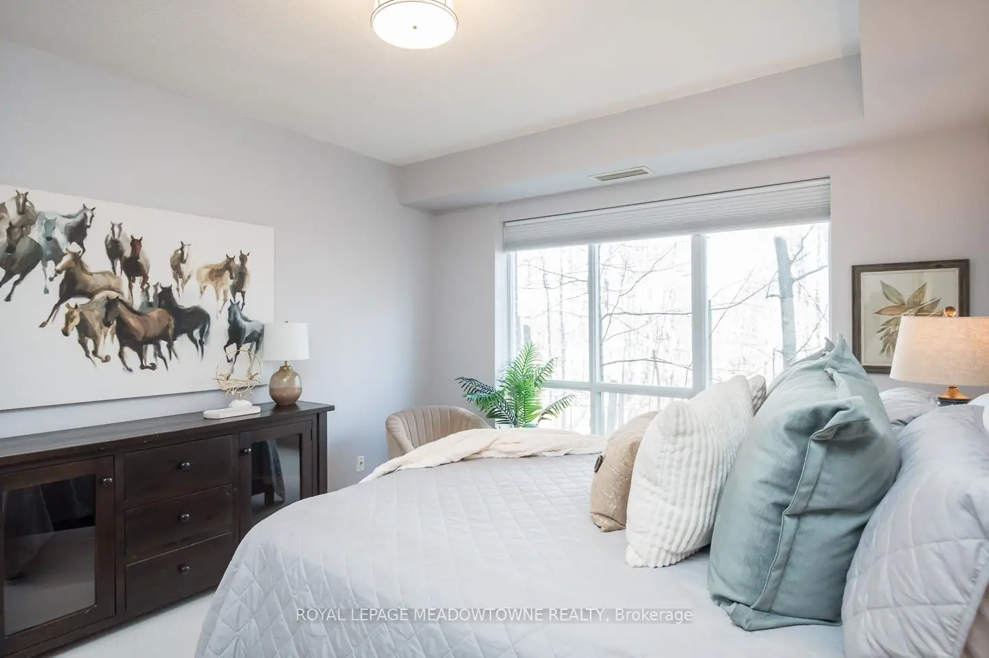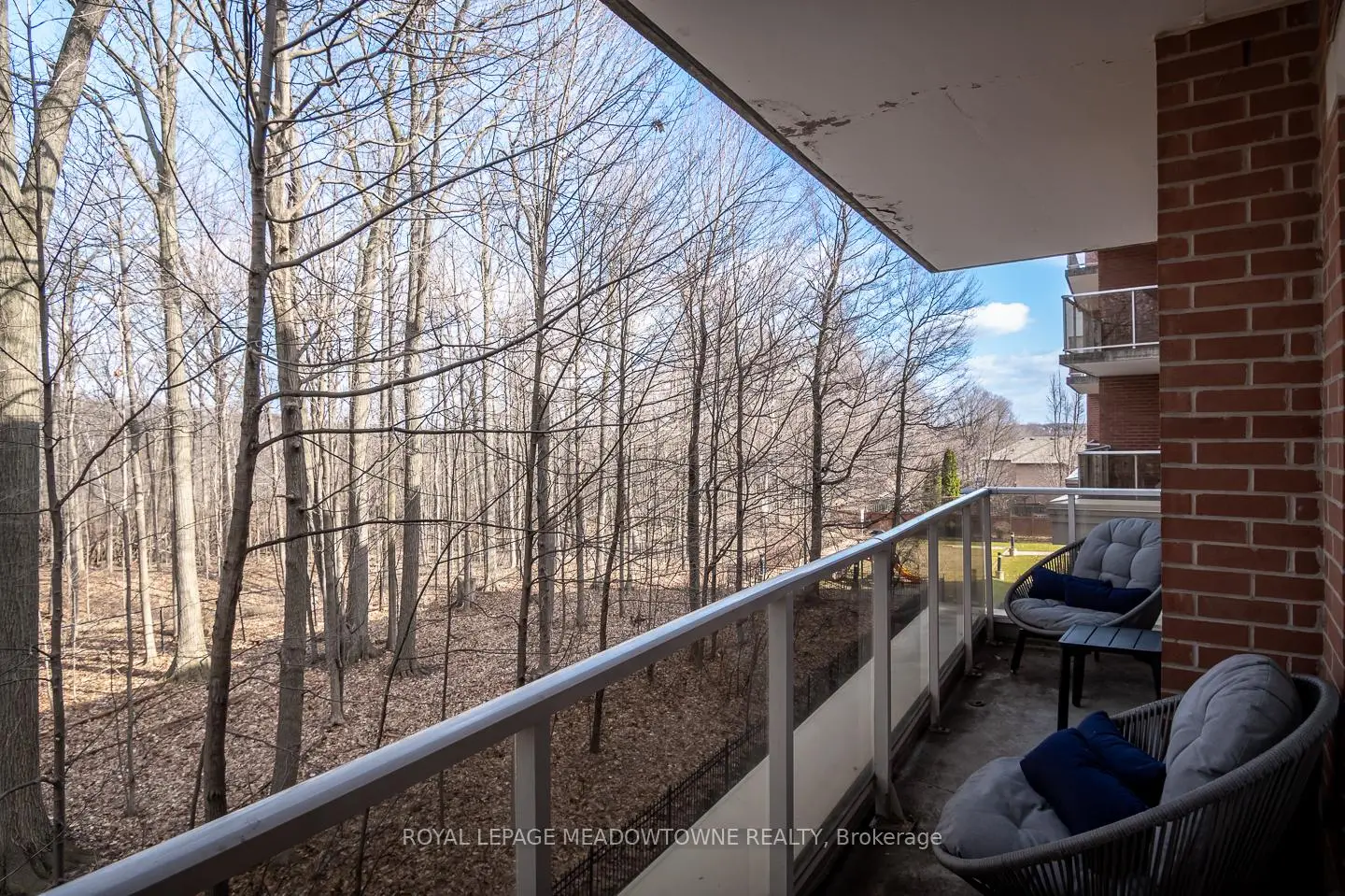 Welcome to this stunning corner unit in the prestigious Woods End Condominiums, ideally located in the sought-after Hurontario neighbourhood of Mississauga. Offering approximately 1200 sq ft of thoughtfully designed living space, this bright and spacious 2-bedroom, 2-bathroom condo showcases beautiful views of the surrounding wooded greenspace. The modern eat-in kitchen features a breakfast bar island, stainless steel appliances, tile backsplash, ample counter space, and direct access to a large private balcony complete with a gas line for BBQs. The open-concept living and dining areas are enhanced with hardwood flooring, upgraded lighting, expansive windows, and a neutral colour palette throughout. The generously sized bedrooms include a primary retreat with a walk-in closet and 4-piece ensuite, along with cozy newly installed carpeting and a large main bath. Enjoy upscale building amenities such as concierge service, guest suites, a party room, and an exercise facility. Conveniently located just minutes from Square One Shopping Centre and the vibrant Heartland area, with easy access to transit, parks, golf, and recreation-this is condo living at its finest.