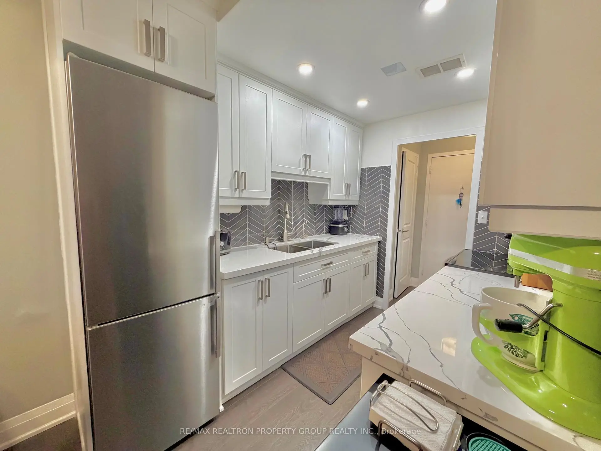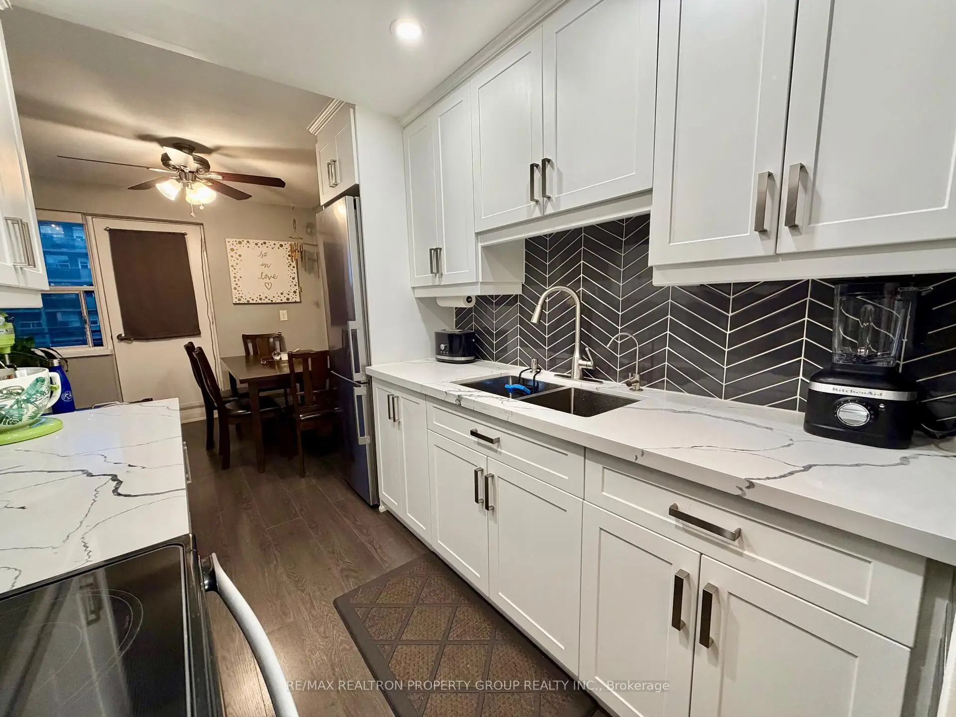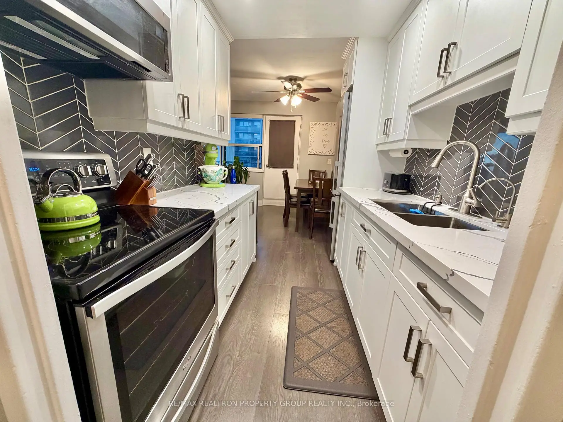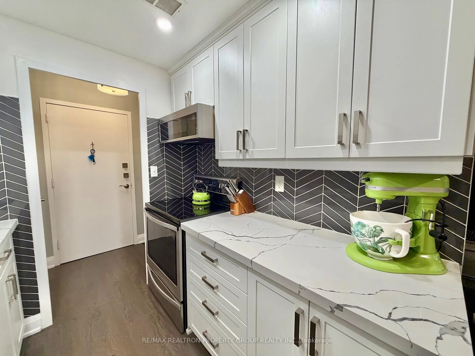 Welcome to Suite 704 at Bloorgate Towers - a beautifully and fully renovated 1-bedroom, 1-bathroom condo offering exceptional value in the established Applewood community. Fully renovated in 2020, this move-in-ready suite features durable laminate flooring throughout, creating a seamless, contemporary feel from room to room.The chef-inspired kitchen boasts white shaker cabinets reaching to the ceiling, quartz countertops, a striking vertical herringbone charcoal tile backsplash, undermount sink, and Whirlpool stainless steel appliances including a bottom-freezer fridge, smooth-top stove, and built-in microwave range. The bright, open-concept living and dining area is generously proportioned and walks out to a private tiled balcony with east-facing open views - ideal for morning coffee, evening relaxation, or entertaining.The spa-inspired bathroom features large-format porcelain tile from floor to ceiling, a frameless sliding glass door, dual-flush toilet, upgraded quartz vanity with modern lighting, and a ventilation fan. The primary bedroom comfortably accommodates a queen bed with ample closet storage. Additional storage includes a dedicated in-suite linen closet and a separate locker room with built-in shelving - a rare offering at this price point. At just $289.88/month, the all-inclusive maintenance fee covers heat, hydro, water, internet, cable TV, home phone, and one surface parking space - delivering some of the lowest carrying costs available for a fully renovated suite anywhere in the GTA. Coin laundry is conveniently located on main floor.Ideally situated steps from transit, shopping, parks, schools, places of worship, and recreation centres. Whether you are a first-time buyer, downsizer, or investor, this fully renovated suite successfully bridges quality and affordability in one exceptional package.