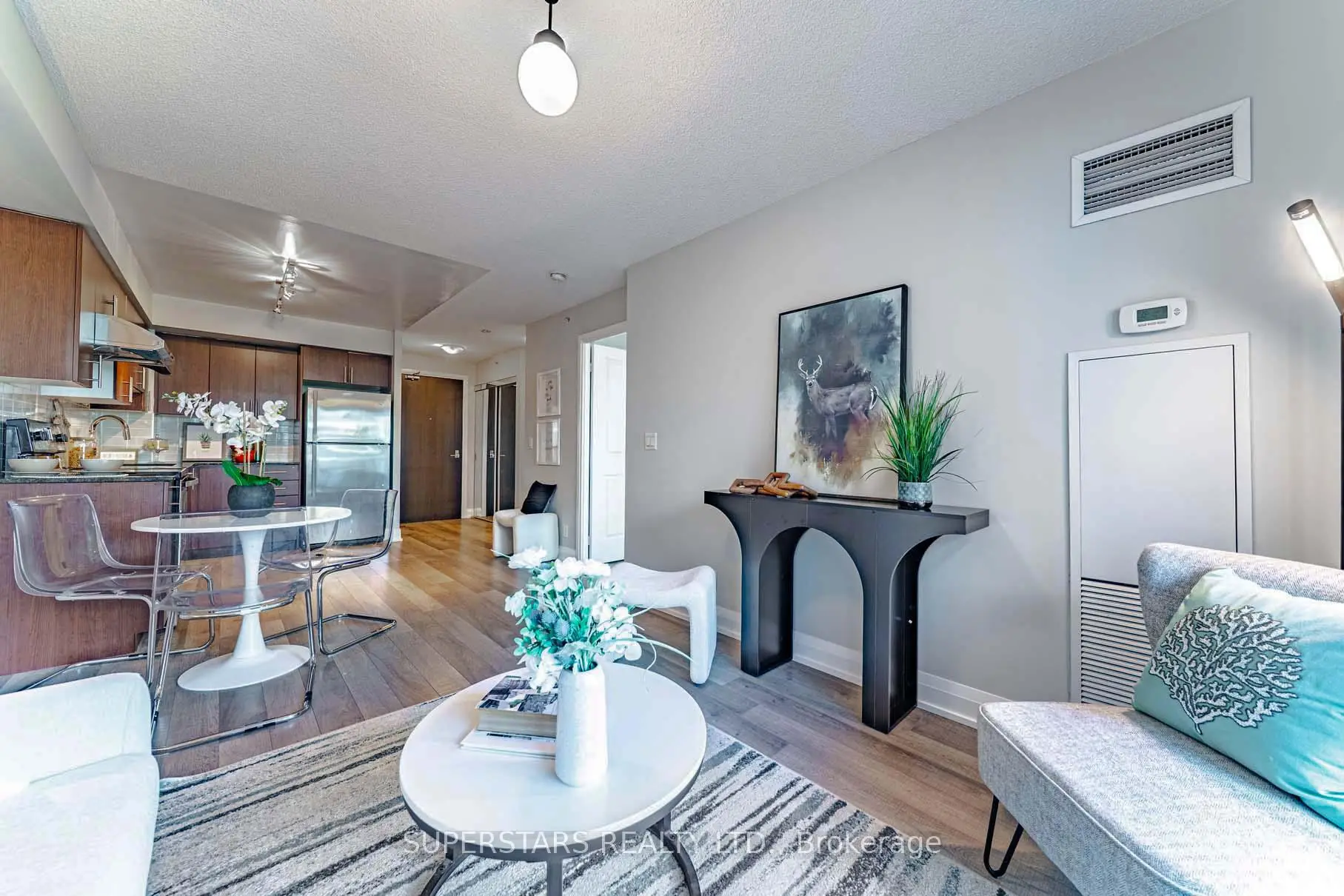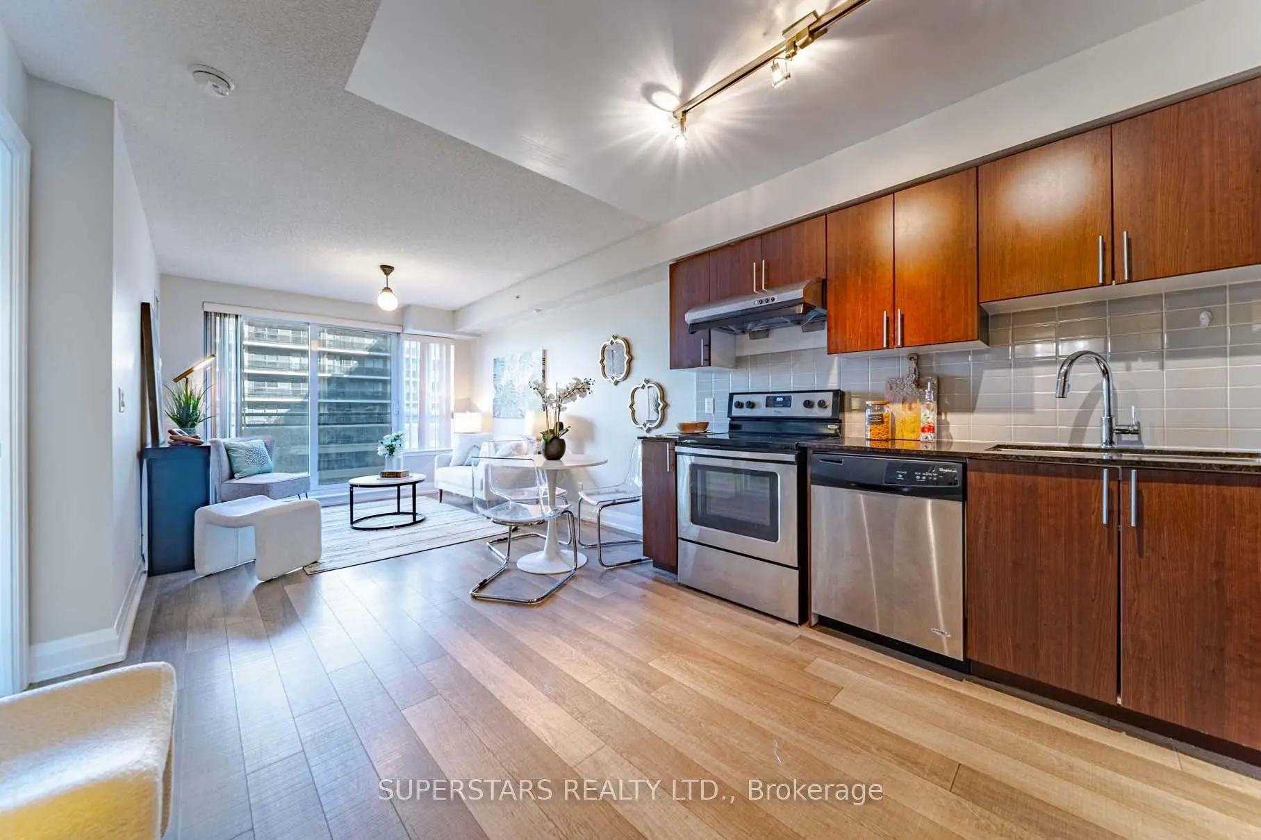 Welcome To This Luxurious 1 Bedroom Condo Offering 555 Sqft Of Living Space Plus A 64 Sqft Open Balcony Overlooking The Quiet Courtyard. Featuring Laminate Flooring And Fresh Paint Throughout, The Open Concept Living And Dining Area Flows Seamlessly To The Private Balcony, Perfect For Relaxing Or Entertaining. The Spacious Kitchen Is Equipped With Granite Countertop, Stainless Steel Appliances And Backsplash. The Generous Size Bedroom Includes A Walk-in Closet For Ample Storage. Steps To Viva Bus Stop And Public Transit, Walking Distance To Restaurants, Shops, Cineplex, And Future T&t Supermarket. Minutes To Highways 404 & 407.