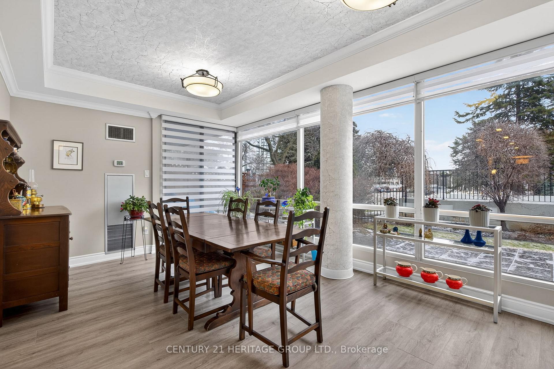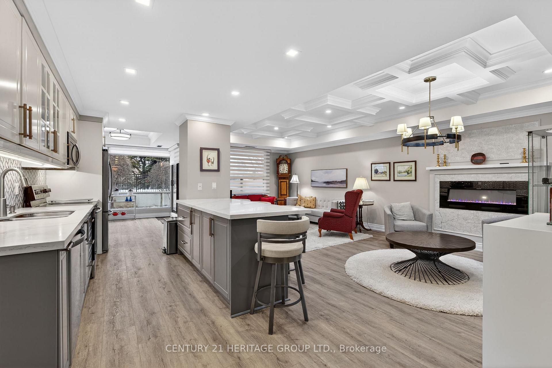 Beautifully & fully renovated throughout with rare outdoor private patio to sit outside, enjoy your garden & have the best of both worlds. This is the biggest unit in the complex at 1445 sq ' w/ luxurious & high end finishes through-out. The open concept style has 9 ' ceilings, crown moulding, coffered & tray ceilings & a fabulous kitchen featuring a huge island, pantry, easy slide drawers w/ brass accents & coriander countertop. You'll find upgraded lighting t-out, tasteful decor & exceptionally remodelled bathrooms. The primary bedroom has a large window, w-in closet & stunning ensuite. The second has a custom built-in Murphy bed w/ side shelves & easily folds away to convert to an office. These quality renovations really shine & it is a completely turn key sun-lit unit. Two fireplaces are nicely placed in Primary & living/dining room area & huge windows across the back look out to your own fully private & nicely landscaped garden patio. Reno's approx 5 years, & all new flooring & paint in 2024. Condo fee covers all heat, hydro, cable & everything except taxes. 2 Parking spaces, a great outdoor area to sit & relax & Recreational facilities that were recently refreshed w/ a very attractive pool area, gym & change rooms. Facilities offer pilates, swimming classes, Zuma, aquafit & yoga. Just a great building all around.