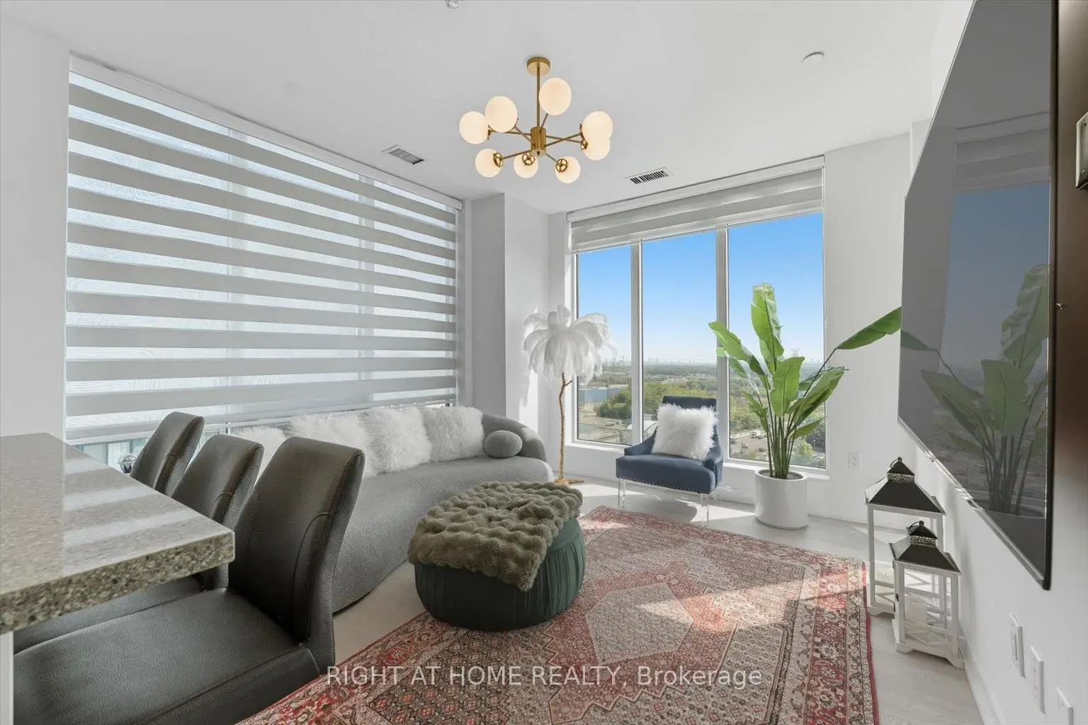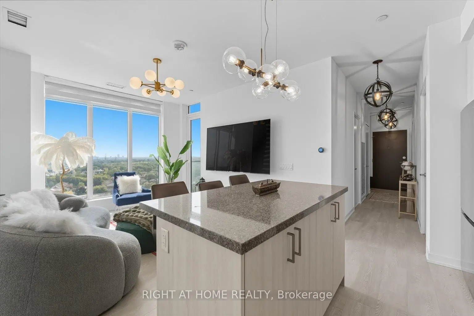 Rare corner 2 bedroom, 2 bathroom suite at Westwood Gardens at Yonge and Highway 7. Premium upper floor tier with upgraded 9 foot high ceilings and fewer units per floor, bright southeast exposure with floor-to-ceiling windows and unobstructed views toward the downtown Toronto skyline. The suite offers light-toned flooring, modern lighting, and upgraded bathrooms throughout. The spacious primary bedroom includes a private ensuite and comfortably accommodates a king-sized bed. The second bedroom is well-sized and ideal for guests, family, or a home office. The kitchen features stone countertops, a functional island with storage, and a modern backsplash. Private balcony with open skyline views. Residents enjoy access to amenities including a fitness centre, indoor basketball court, yoga studio, sauna, party room, and pet spa. Steps to Cineplex, restaurants, shopping, and Yonge Street transit, with easy access to Highway 7, Langstaff GO Station, and the future Yonge North Subway extension.