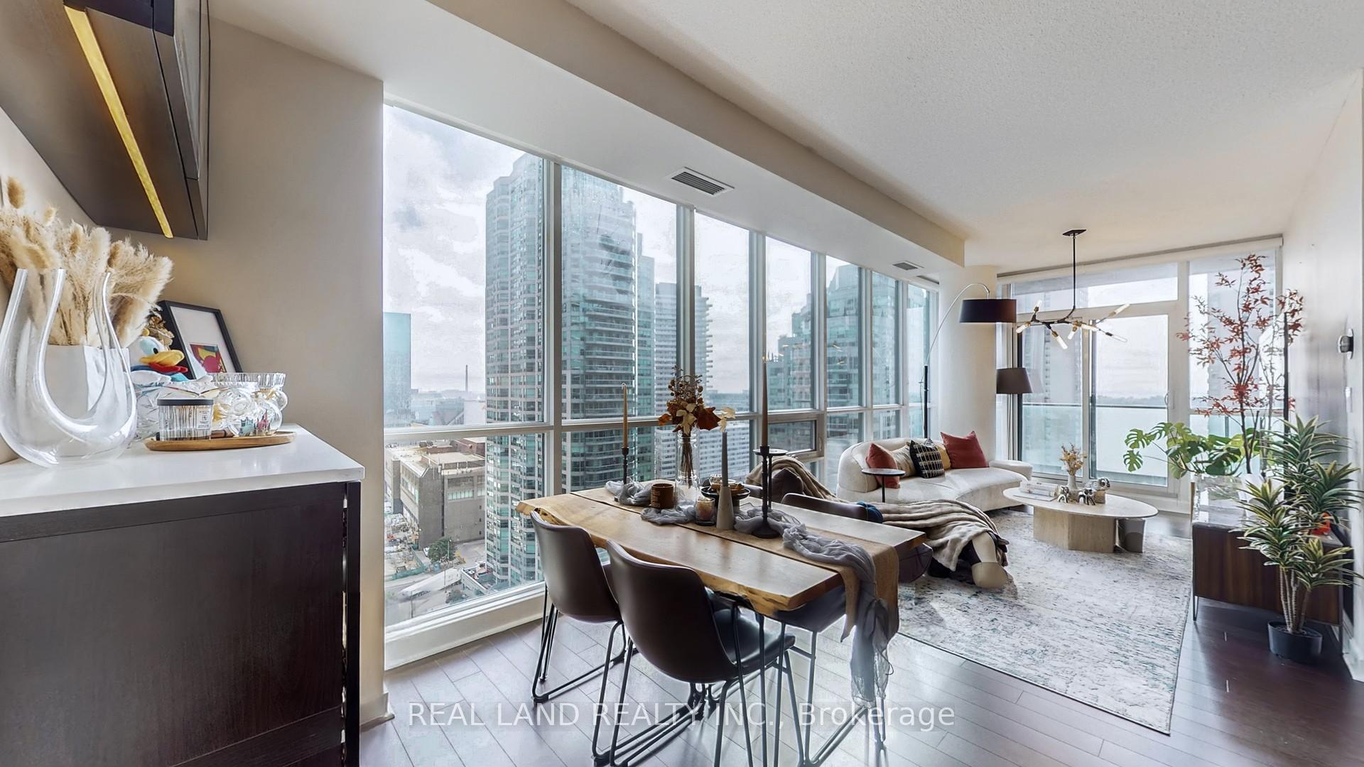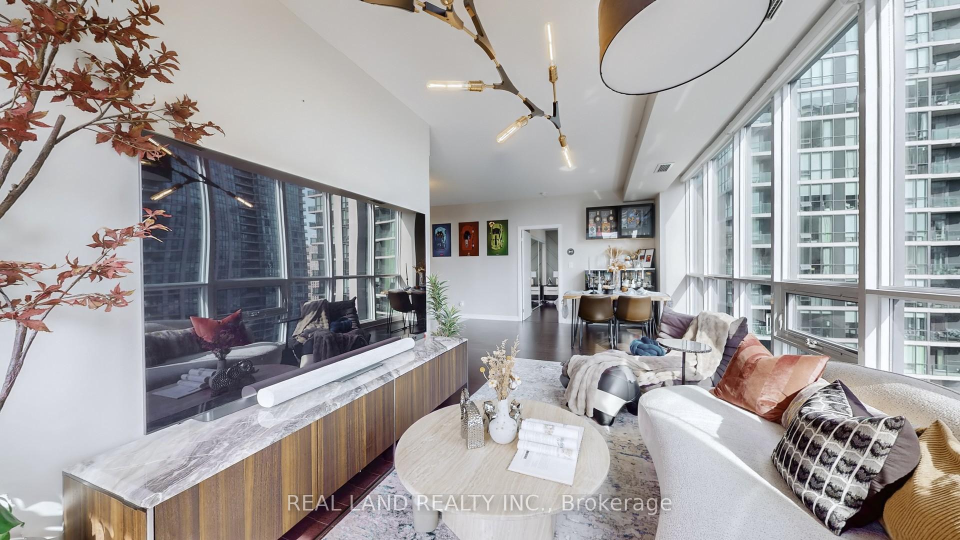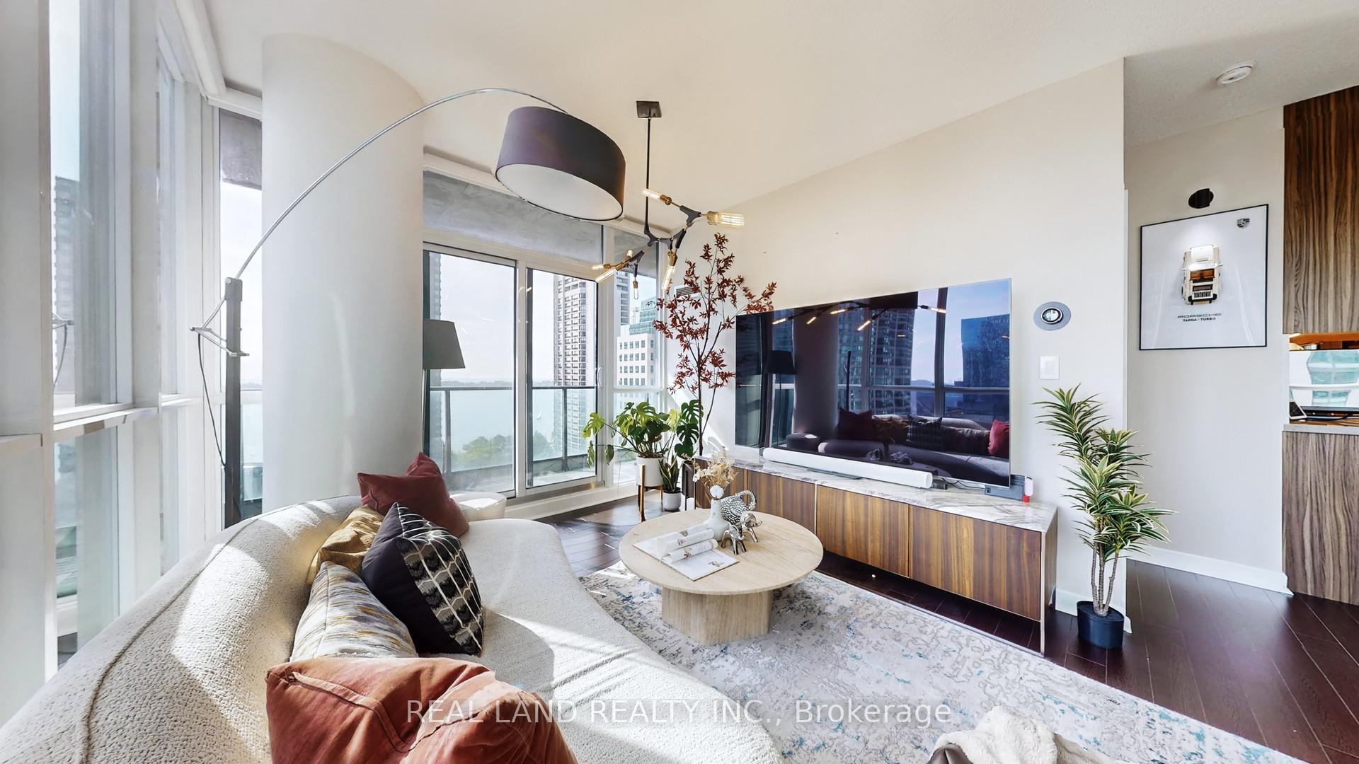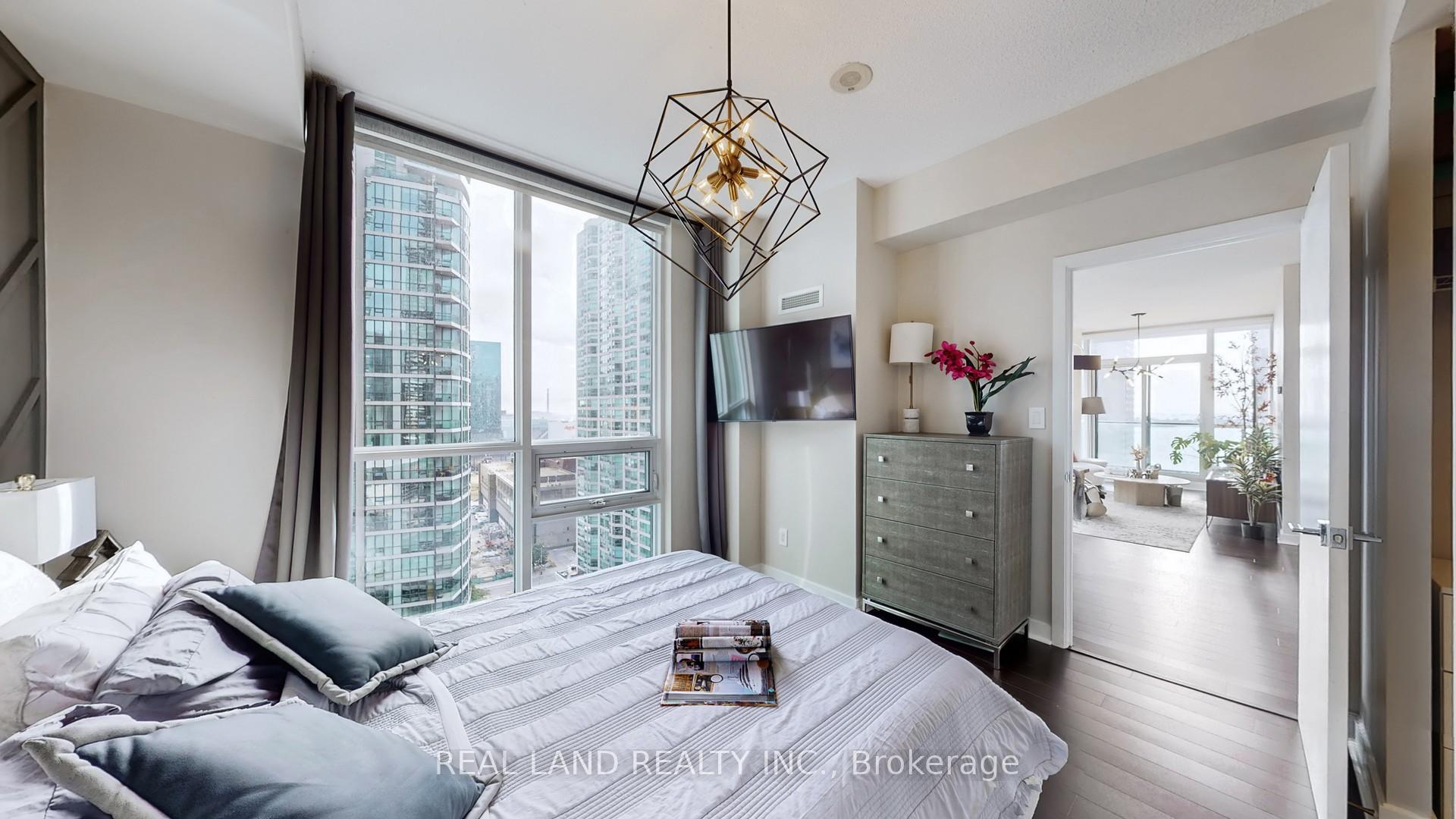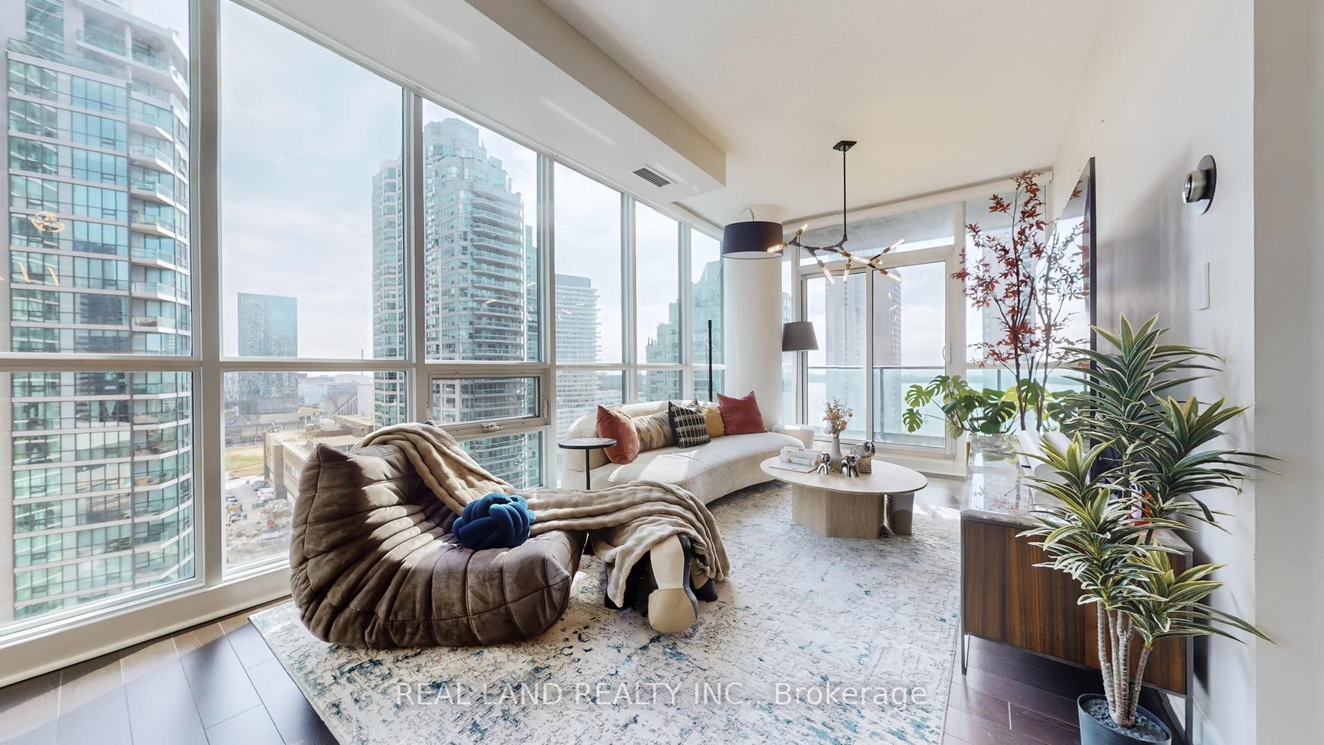 Stylish recently renovated southeast 2+ Den corner unit with stunning Lake and City views with 2 Car Parking and 2 super big Separate Locker Rooms. 9Ft Ceiling. The Huge Floor To Ceiling Windows Through Out The Unit, Very Bright & Functional Layout. South east lake view living room can enjoy this water view everywhere, 105 Sf lake view large balcony give you the ultimate outdoor relaxation area. Modern kitchen W big island, high end Bosch Stainless Steel Appl, with a dedicated space for your culinary arts. Two split bedrooms layout provides excellent privacy. Smart Lighting System. Living Room, Master Bedroom and 2nd Bedroom Electric curtains installed in 2022. One Tandem Parking (can park 2 vehicles). Two super big Separate Locker Rooms(14'X6' and 9'X7') behind the parking spot, you can put everything in the Lock Rooms. Parking and Lockers are closed to the elevator. Steps To Union Station, Subway, Harbour Front, Port To Central Island, Parks & Shopping, 5-Star Amenities: A huge GYM, A 70'Lap Large Indoor Pool, Tennis Court, Squash/Raquet Ball, guest suites & More, too many things to list.