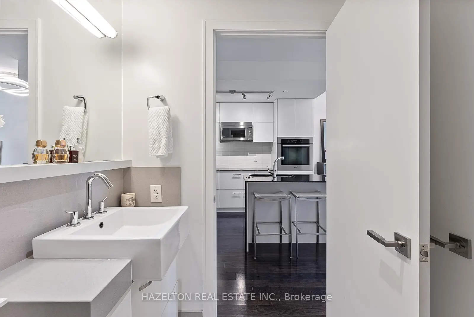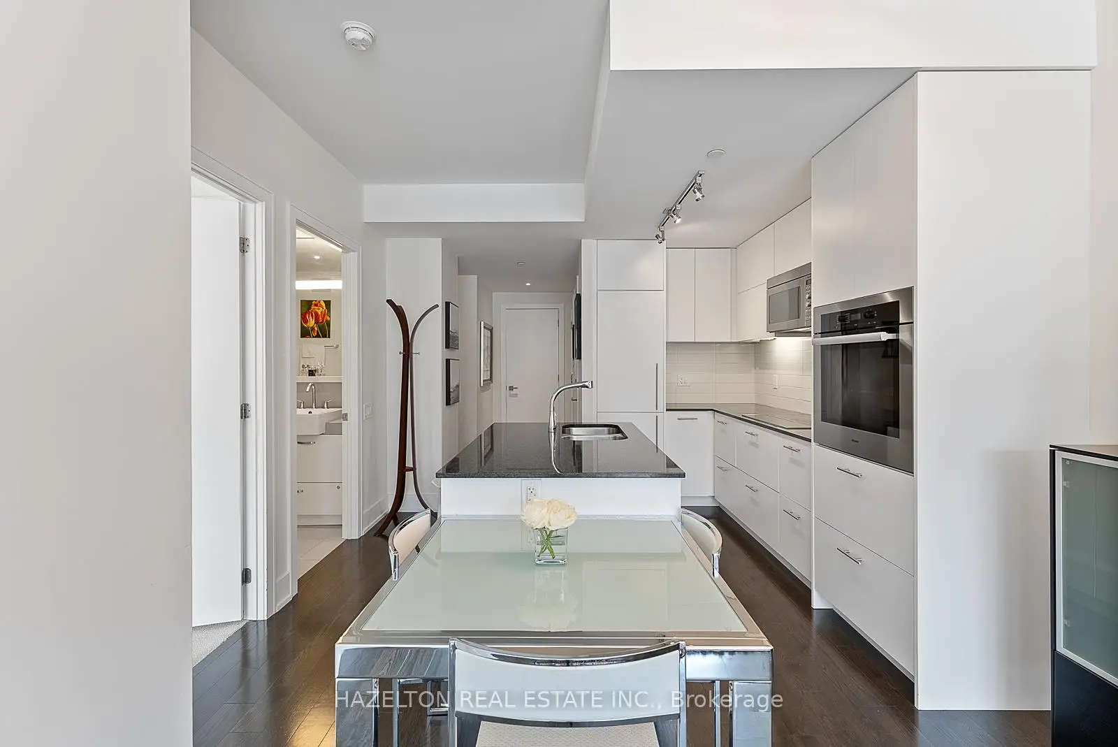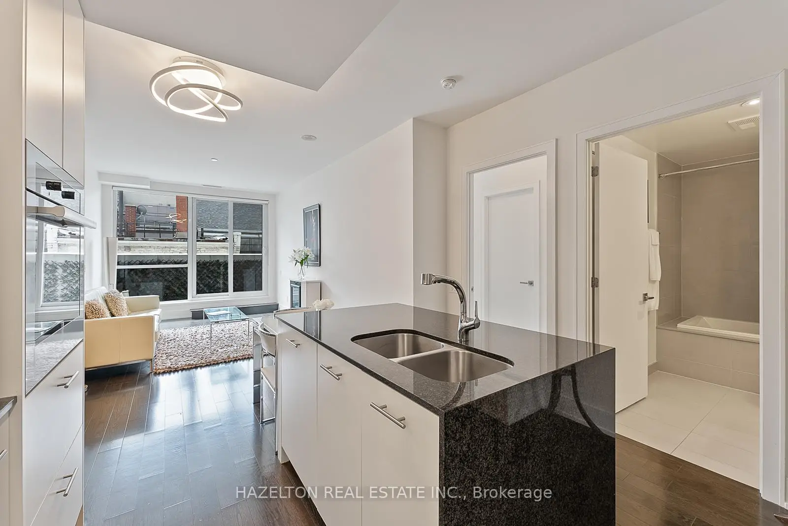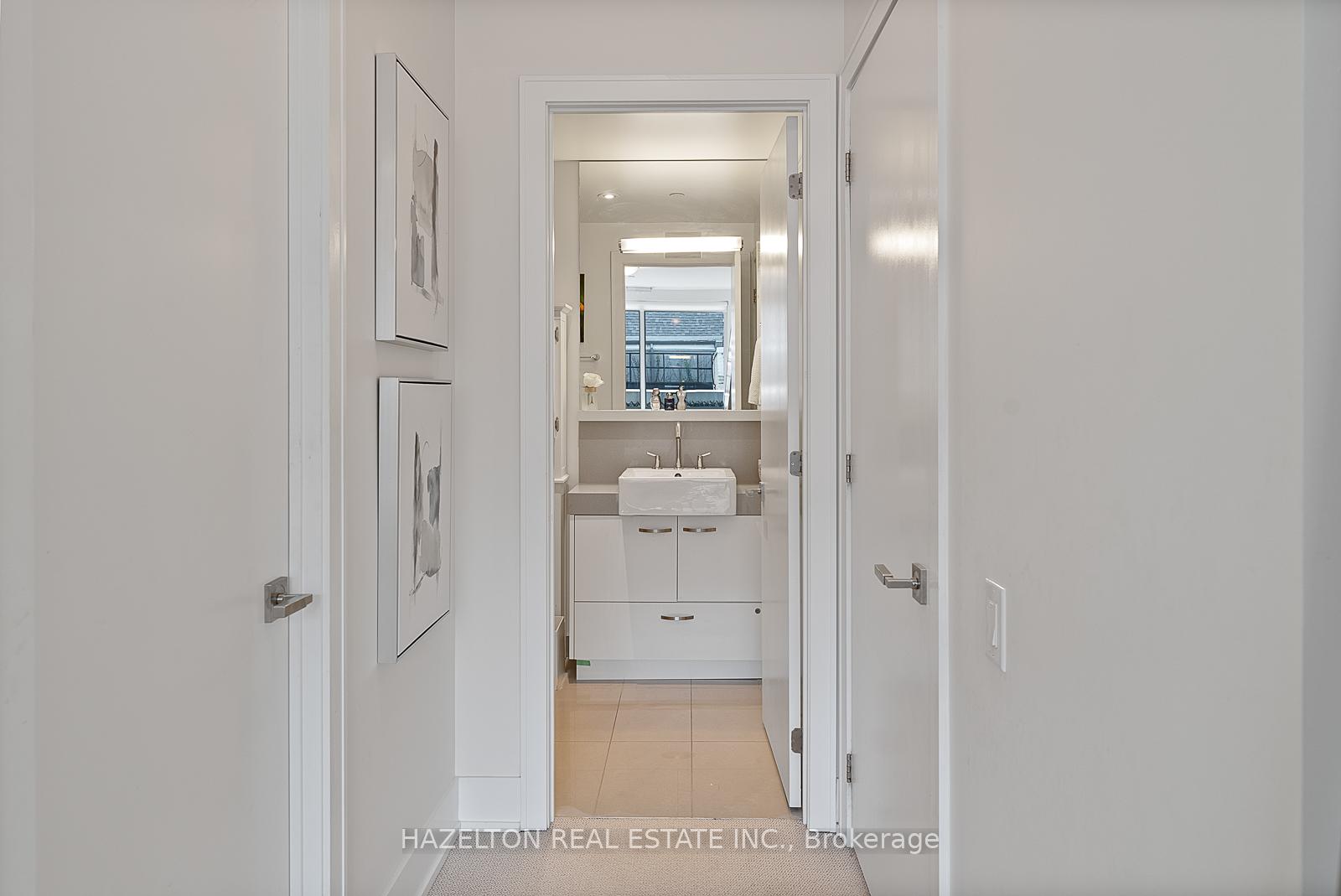 Fabulous Pears, at Ave and Dav. Perfectly sized (838 sq ft) with tall floor to ceiling south facing windows. Generously sized open concept living/dining provides lots of room for entertaining and a walk out to the long private oversized terrace. Light and bright. Modern open concept kitchen with integrated appliances and a centre island with stone countertops. Separate den, could be the ideal home office or media room. Wonderfully sized bedroom with walk in closet and spa like 4 piece bath. Hardwood floors throughout. Immaculately kept, move in ready. One of the best buildings in the area with outstanding 24 hour concierge service. See floor plan attached.