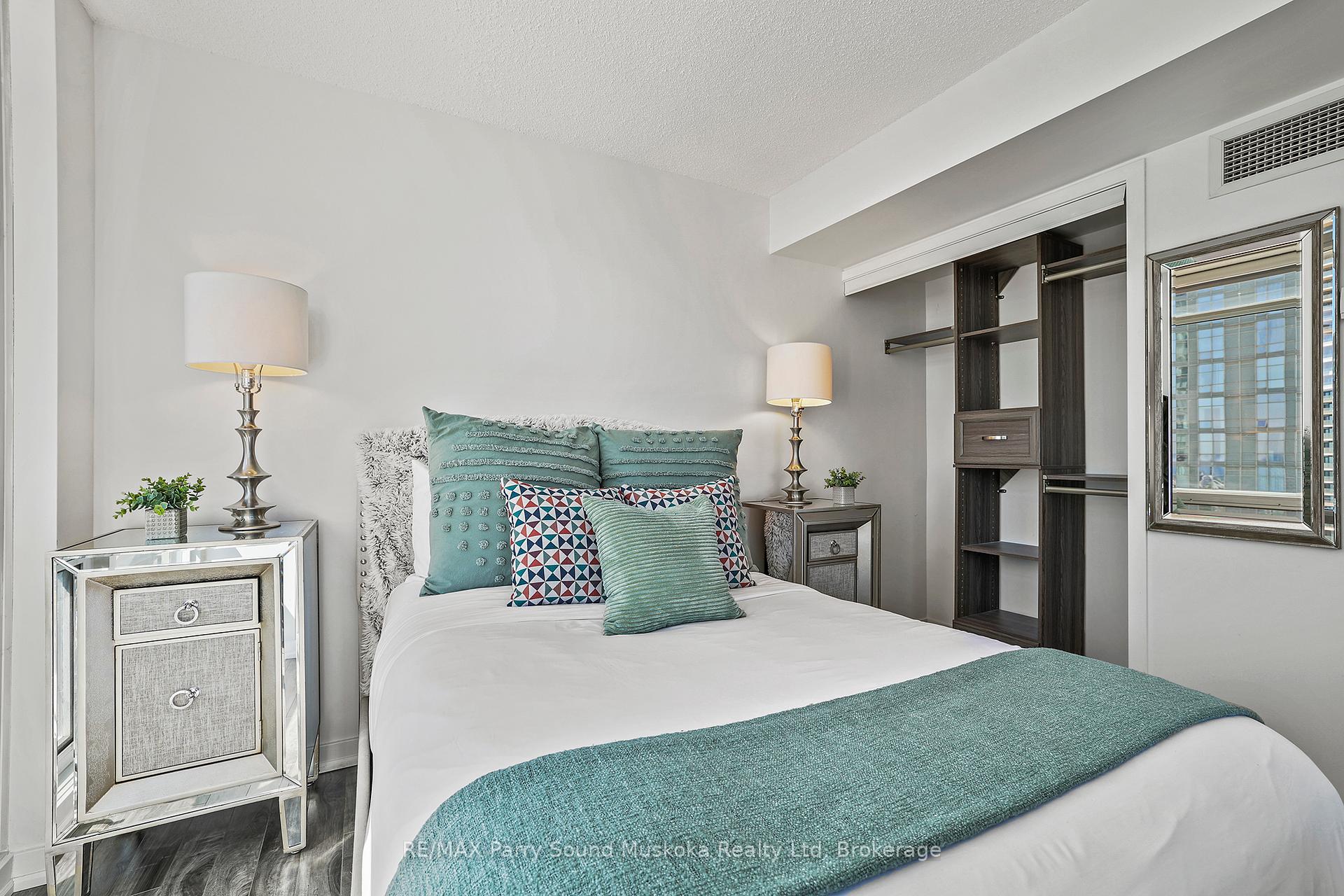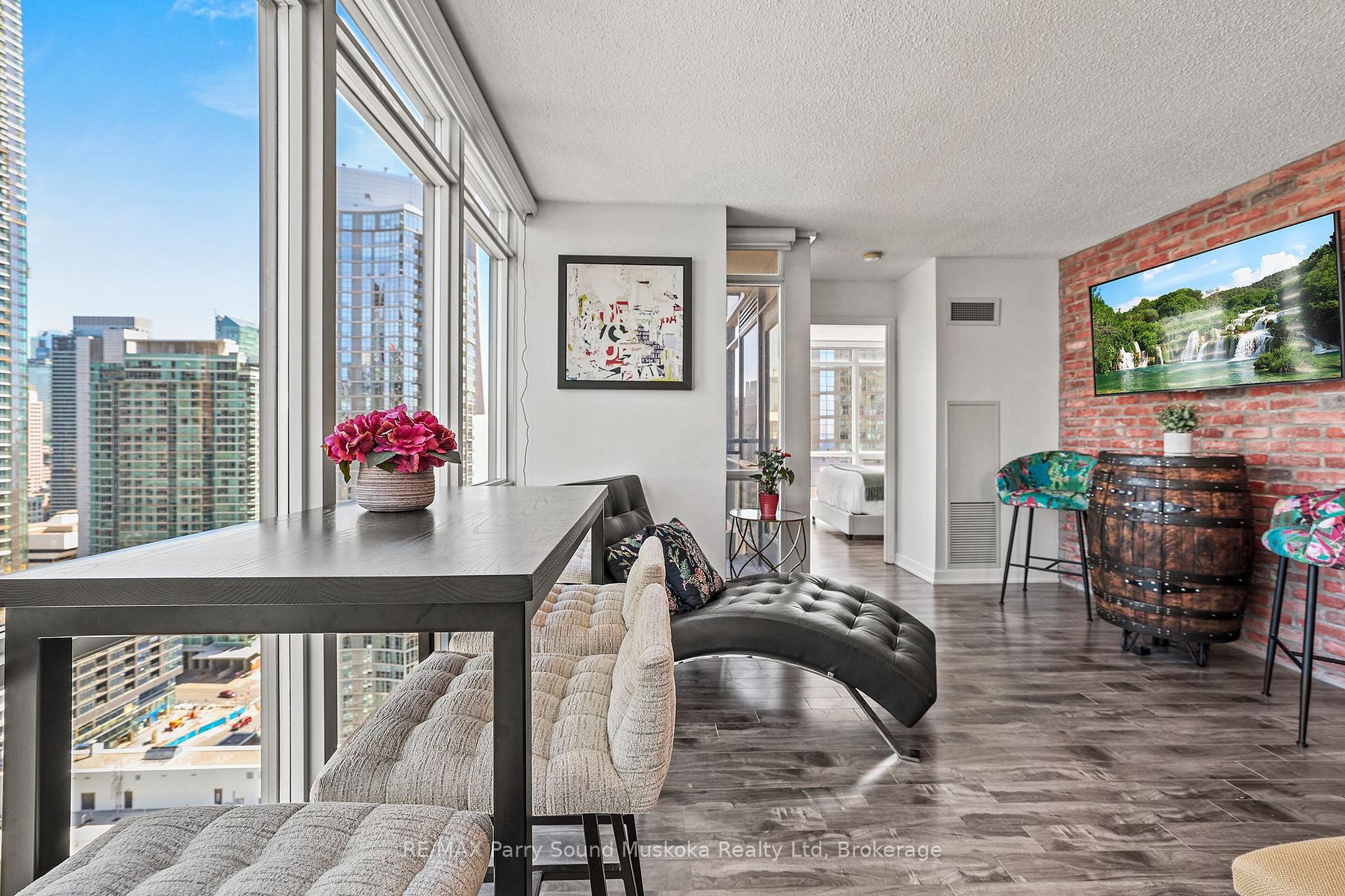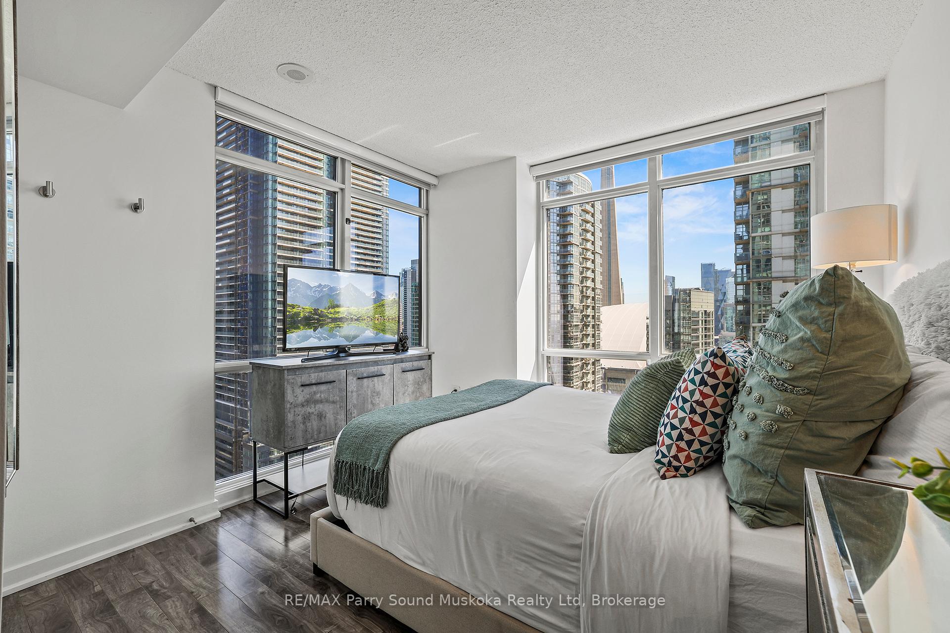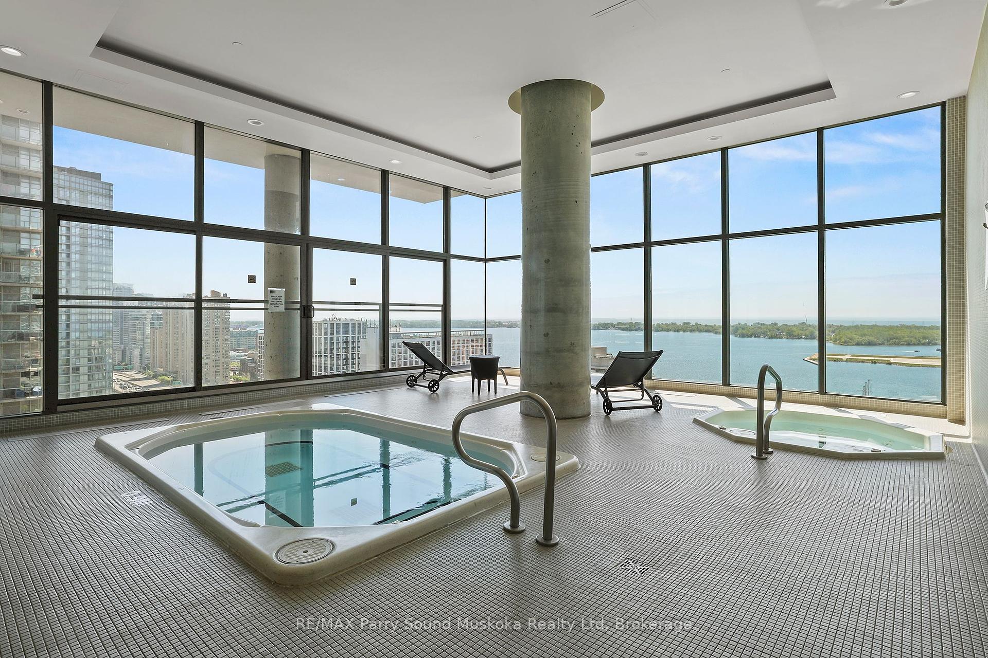 Stunning city view, CN Tower/Rogers Centre, Water view from balcony. 31st floor.1+1 corner unit will leave you breathless and wanting to move in immediately. Floor to ceiling windows with automatic zebra shades blinds. In suite laundry. Spacious living area. Built in storage closets. 1 parking space and 1 locker space. Games room, work stations, indoor pool, 27th floor hot tub room. Recently renovated gym. Pets welcome. Across from school, community centre, park and grocery store. Just a hop skip and a jump onto the highway or public transit.