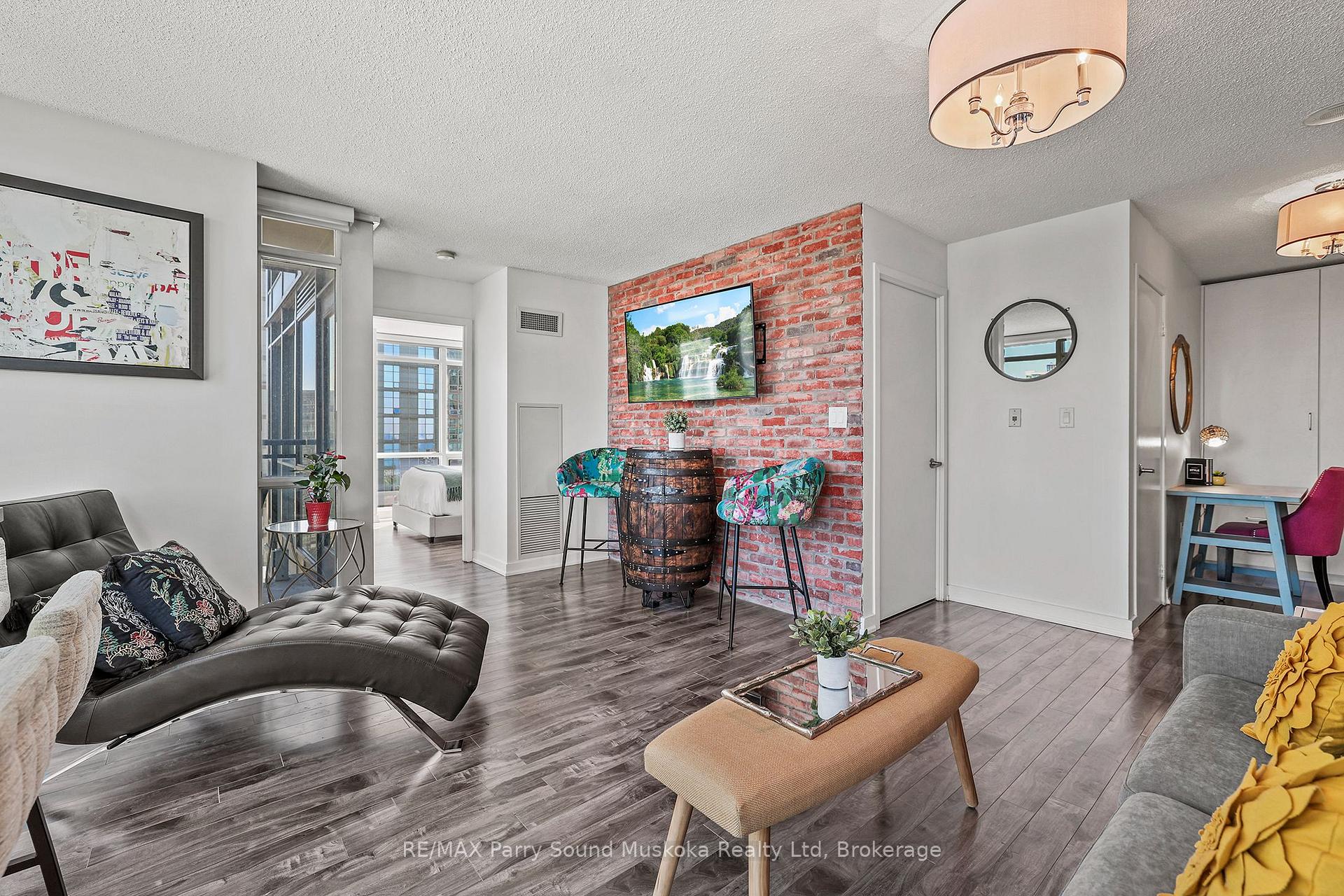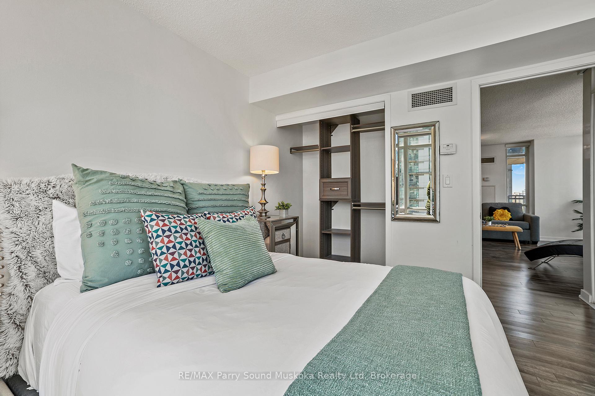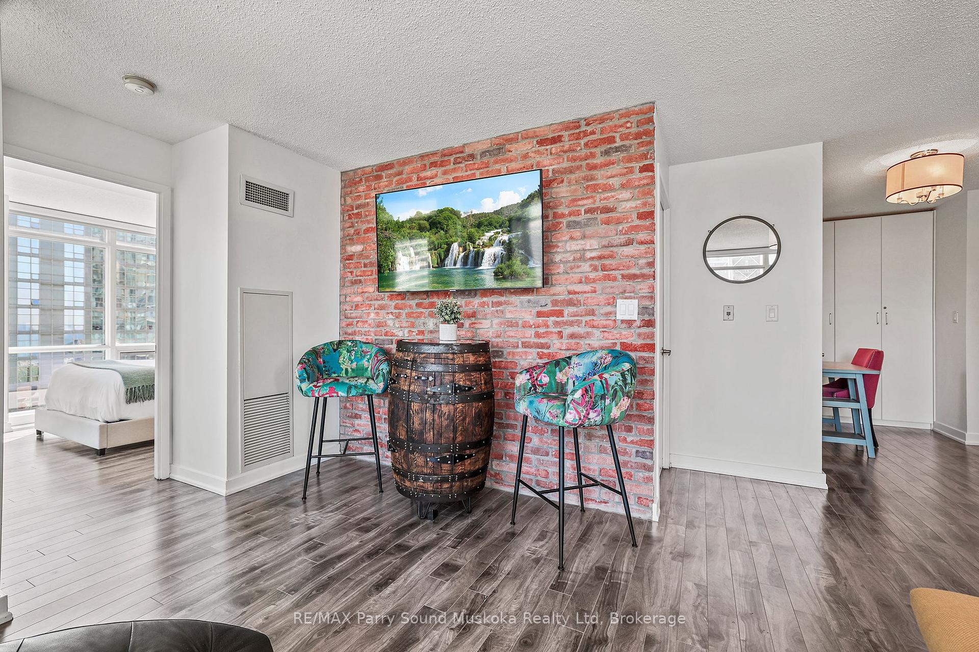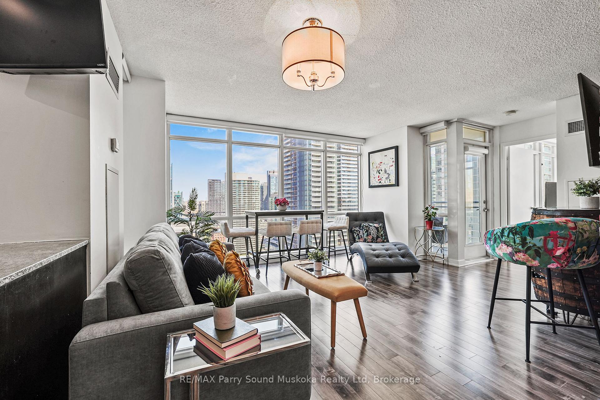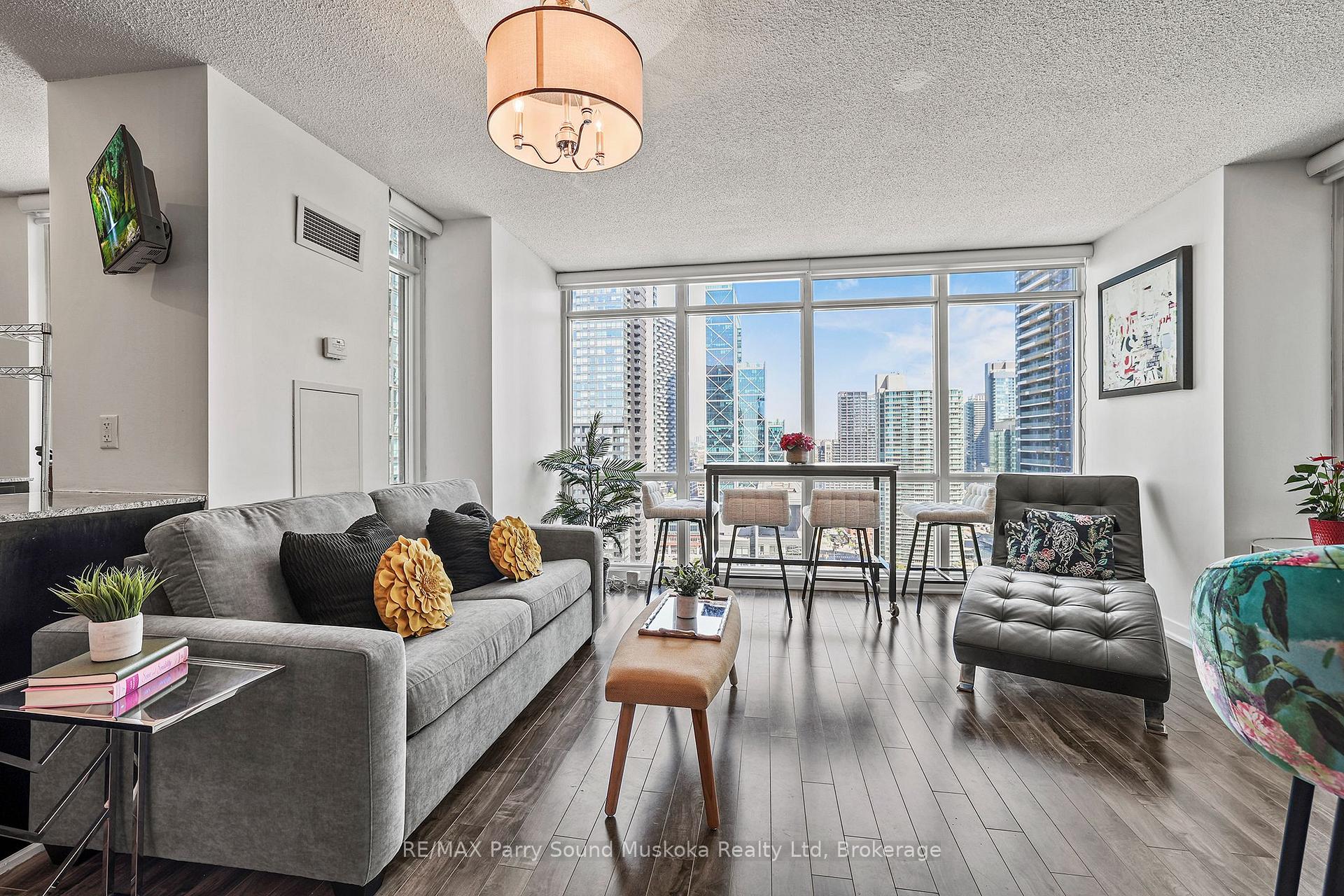 Stunning city view, CN Tower/Rogers Centre, Water view from balcony. 31st floor.1+1 corner unit will leave you breathless and wanting to move in immediately. Floor to ceiling windows with automatic zebra shades blinds. In suite laundry. Spacious living area. Built in storage closets. 1 parking space and 1 locker space. Games room, work stations, indoor pool, 27th floor hot tub room. Recently renovated gym. Pets welcome. Across from school, community centre, park and grocery store. Just a hop skip and a jump onto the highway or public transit.