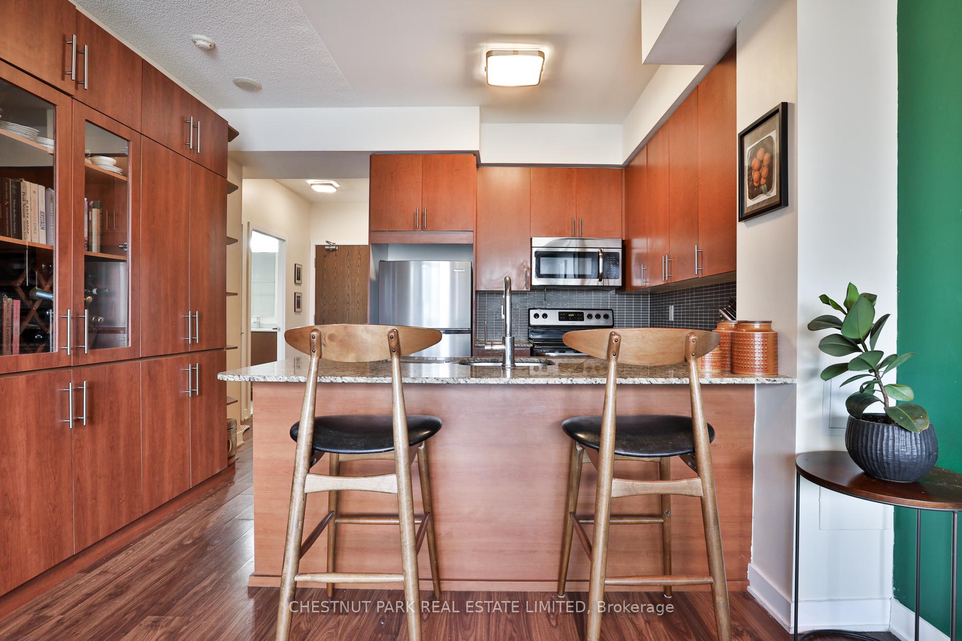 Spacious unit for comfortable downtown living! Located in a well maintained midrise condo features two full baths, separate den, walk-in closet & large balcony w/ unobstructed park view. Kitchen features granite countertops, stainless appliances and custom display cabinetry. Convenient breakfast bar counter seating adjacent to the bright open concept dining and living room. Includes underground parking and two lockers for all of your extra storage needs. Streetcar at your doorstep and walking distance from subway, groceries and charming cafes. This vibrant neighbourhood offers excellent public facilities incl. one of the city's best pools, community centre, soccer pitch, skating rink and nearby Riverdale Park. Building amenities offer 24 hour concierge, rooftop with BBQ, gym, bike storage and visitor parking.
