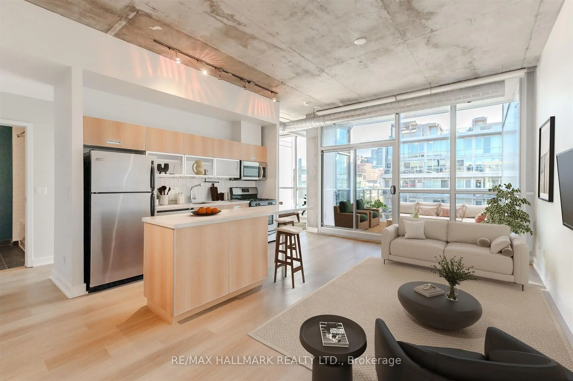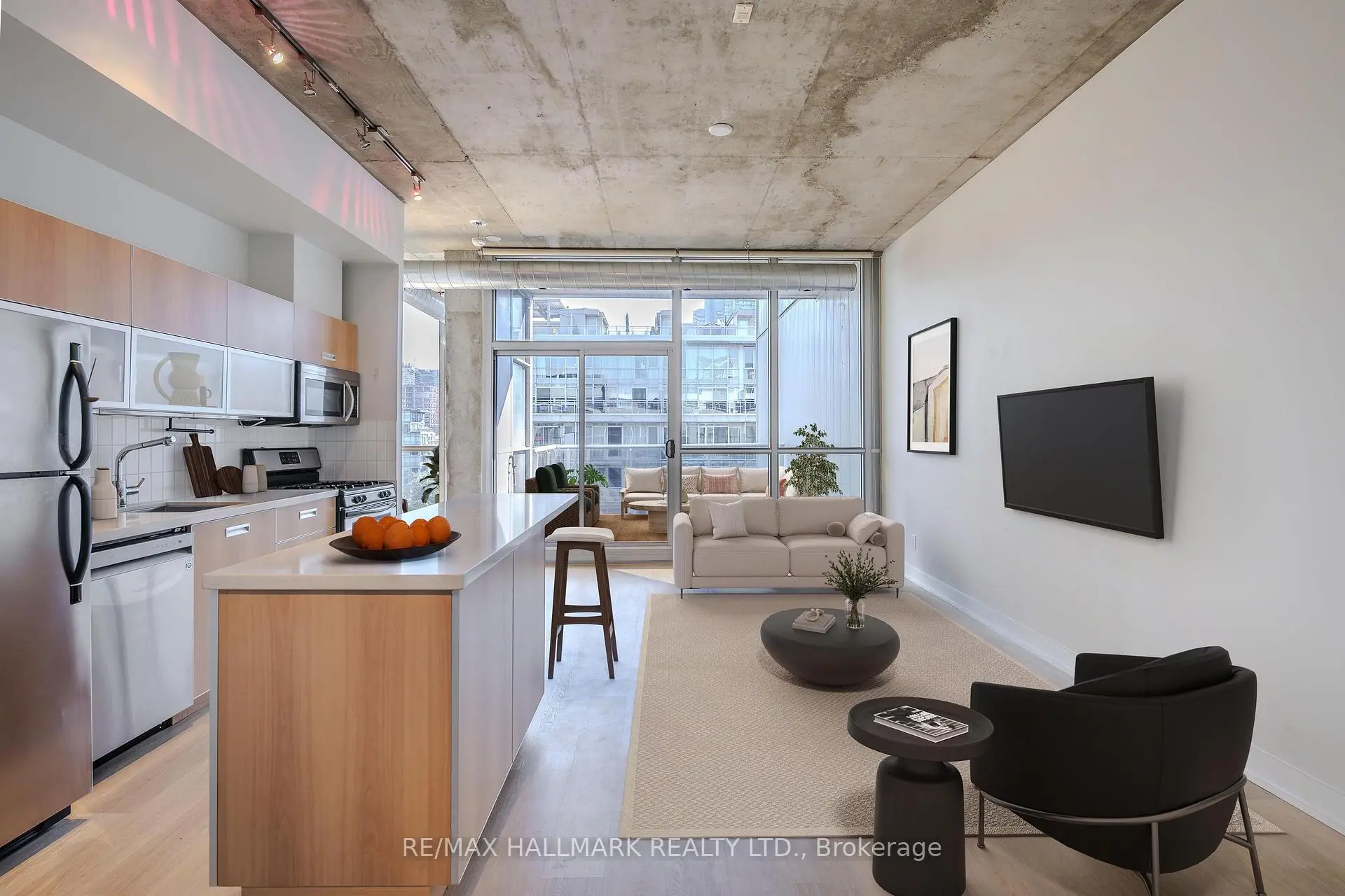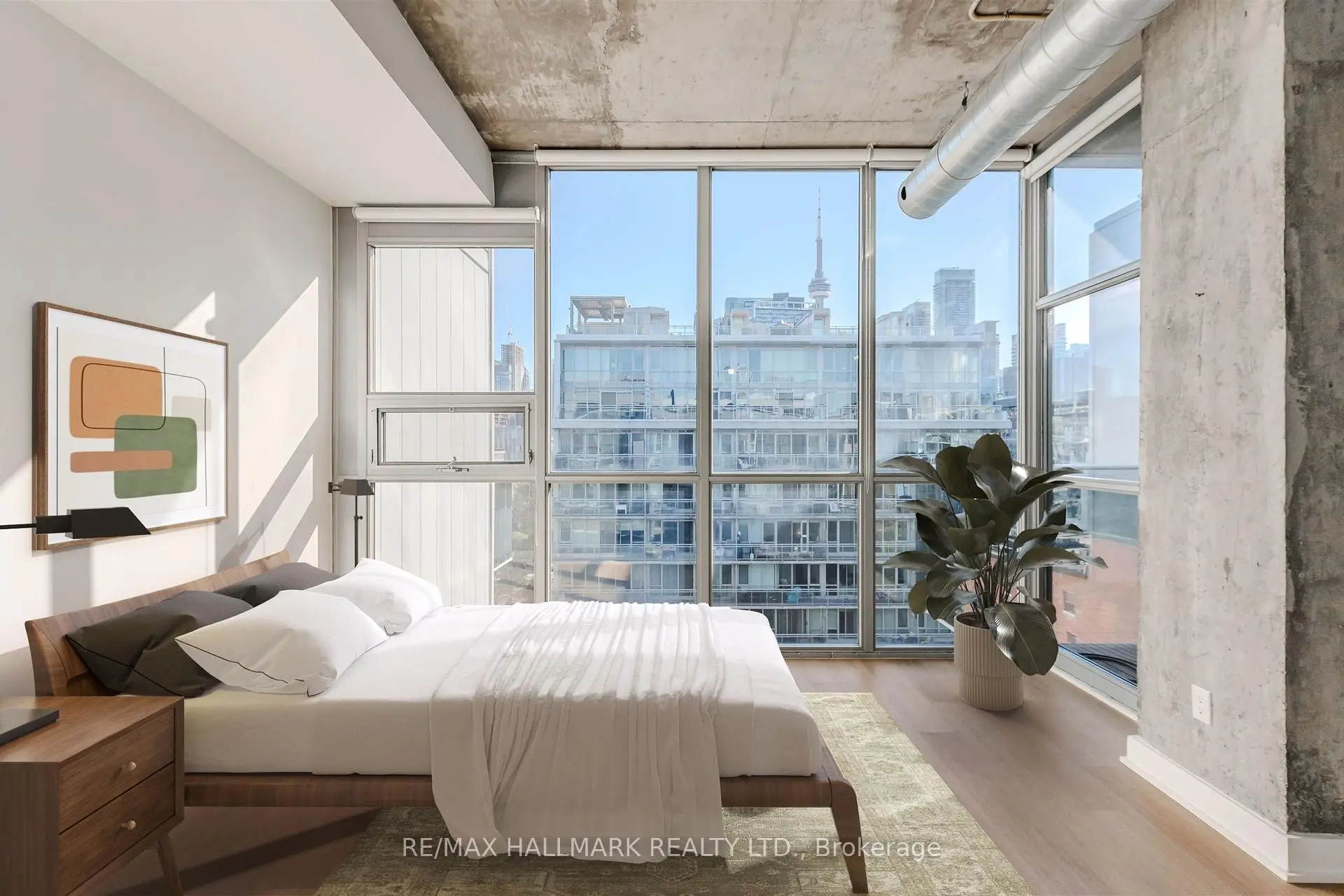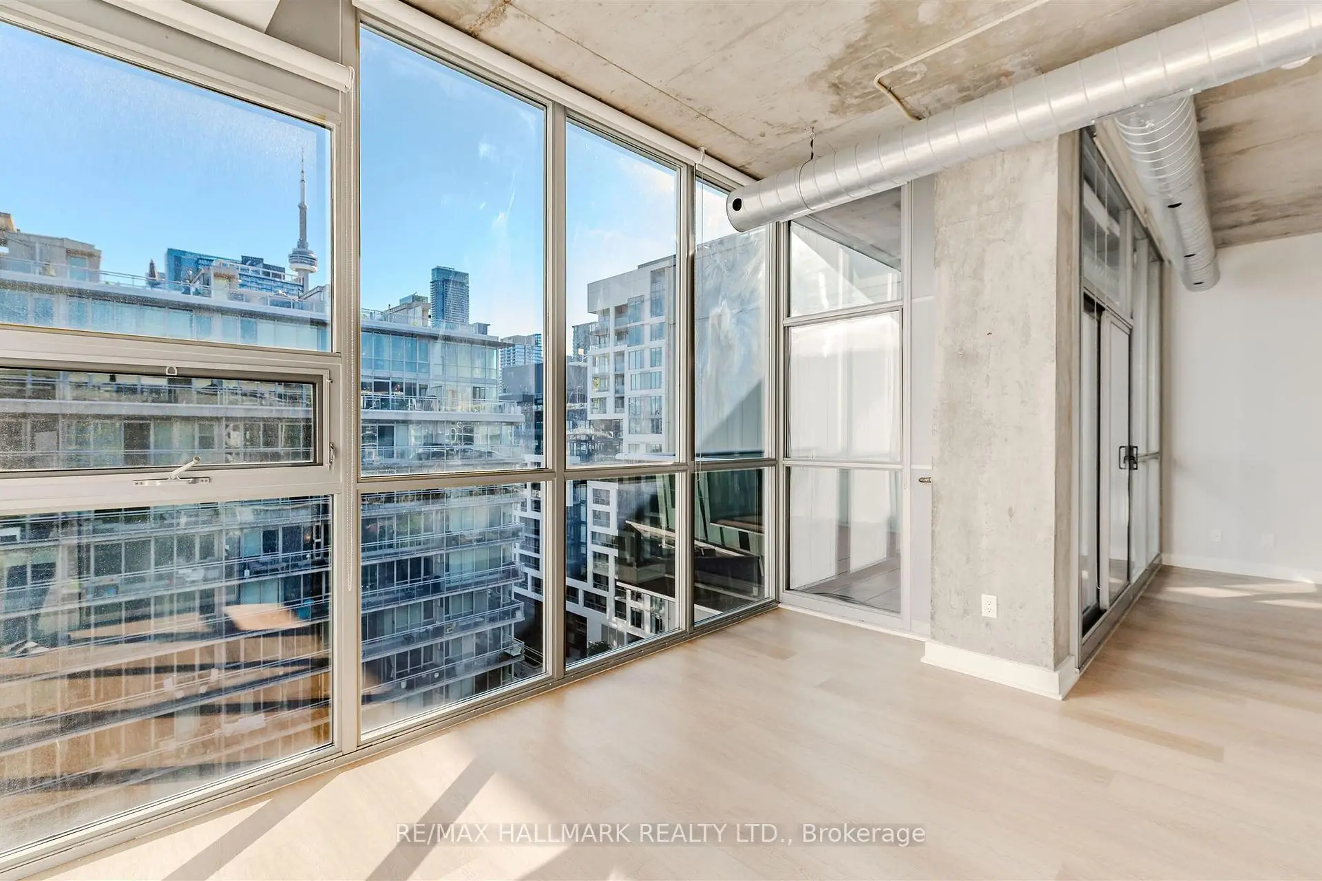 Welcome to your dream loft at 60 Bathurst St! Soaring 10-foot exposed concrete ceilings, a spacious and functional 1+den layout, and a private terrace with iconic CN Tower views. Fire up the BBQ (yes, there's a gas hookup on your oversized 144 square foot terrace) and entertain in style on one of the buildings best outdoor spaces. Inside, the open-concept living and dining area is perfect for both quiet nights in and hosting friends. Stainless steel appliances and caesarstone countertops in the kitchen, upgraded flooring throughout, floor to ceiling windows, and plenty of closet space, this loft checks all of the boxes. The den is large enough to function as a proper home office or guest space, while the primary bedroom offers comfort and style. Complete with a prime parking space (right across from the elevator), one storage locker, and located in a well-managed boutique building in the heart of King West. LOW MAINTENANCE FEES! Steps to everything - parks, 24 hour TTC, Billy Bishop airport, shops, restaurants, and bars. "Other" room is the terrace. *Property has been virtually staged.