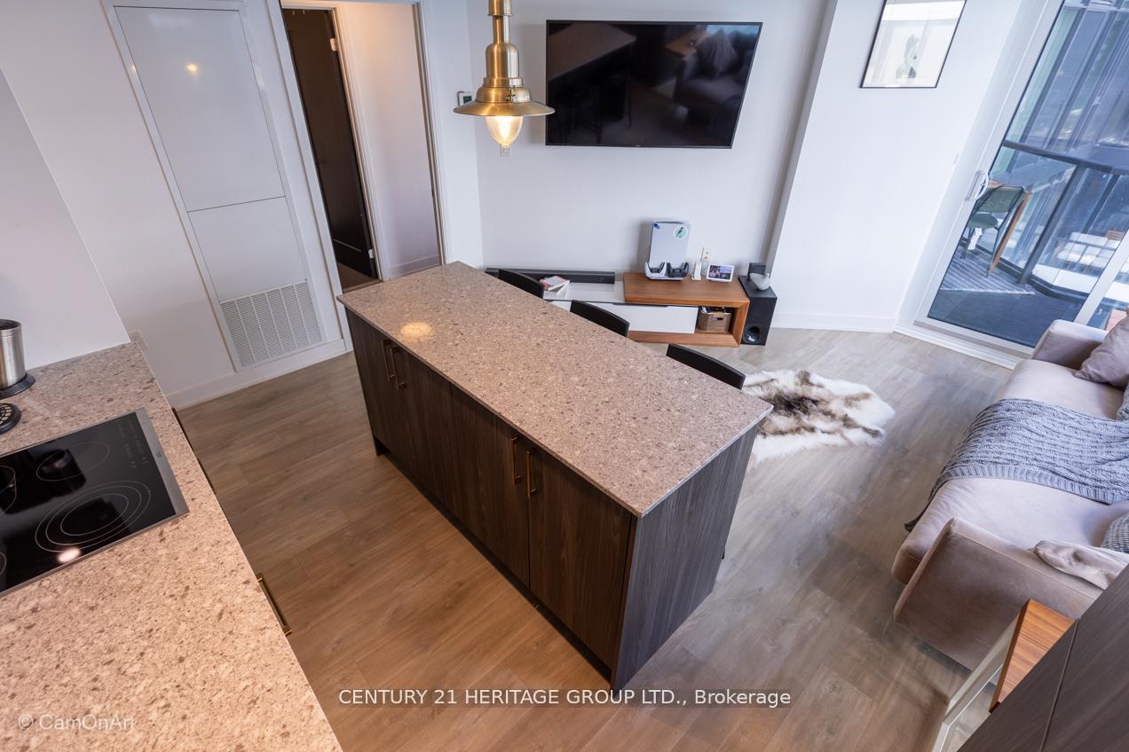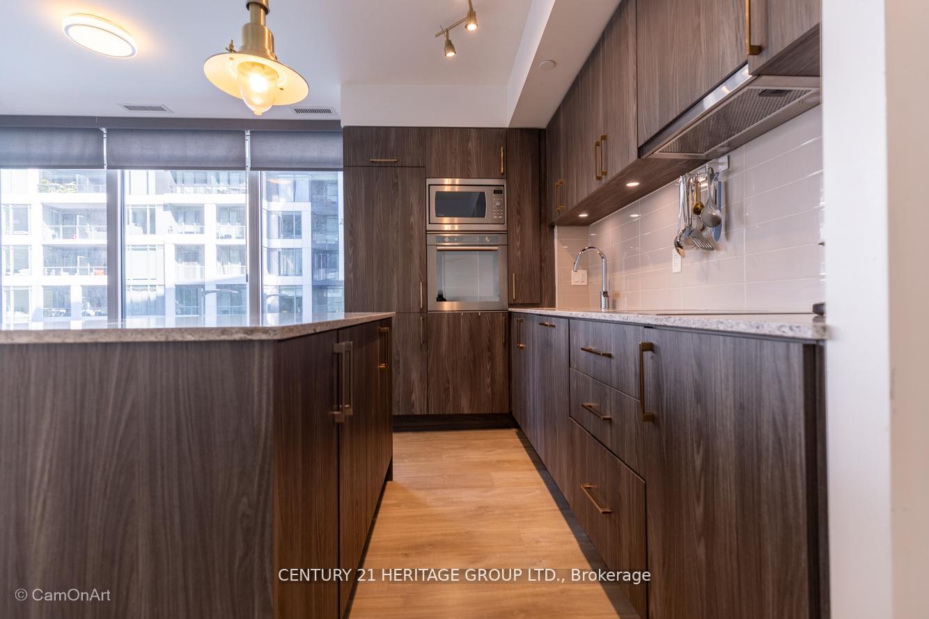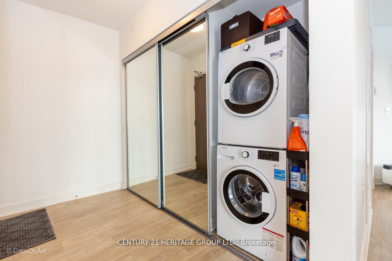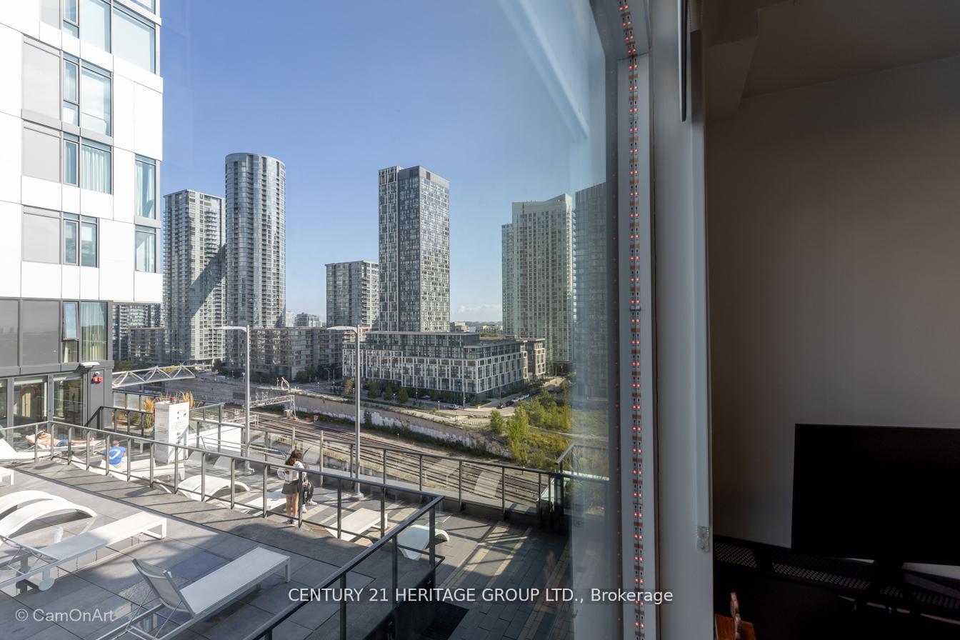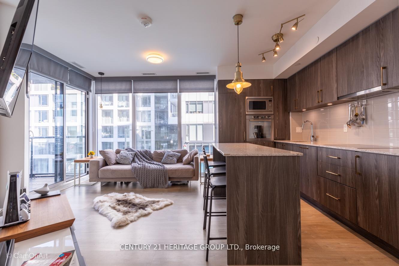 CORNER UNIT with 810 Square Feet of living space with balcony. Glimpse Lake Ontario from your second bedroom windows. This is a larger than average two bedroom unit when compared to other units. One underground parking and storage locker are included in the price. Daylight surrounds you via the 9-foot floor-to-ceiling windows. Meticulously maintained, with upgrades in the kitchen and bathrooms, including new like stainless steel high end built-in oven and microwave, a four element cooktop, upgraded kitchen island. The primary has a large walk-in closet, immaculate three piece ensuite. The main 4-piece bathroom is like new with a full-sized tub. Roller blinds on all the 9-foot floor-to-ceiling windows provide privacy and/or darkness. Living room has electronic roller blinds. Enjoy breakfast on your spacious 83 sq ft balcony with space for a couch and a table where you can sit and enjoy your morning coffee. Current owner stores a bicycle and cooks there. Minto's sterling reputation for exceptionally high quality construction with LEED certification is reflected in the reasonable maintenance fees. The remarkable architecture makes this property instantly recognizable. The quality of materials and amenities including a sophisticated fitness centre, 24 hr. security and concierge, beautiful rooftop patio and pool, three luxurious lounges, party, media rooms, shared BBQ's, community courtyard. You will be in the heart of the action: the Well, Stackt and unlimited dining and shopping plus the proximity to the lake. FarmBoy and Dollarama are conveniently located on the ground floor. A 99 Walk Score and 95 Transit Score! The New Ontario Transit Line will be a short walk awaymaking this property even more valuable. The quality of workmanship materials and amenities and location, location make this a highly desirable building complex. Underground parking and locker are included, you can earn $3300/ per month rental income.