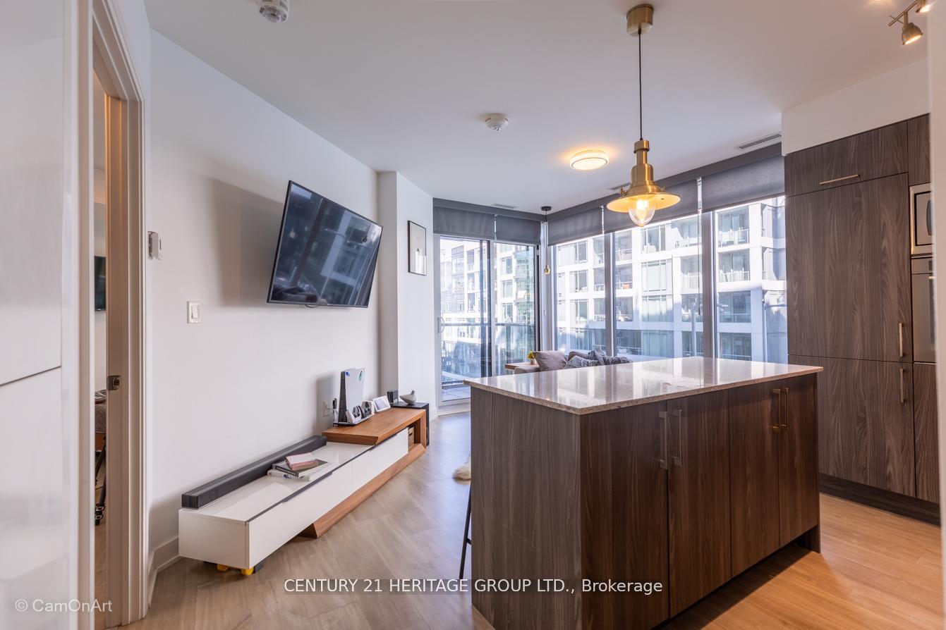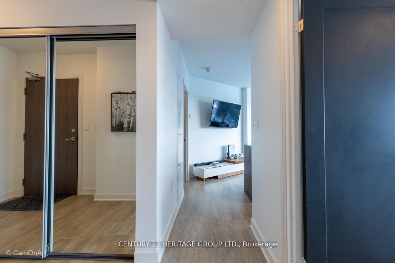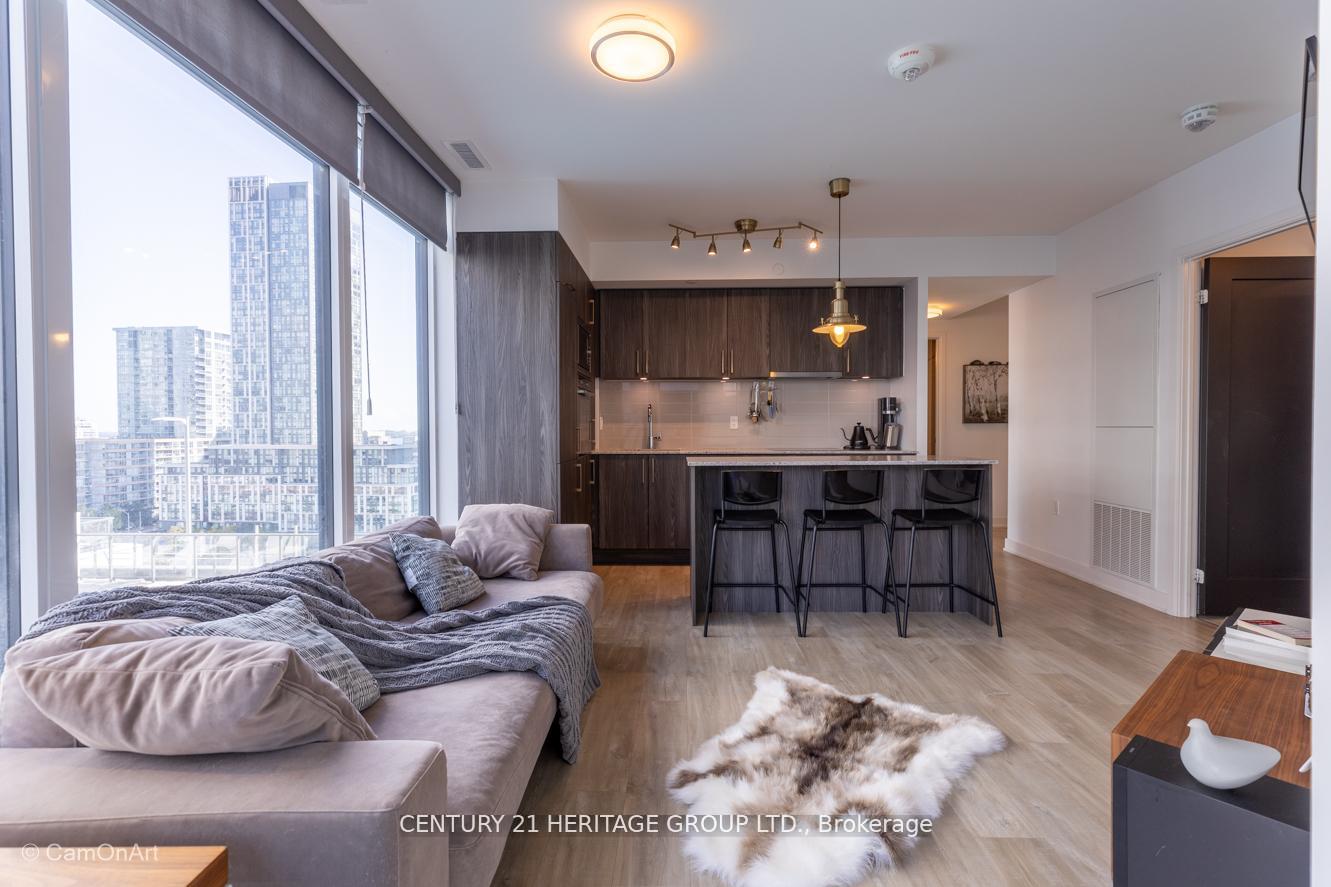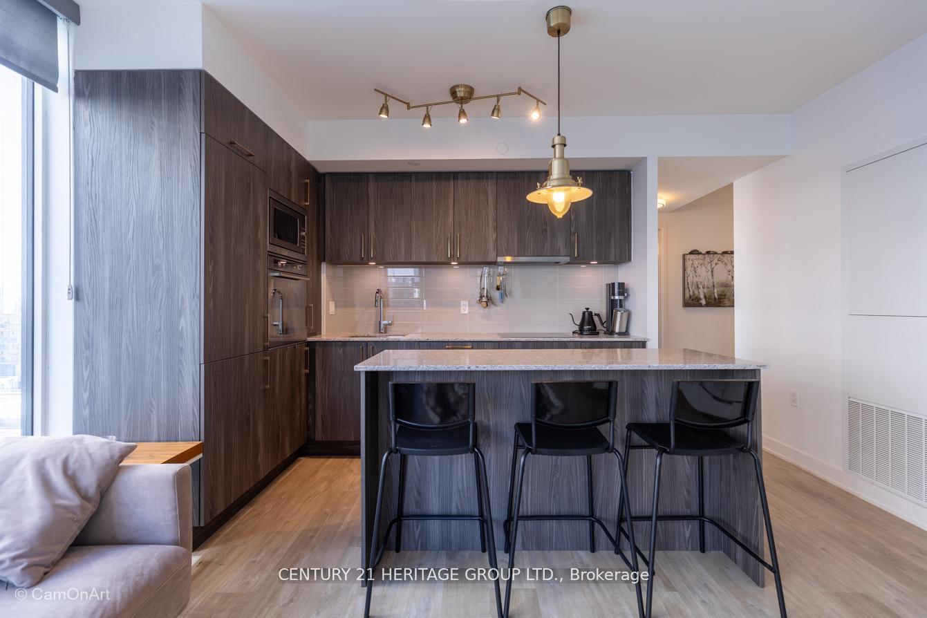 CORNER UNIT with 810 Square Feet of living space with balcony. Glimpse Lake Ontario from your second bedroom windows. This is a larger than average two bedroom unit when compared to other units. One underground parking and storage locker are included in the price. Daylight surrounds you via the 9-foot floor-to-ceiling windows. Meticulously maintained, with upgrades in the kitchen and bathrooms, including new like stainless steel high end built-in oven and microwave, a four element cooktop, upgraded kitchen island. The primary has a large walk-in closet, immaculate three piece ensuite. The main 4-piece bathroom is like new with a full-sized tub. Roller blinds on all the 9-foot floor-to-ceiling windows provide privacy and/or darkness. Living room has electronic roller blinds. Enjoy breakfast on your spacious 83 sq ft balcony with space for a couch and a table where you can sit and enjoy your morning coffee. Current owner stores a bicycle and cooks there. Minto's sterling reputation for exceptionally high quality construction with LEED certification is reflected in the reasonable maintenance fees. The remarkable architecture makes this property instantly recognizable. The quality of materials and amenities including a sophisticated fitness centre, 24 hr. security and concierge, beautiful rooftop patio and pool, three luxurious lounges, party, media rooms, shared BBQ's, community courtyard. You will be in the heart of the action: the Well, Stackt and unlimited dining and shopping plus the proximity to the lake. FarmBoy and Dollarama are conveniently located on the ground floor. A 99 Walk Score and 95 Transit Score! The New Ontario Transit Line will be a short walk awaymaking this property even more valuable. The quality of workmanship materials and amenities and location, location make this a highly desirable building complex. Underground parking and locker are included, you can earn $3300/ per month rental income.