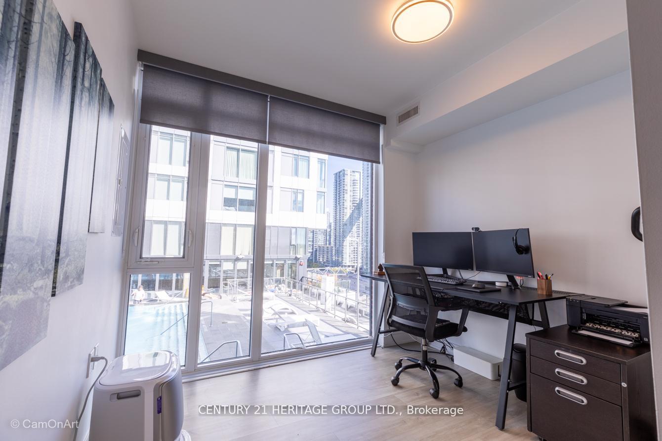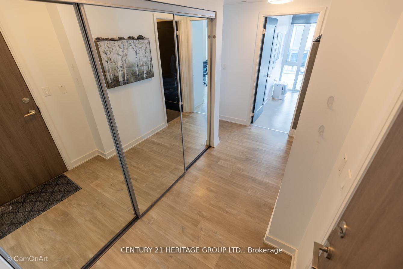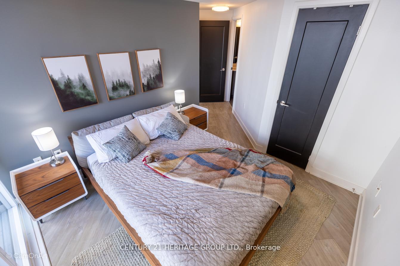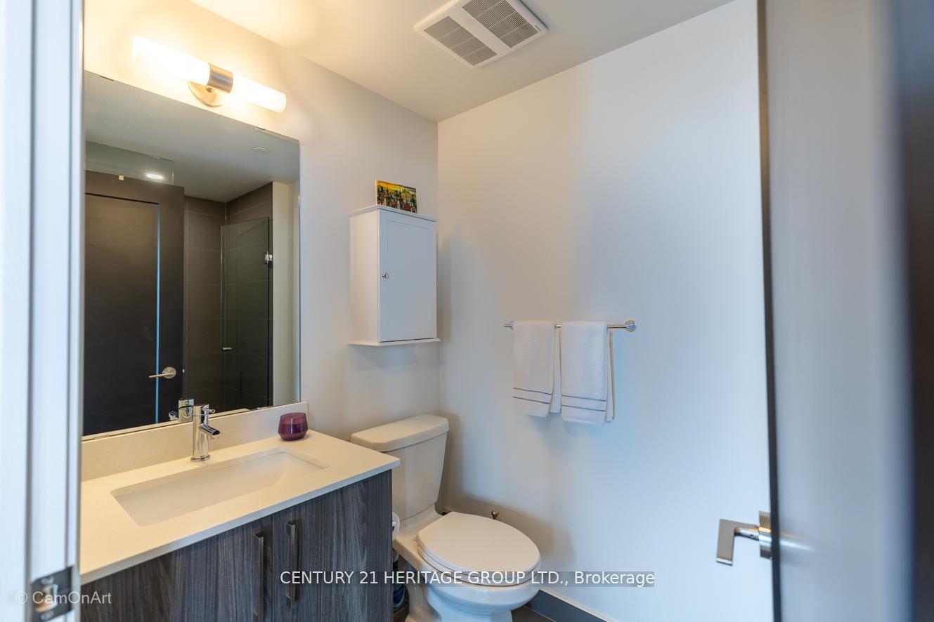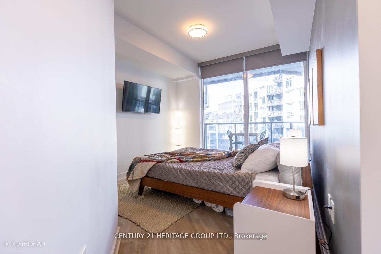 CORNER UNIT with 810 Square Feet of living space with balcony. Glimpse Lake Ontario from your second bedroom windows. This is a larger than average two bedroom unit when compared to other units. One underground parking and storage locker are included in the price. Daylight surrounds you via the 9-foot floor-to-ceiling windows. Meticulously maintained, with upgrades in the kitchen and bathrooms, including new like stainless steel high end built-in oven and microwave, a four element cooktop, upgraded kitchen island. The primary has a large walk-in closet, immaculate three piece ensuite. The main 4-piece bathroom is like new with a full-sized tub. Roller blinds on all the 9-foot floor-to-ceiling windows provide privacy and/or darkness. Living room has electronic roller blinds. Enjoy breakfast on your spacious 83 sq ft balcony with space for a couch and a table where you can sit and enjoy your morning coffee. Current owner stores a bicycle and cooks there. Minto's sterling reputation for exceptionally high quality construction with LEED certification is reflected in the reasonable maintenance fees. The remarkable architecture makes this property instantly recognizable. The quality of materials and amenities including a sophisticated fitness centre, 24 hr. security and concierge, beautiful rooftop patio and pool, three luxurious lounges, party, media rooms, shared BBQ's, community courtyard. You will be in the heart of the action: the Well, Stackt and unlimited dining and shopping plus the proximity to the lake. FarmBoy and Dollarama are conveniently located on the ground floor. A 99 Walk Score and 95 Transit Score! The New Ontario Transit Line will be a short walk awaymaking this property even more valuable. The quality of workmanship materials and amenities and location, location make this a highly desirable building complex. Underground parking and locker are included, you can earn $3300/ per month rental income.