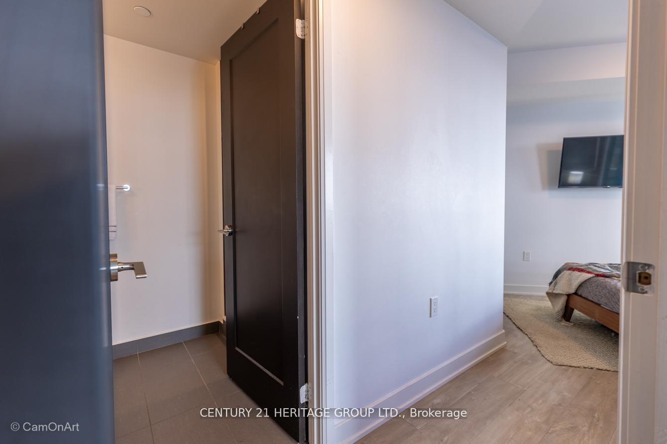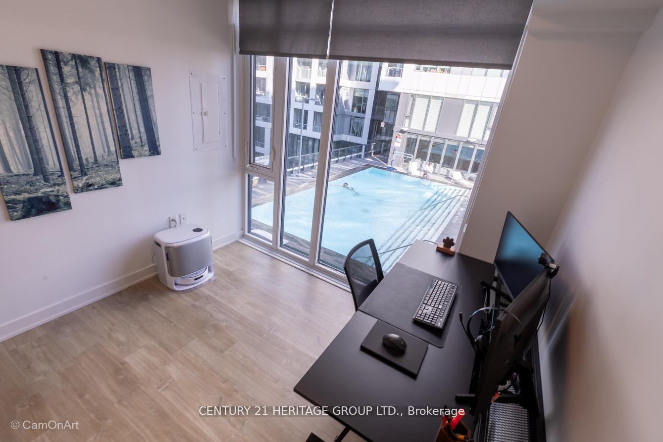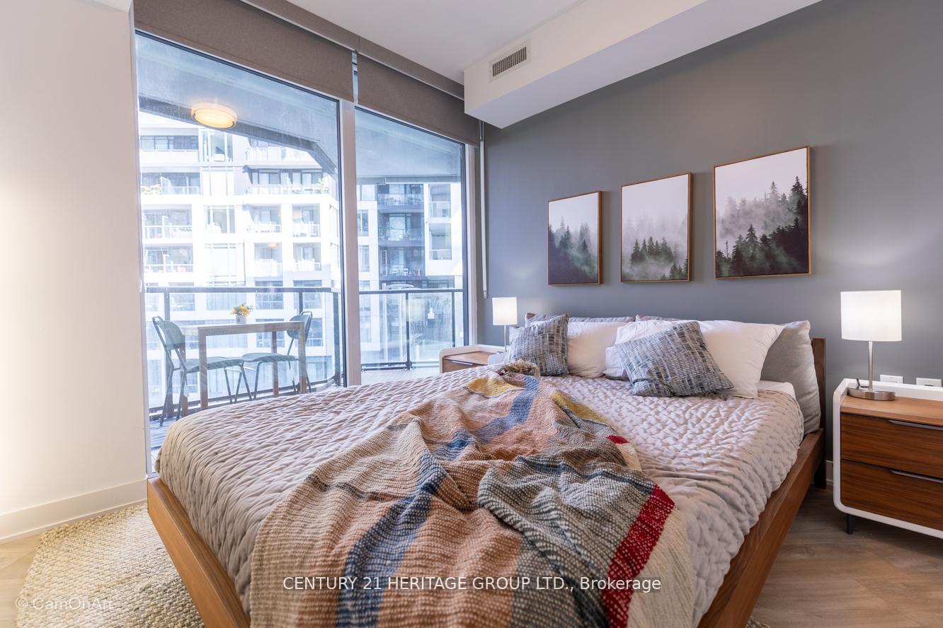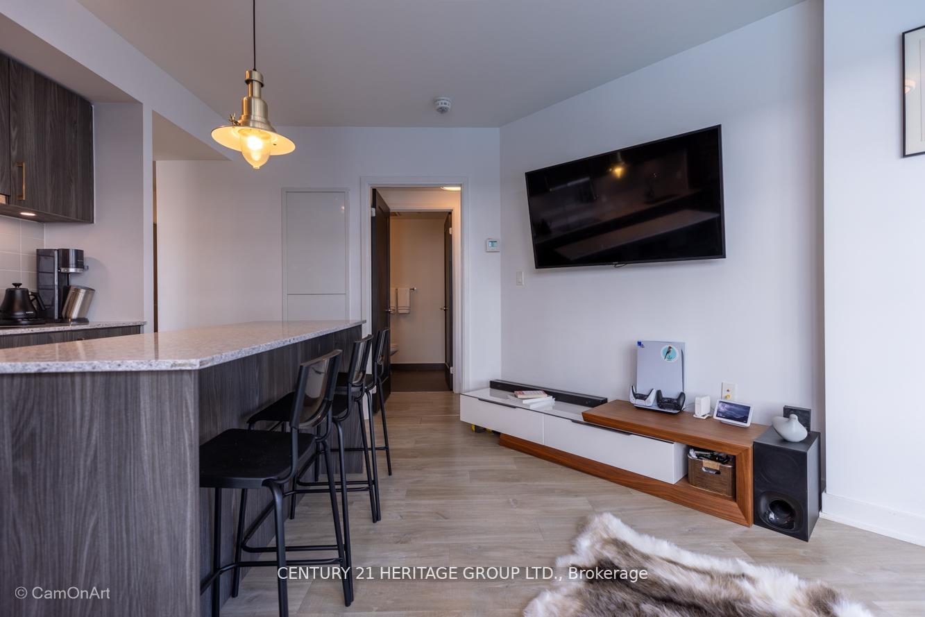 CORNER UNIT with 810 Square Feet of living space with balcony. Glimpse Lake Ontario from your second bedroom windows. This is a larger than average two bedroom unit when compared to other units. One underground parking and storage locker are included in the price. Daylight surrounds you via the 9-foot floor-to-ceiling windows. Meticulously maintained, with upgrades in the kitchen and bathrooms, including new like stainless steel high end built-in oven and microwave, a four element cooktop, upgraded kitchen island. The primary has a large walk-in closet, immaculate three piece ensuite. The main 4-piece bathroom is like new with a full-sized tub. Roller blinds on all the 9-foot floor-to-ceiling windows provide privacy and/or darkness. Living room has electronic roller blinds. Enjoy breakfast on your spacious 83 sq ft balcony with space for a couch and a table where you can sit and enjoy your morning coffee. Current owner stores a bicycle and cooks there. Minto's sterling reputation for exceptionally high quality construction with LEED certification is reflected in the reasonable maintenance fees. The remarkable architecture makes this property instantly recognizable. The quality of materials and amenities including a sophisticated fitness centre, 24 hr. security and concierge, beautiful rooftop patio and pool, three luxurious lounges, party, media rooms, shared BBQ's, community courtyard. You will be in the heart of the action: the Well, Stackt and unlimited dining and shopping plus the proximity to the lake. FarmBoy and Dollarama are conveniently located on the ground floor. A 99 Walk Score and 95 Transit Score! The New Ontario Transit Line will be a short walk awaymaking this property even more valuable. The quality of workmanship materials and amenities and location, location make this a highly desirable building complex. Underground parking and locker are included, you can earn $3300/ per month rental income.