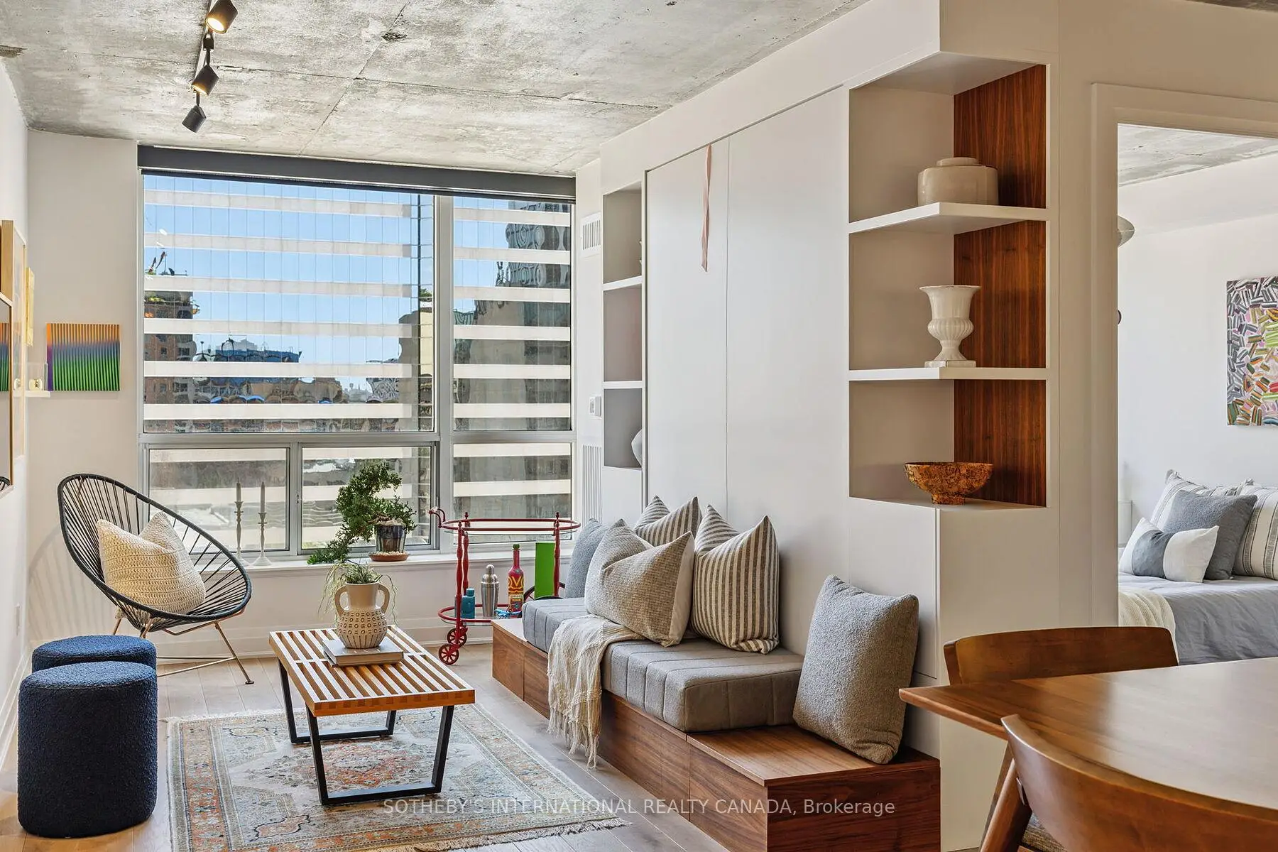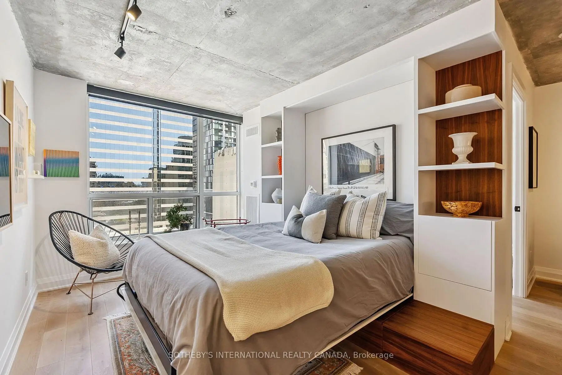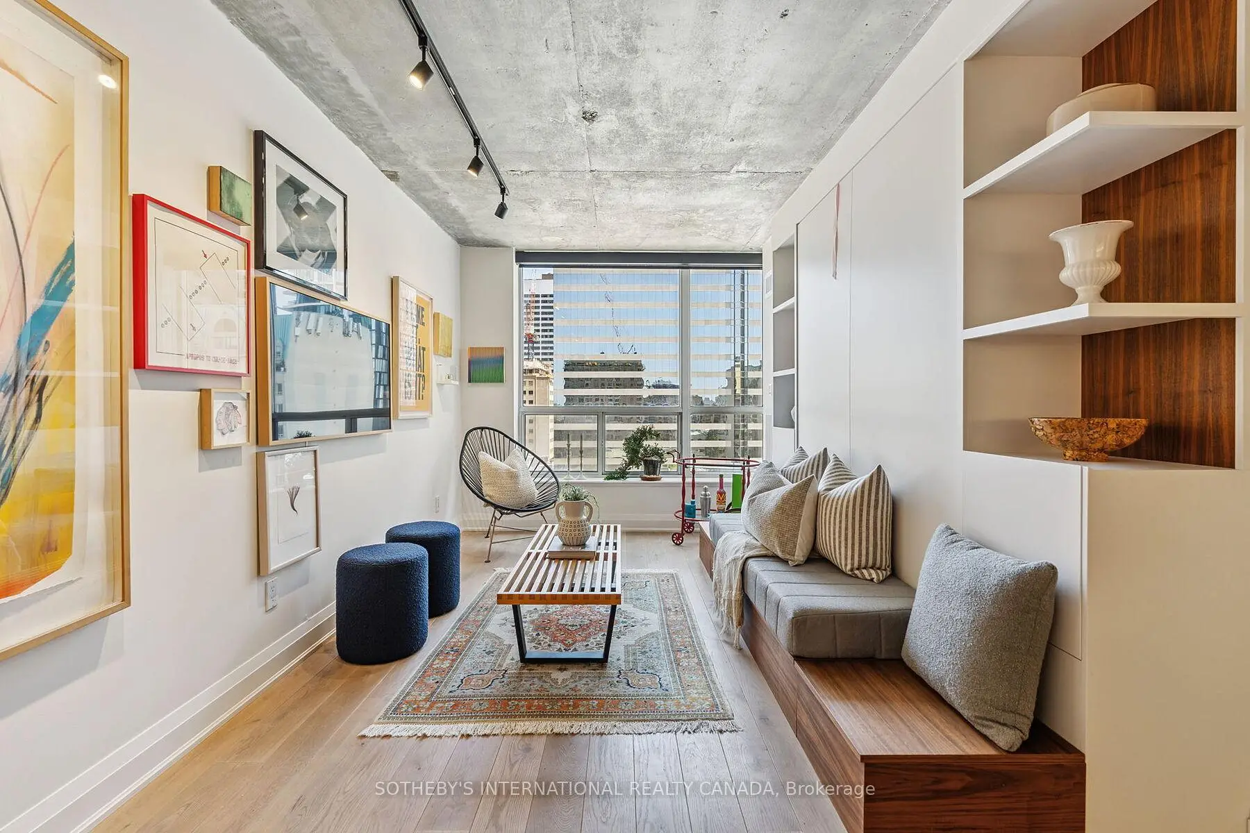 Presenting the Artisan- for the ones who don't just live in the city they move through it with purpose and presence. This downtown space hits different. Concrete ceilings that refuse to be covered. Oak floors that don't just lie there they lead. Solid wood doors throughout add weight, warmth, and intent. A foyer that offers an actual sense of arrival (not a front door that dumps you into the kitchen!). This is architecture with intention.Fully reimagined and renovated with permission, this home doesn't beg for attention it owns the room. The kitchen? A two-tone, chef-caliber command centre with flawless integrated appliances, under-cabinet lighting for late-night ambiance, and storage so well-integrated, it blends seamlessly into the design. Whether hosting a lively gathering or having a quiet evening in, this space effortlessly captivates. Living room = multifunctional brilliance. A custom wall unit with a Murphy bed that disappears when you need space, and reappears when guests do. Perfectly executed, without compromising style.The bathroom floats literally. The vanity hovers, the built-in nooks keep it all clean, and the design? Not trying too hard. Just doing everything right.This place doesn't follow trends. It makes statements. Bold ones. Clean ones. Edgy ones. It's made for someone who knows who they are and who wouldn't dream of settling for open concept beige.Location Right in the heartbeat of Toronto's most artistic and culturally electric neighbourhood. The Artisan puts you a heartbeat from Grange Park, Baldwin Street's cult-fave cafés, Queen Wests creative edge, U of T, OCAD, Toronto Metropoltan University, the Financial District, St. Patrick Subway, and Hospital Row. Whether you're out or in, this is what central is supposed to feel like.Main character energy? Absolutely. NOTE: Living room is now in the den area, which includes a wall bed. This could easily convert into a 2 bedroom