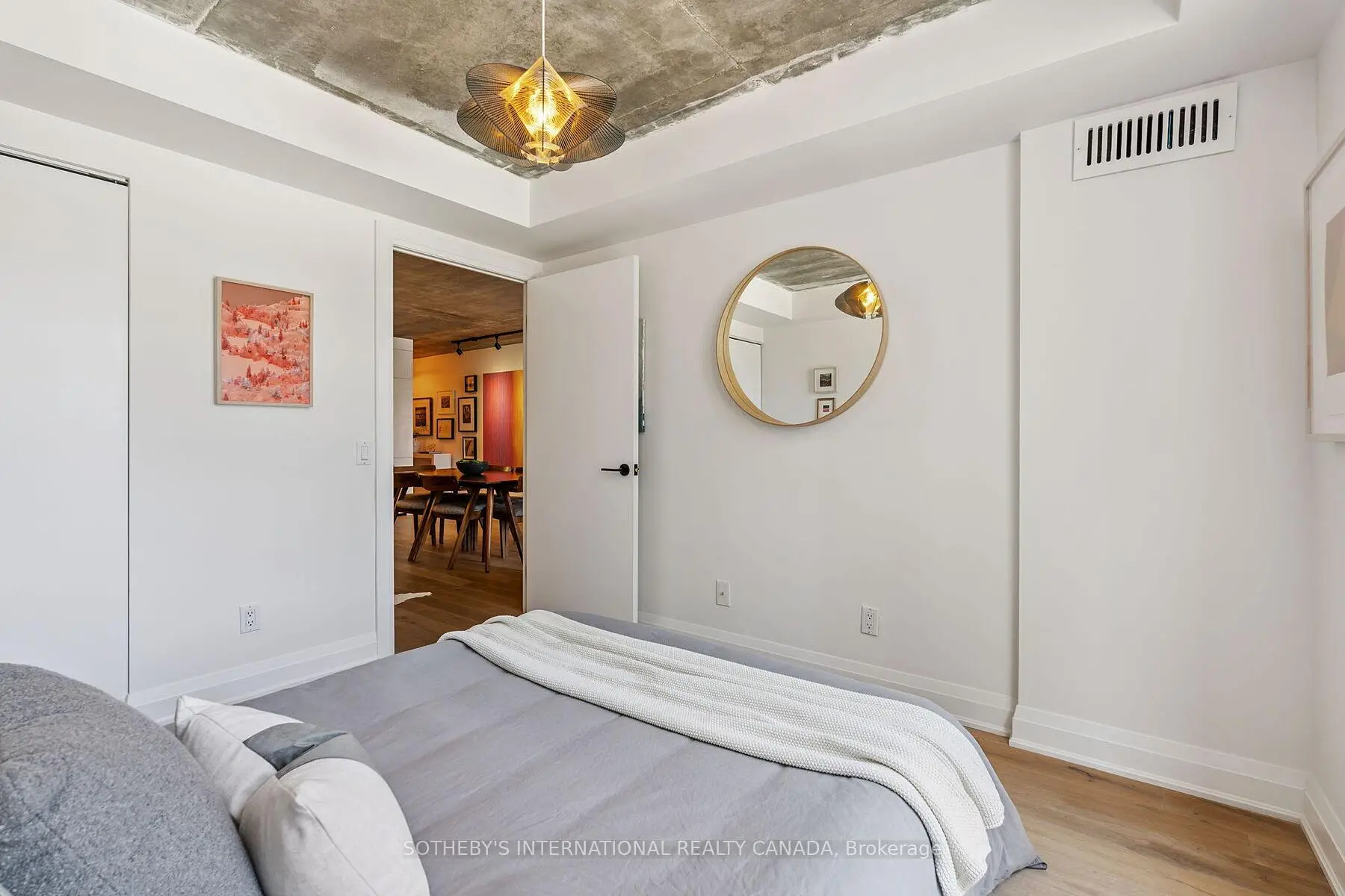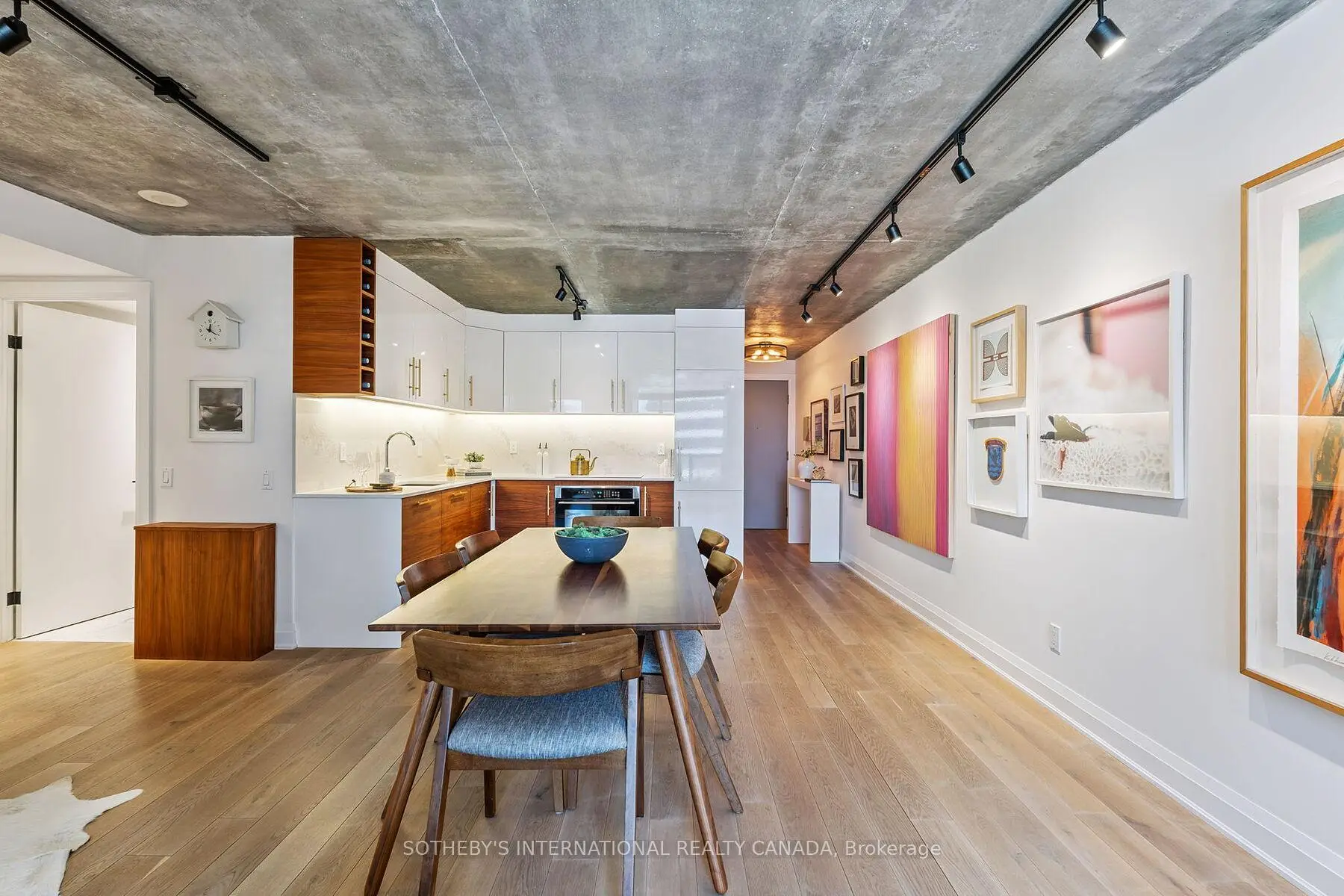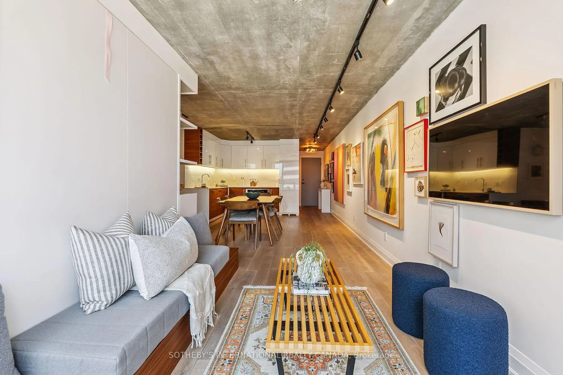 Presenting the Artisan- for the ones who don't just live in the city they move through it with purpose and presence. This downtown space hits different. Concrete ceilings that refuse to be covered. Oak floors that don't just lie there they lead. Solid wood doors throughout add weight, warmth, and intent. A foyer that offers an actual sense of arrival (not a front door that dumps you into the kitchen!). This is architecture with intention.Fully reimagined and renovated with permission, this home doesn't beg for attention it owns the room. The kitchen? A two-tone, chef-caliber command centre with flawless integrated appliances, under-cabinet lighting for late-night ambiance, and storage so well-integrated, it blends seamlessly into the design. Whether hosting a lively gathering or having a quiet evening in, this space effortlessly captivates. Living room = multifunctional brilliance. A custom wall unit with a Murphy bed that disappears when you need space, and reappears when guests do. Perfectly executed, without compromising style.The bathroom floats literally. The vanity hovers, the built-in nooks keep it all clean, and the design? Not trying too hard. Just doing everything right.This place doesn't follow trends. It makes statements. Bold ones. Clean ones. Edgy ones. It's made for someone who knows who they are and who wouldn't dream of settling for open concept beige.Location Right in the heartbeat of Toronto's most artistic and culturally electric neighbourhood. The Artisan puts you a heartbeat from Grange Park, Baldwin Street's cult-fave cafés, Queen Wests creative edge, U of T, OCAD, Toronto Metropoltan University, the Financial District, St. Patrick Subway, and Hospital Row. Whether you're out or in, this is what central is supposed to feel like.Main character energy? Absolutely. NOTE: Living room is now in the den area, which includes a wall bed. This could easily convert into a 2 bedroom