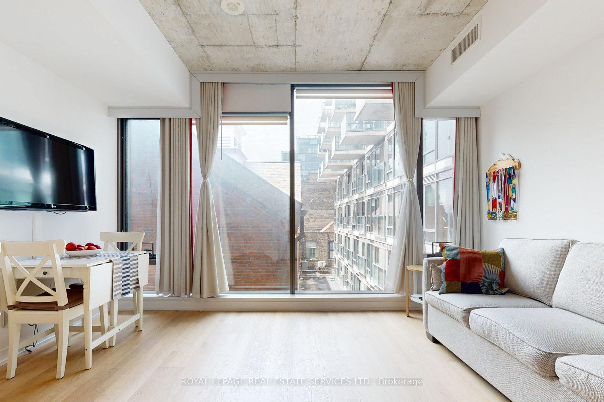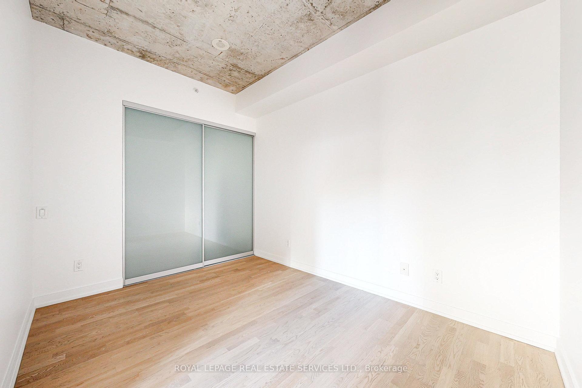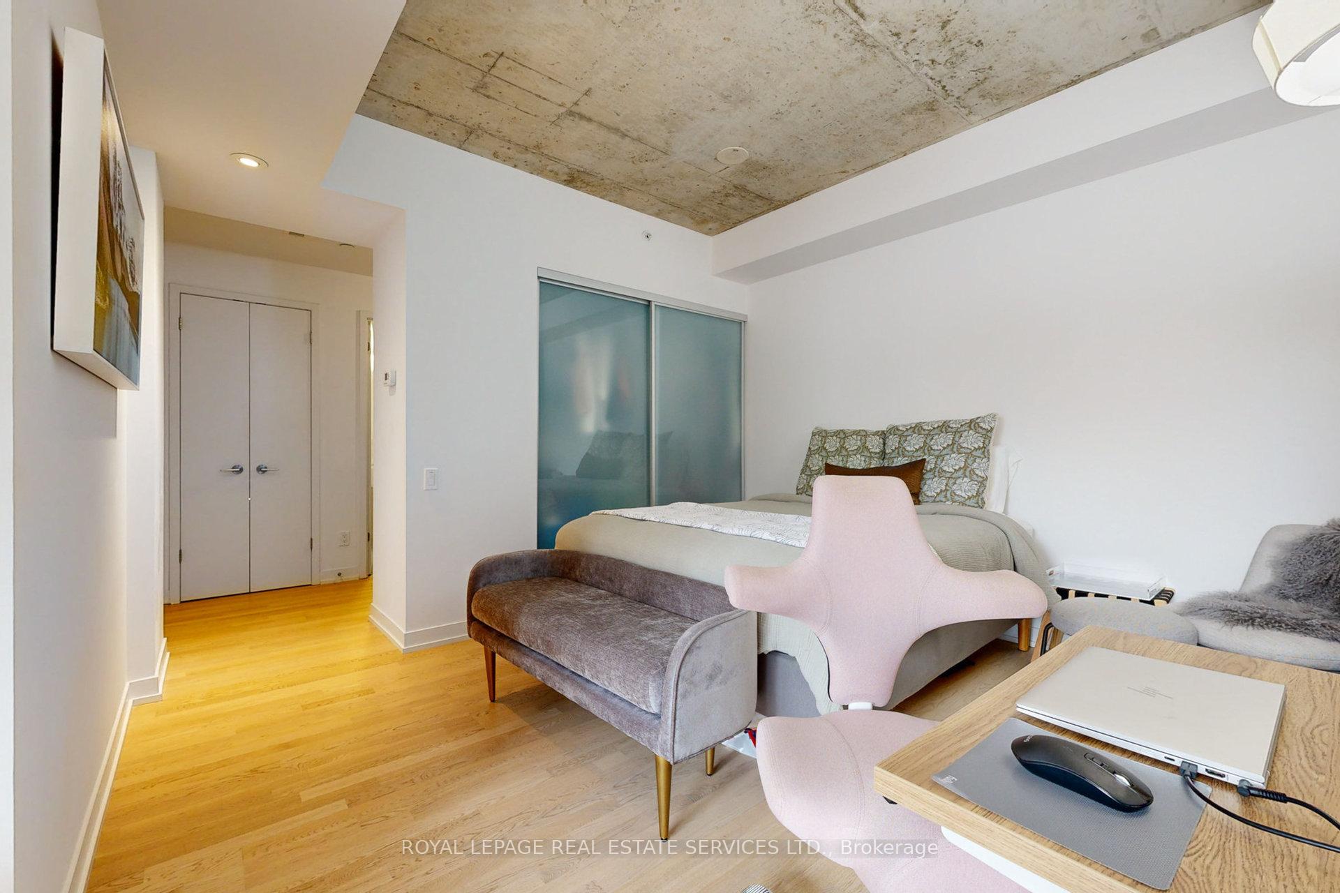 Newly renovated to enclose the bedroom and freshly painted from top to bottom! This 1-bedroom with a locker at the desirable Fashion House in the heart of King West has been impeccably maintained. Loft style, with soaring exposed concrete ceilings, beautiful finishes and floor-to-ceiling windows bringing in ample West-facing light. This 531 sq ft. suite feels comfortable and private, with a well-proportioned living/dining space and efficient layout. Sleek, modern kitchen with stainless steel appliances including a built-in oven, electric radiant cooktop, range hood, countertop microwave, refrigerator and panelled dishwasher. The separate bedroom has a large closet with organizers and a sliding fluted-glass door. Well-managed, boutique building with top-notch amenities: gym, 24 hr concierge, party/meeting room, and a rooftop infinity pool with incredible views of the downtown skyline! Ideal location on King West, close to transit, top restaurants, trendy bars and shopping. Well-established maintenance fees include water, heat, A/C and a storage locker. This unit has been very well cared for by its owner and is ideal for a first-time buy, downtown pied-a-terre, or solid investment. Excellent value in a superb building!