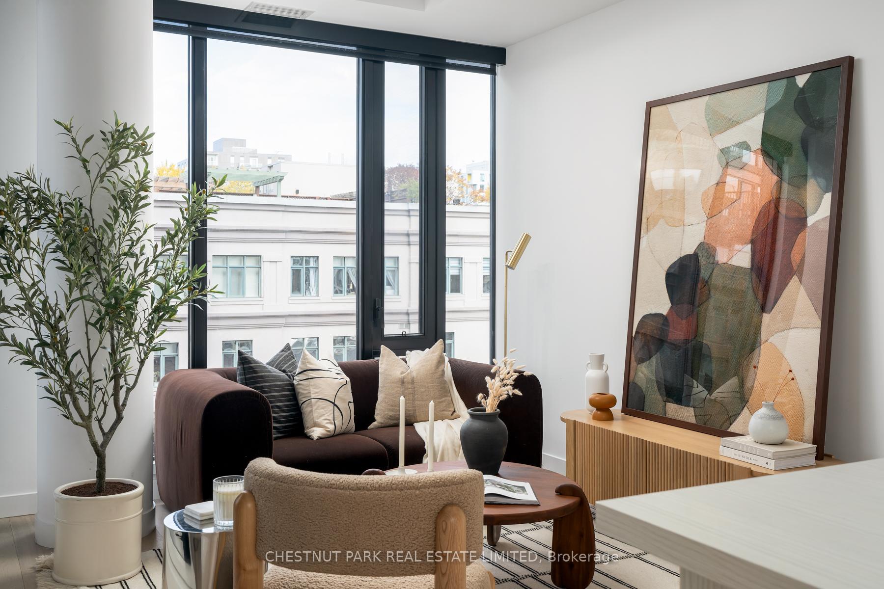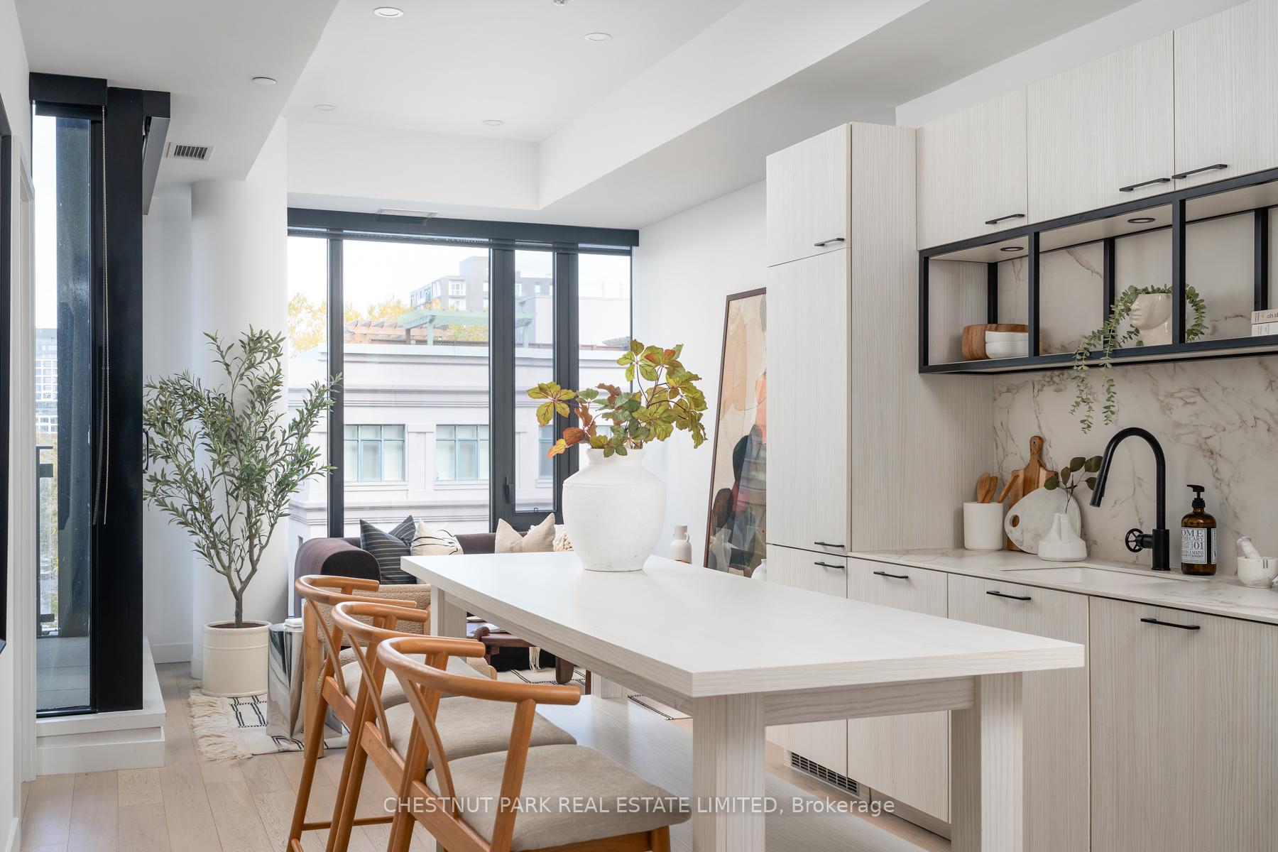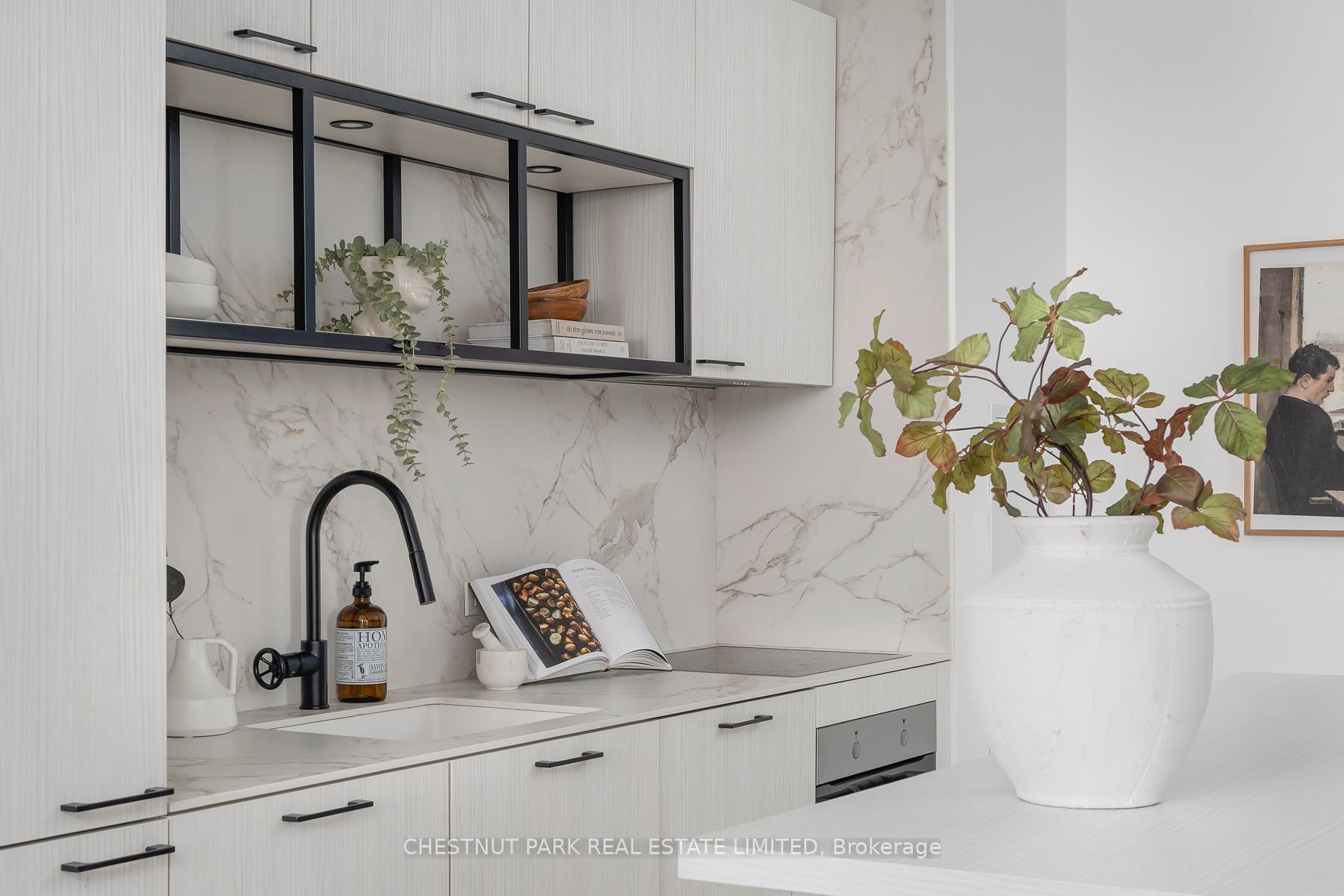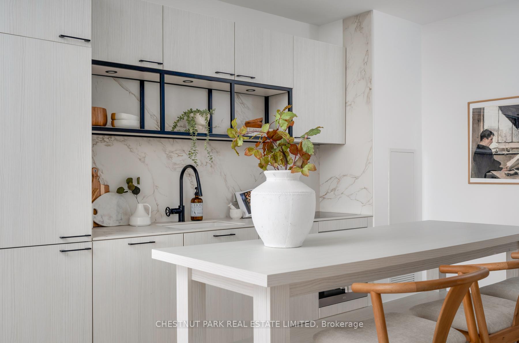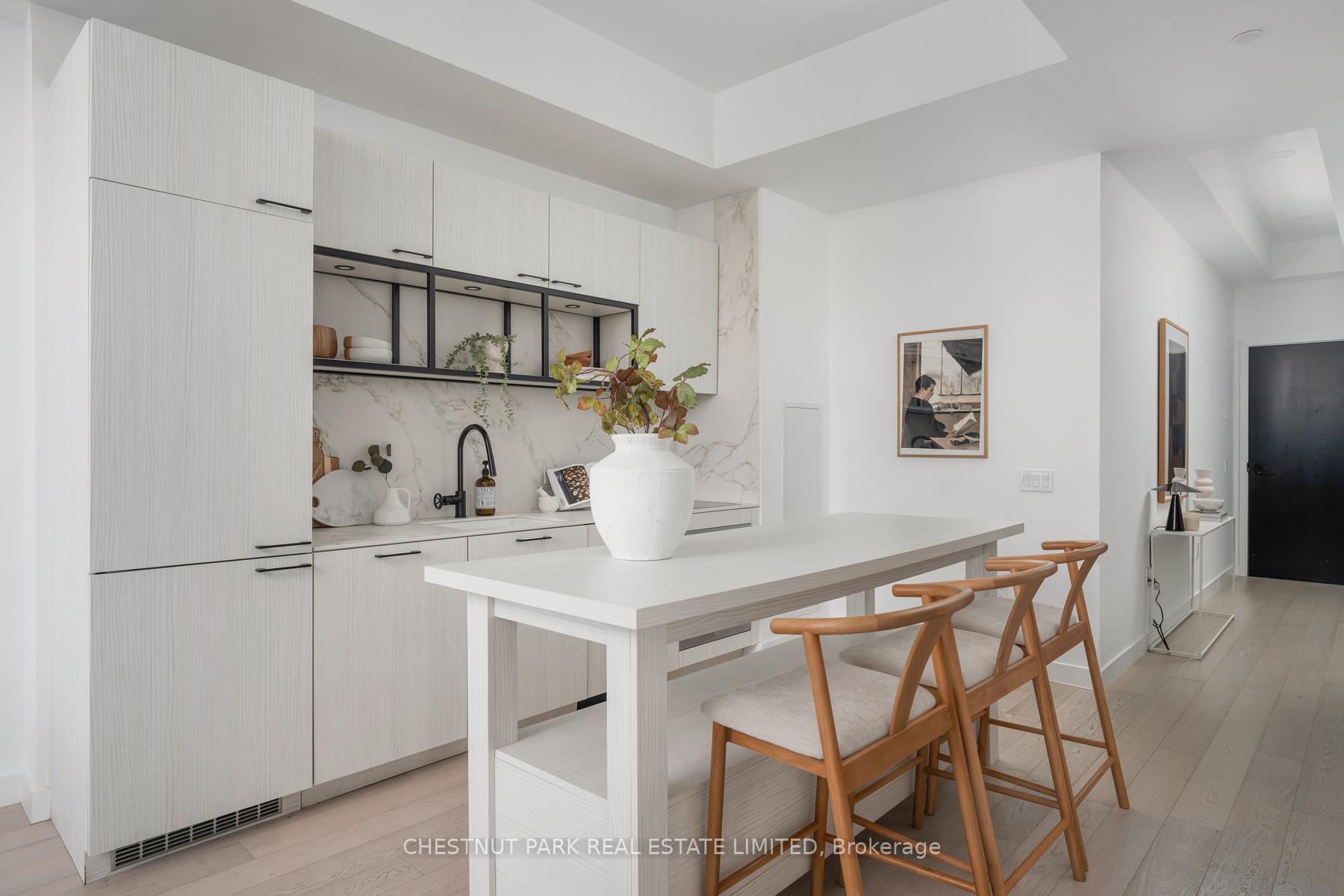 Set within the landmark Waterworks Residences, Suite 414 offers a serene urban retreat above St. Andrew's Park. This 1+1 bedroom, 1 bathroom layout combines just under 700 square feet of interior living with a 112 square-foot northwest-facing terrace, an elegant expression of downtown livability. Ten-foot ceilings, floor-to-ceiling windows, and motorized blinds draw natural light deep into the home, while lighter finishes enhance openness and flow. At its centre, a custom Cecconi Simone kitchen anchors the open-concept plan, featuring Dekton surfaces, full-height millwork, and integrated appliances that unite form and function with quiet precision. The primary bedroom is proportioned for comfort, offering his-and-hers closets and a three-piece semi-ensuite finished in stone and glass. The enclosed den, privately positioned near the entry, transitions naturally into a guest suite or workspace, reflecting the versatility of contemporary living.The northwest terrace extends the living space outdoors, ideal for late-day sun and evening gatherings. Additional features include in-suite laundry, one parking space, and a private locker, offering practical convenience within a refined setting.Residents enjoy access to a state-of-the-art YMCA with 25-metre pool and fitness centre, rooftop terraces, private dining and lounge spaces, and the celebrated Food Hall Toronto within the restored Great Hall. Moments from Queen West, Spadina, and the Financial Core, Suite 414 captures the balance of design, light, and heritage that defines Waterworks.