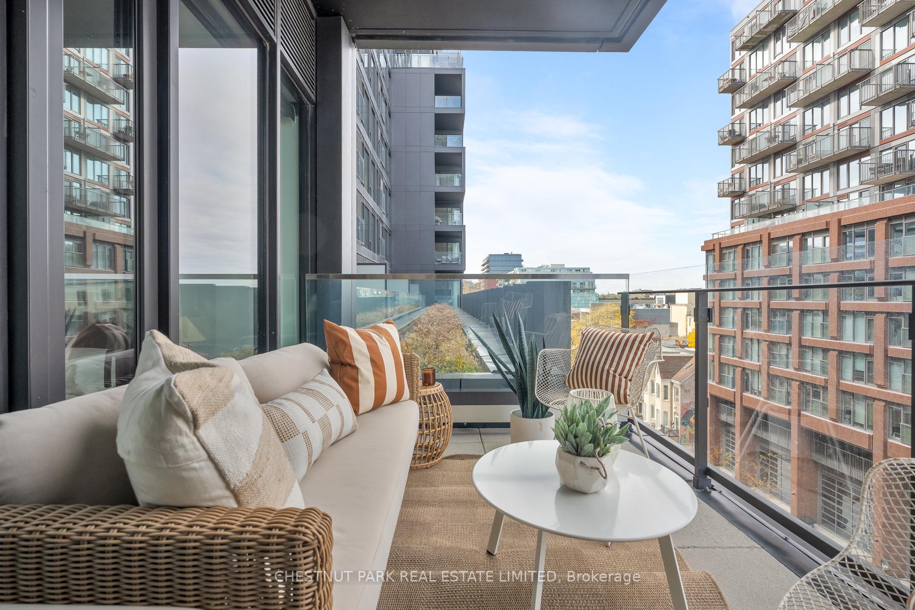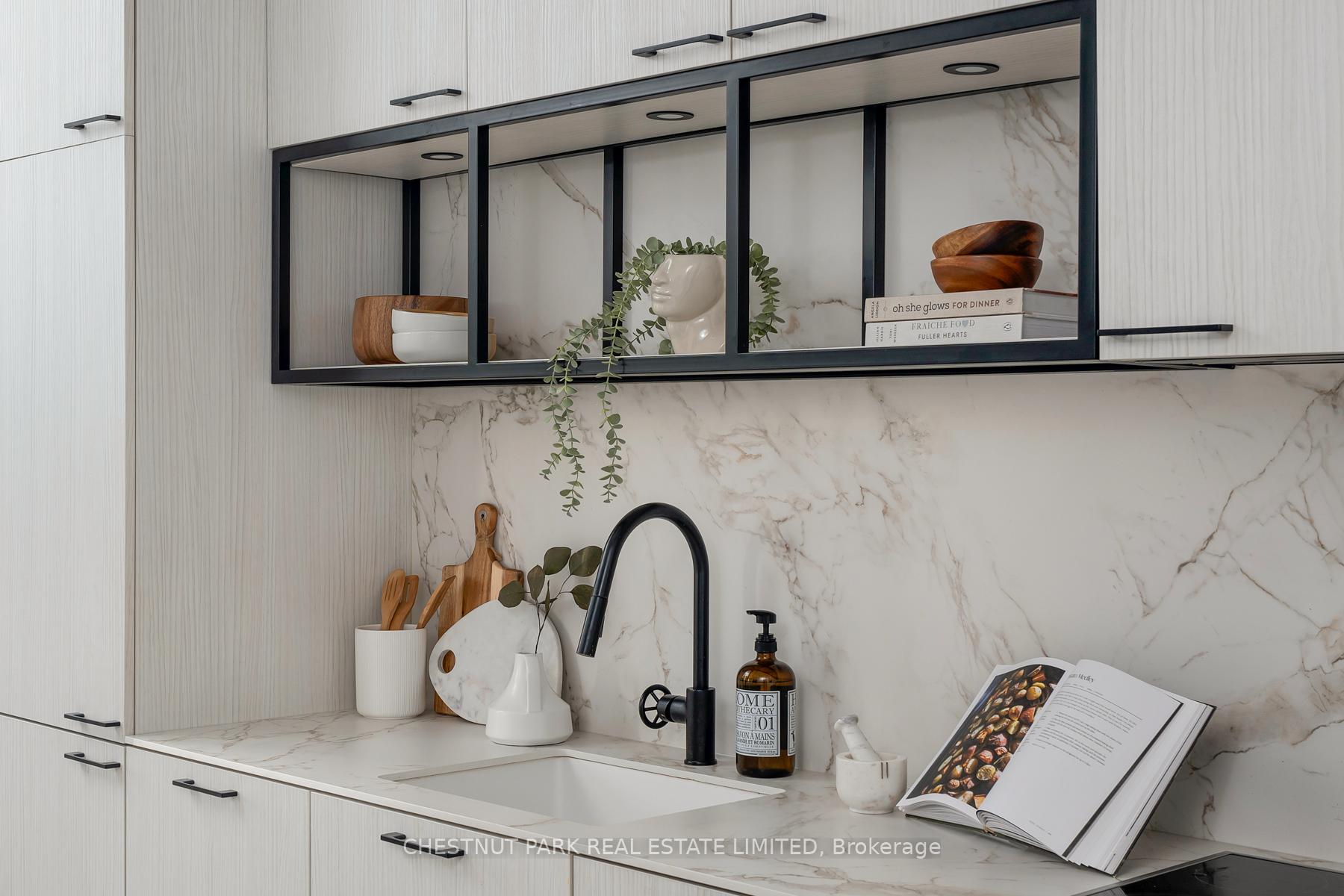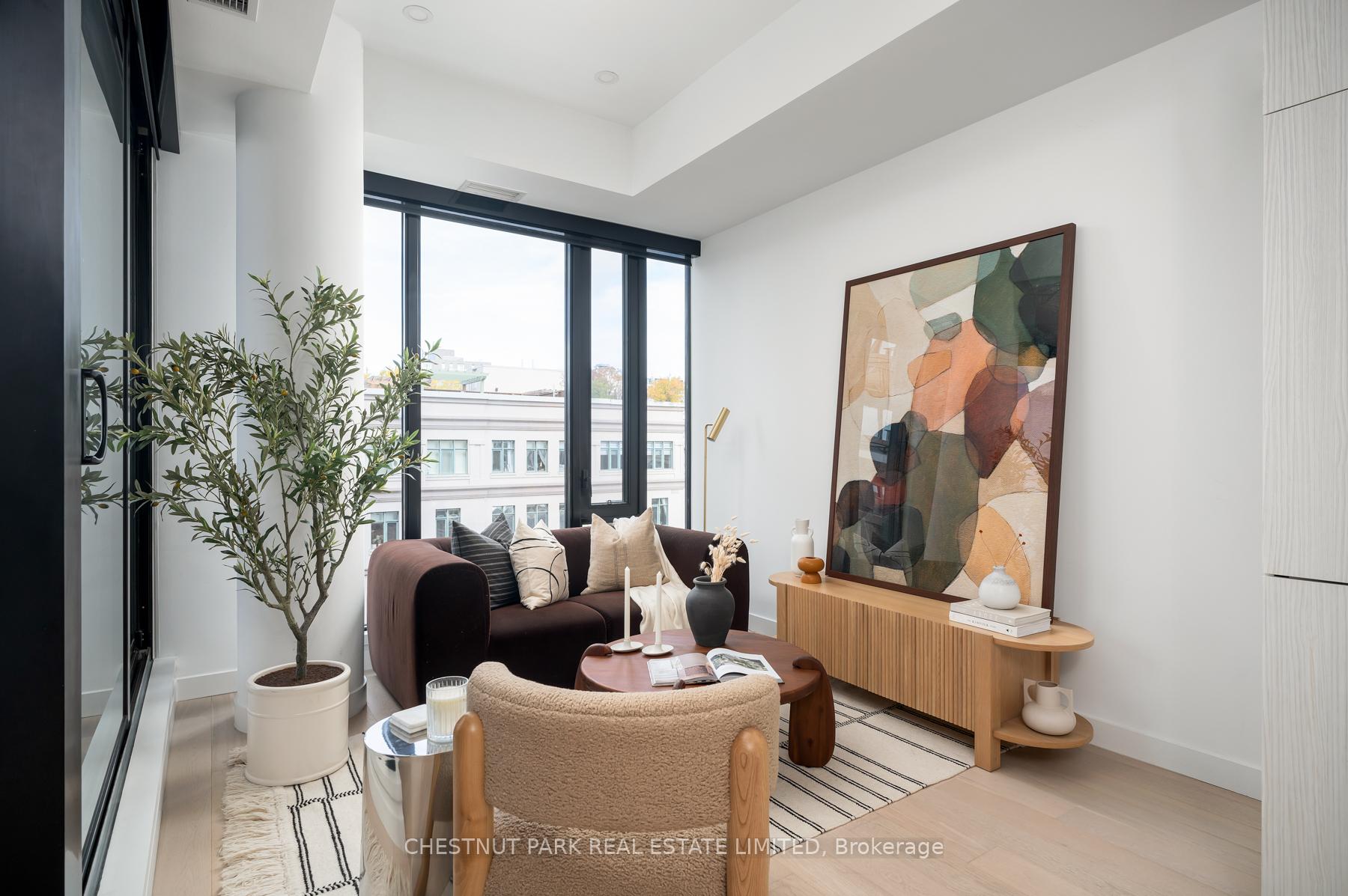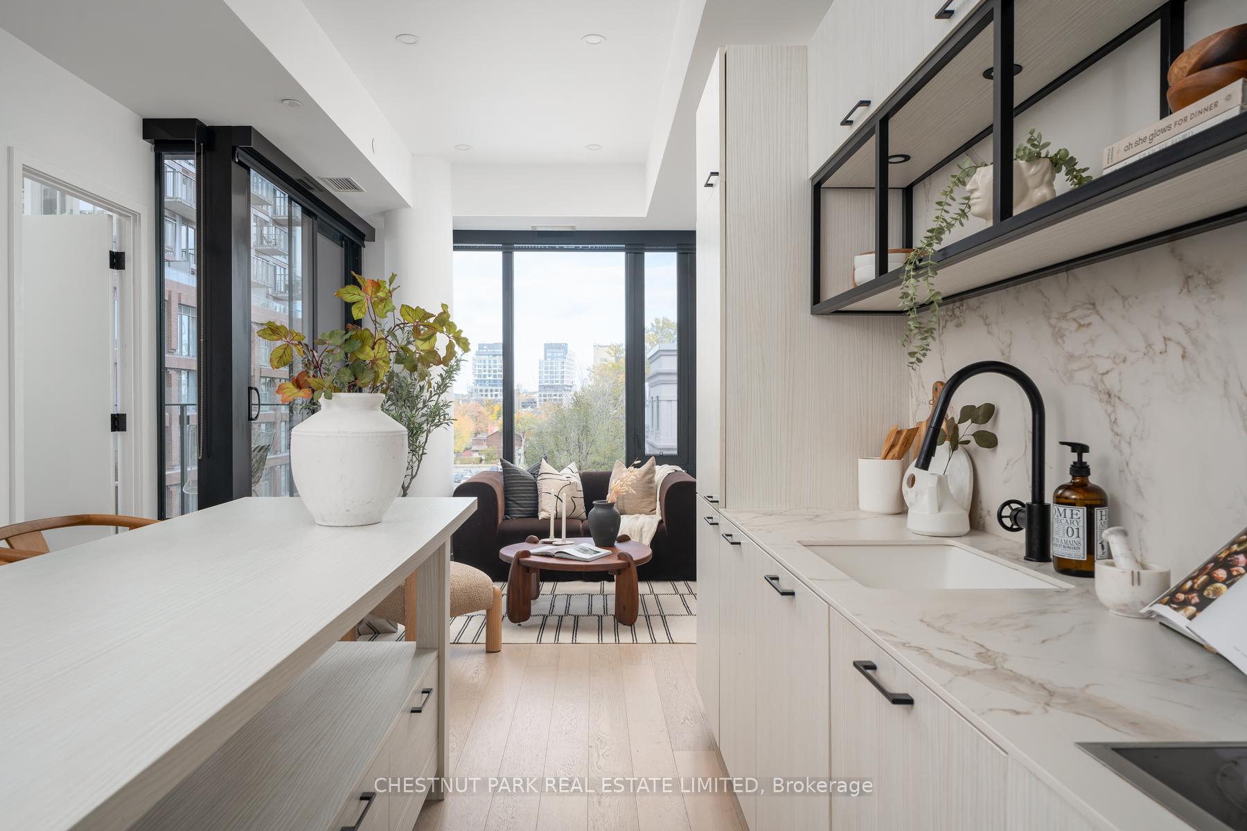 Set within the landmark Waterworks Residences, Suite 414 offers a serene urban retreat above St. Andrew's Park. This 1+1 bedroom, 1 bathroom layout combines just under 700 square feet of interior living with a 112 square-foot northwest-facing terrace, an elegant expression of downtown livability. Ten-foot ceilings, floor-to-ceiling windows, and motorized blinds draw natural light deep into the home, while lighter finishes enhance openness and flow. At its centre, a custom Cecconi Simone kitchen anchors the open-concept plan, featuring Dekton surfaces, full-height millwork, and integrated appliances that unite form and function with quiet precision. The primary bedroom is proportioned for comfort, offering his-and-hers closets and a three-piece semi-ensuite finished in stone and glass. The enclosed den, privately positioned near the entry, transitions naturally into a guest suite or workspace, reflecting the versatility of contemporary living.The northwest terrace extends the living space outdoors, ideal for late-day sun and evening gatherings. Additional features include in-suite laundry, one parking space, and a private locker, offering practical convenience within a refined setting.Residents enjoy access to a state-of-the-art YMCA with 25-metre pool and fitness centre, rooftop terraces, private dining and lounge spaces, and the celebrated Food Hall Toronto within the restored Great Hall. Moments from Queen West, Spadina, and the Financial Core, Suite 414 captures the balance of design, light, and heritage that defines Waterworks.