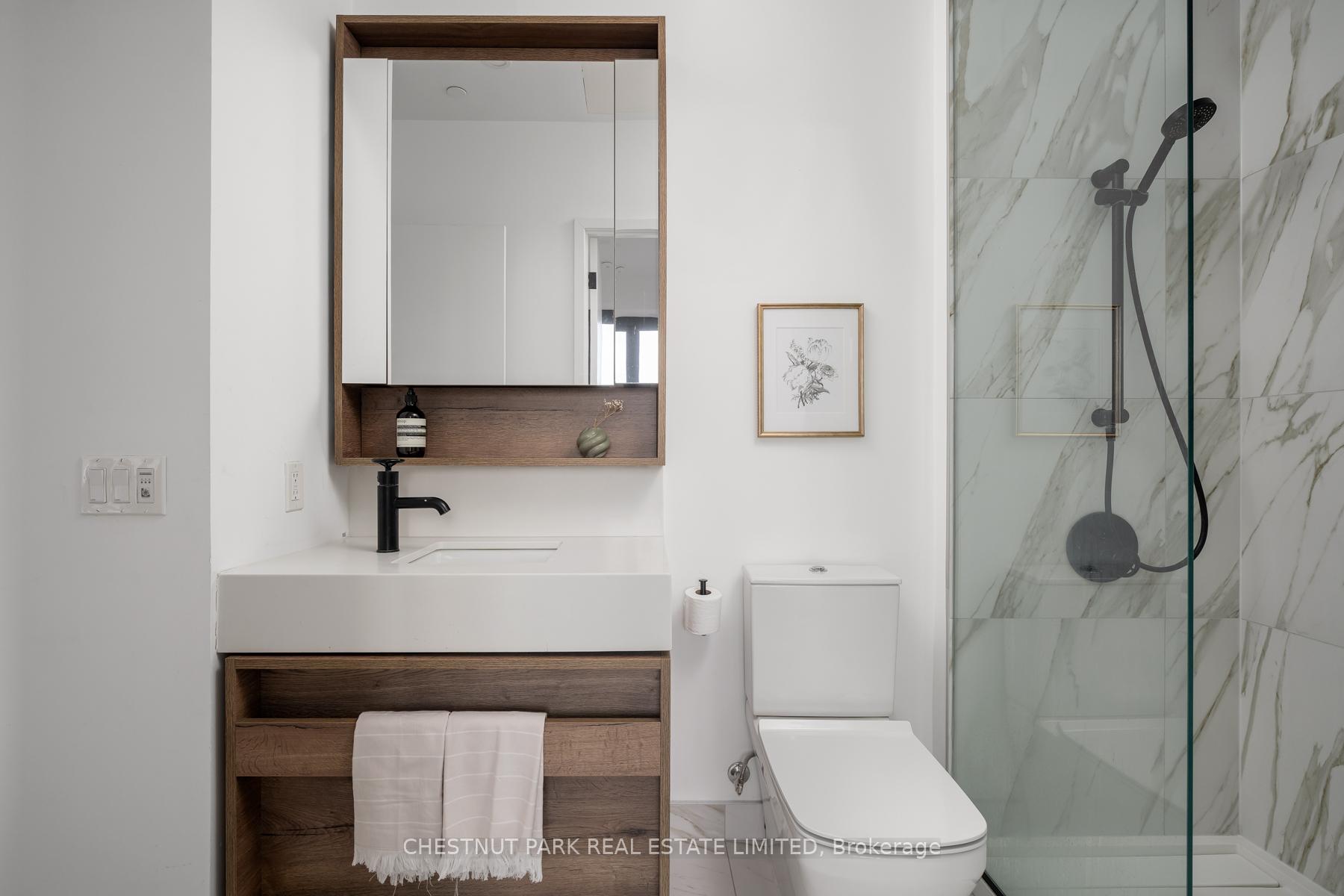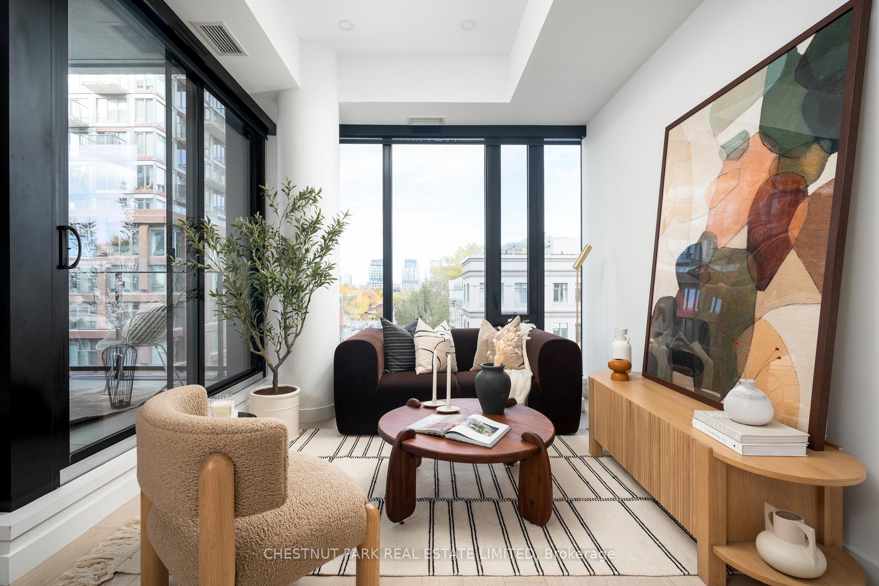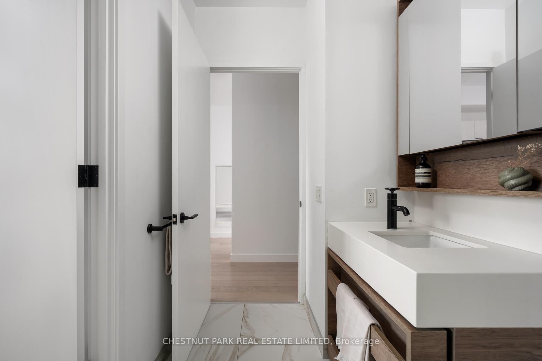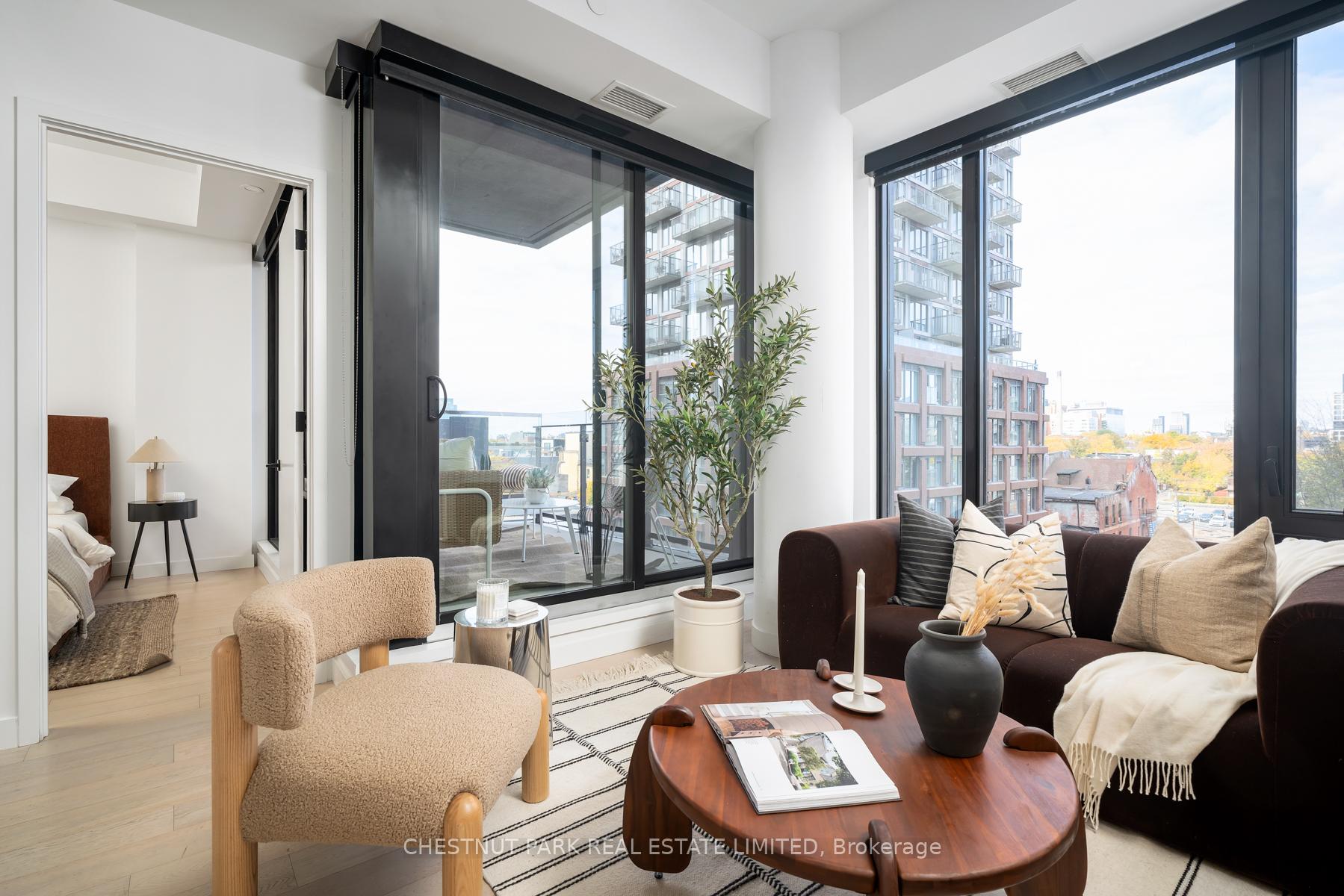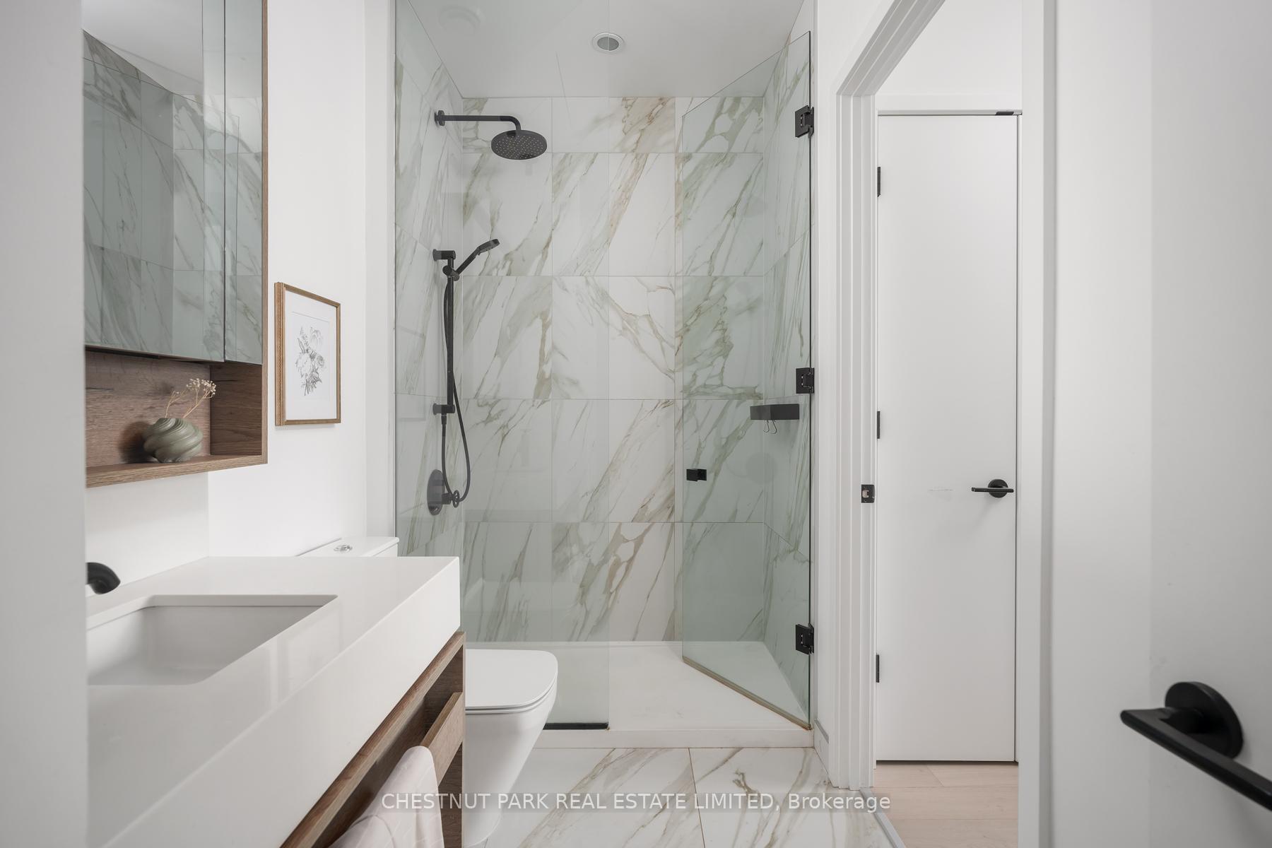Set within the landmark Waterworks Residences, Suite 414 offers a serene urban retreat above St. Andrew's Park. This 1+1 bedroom, 1 bathroom layout combines just under 700 square feet of interior living with a 112 square-foot northwest-facing terrace, an elegant expression of downtown livability. Ten-foot ceilings, floor-to-ceiling windows, and motorized blinds draw natural light deep into the home, while lighter finishes enhance openness and flow. At its centre, a custom Cecconi Simone kitchen anchors the open-concept plan, featuring Dekton surfaces, full-height millwork, and integrated appliances that unite form and function with quiet precision. The primary bedroom is proportioned for comfort, offering his-and-hers closets and a three-piece semi-ensuite finished in stone and glass. The enclosed den, privately positioned near the entry, transitions naturally into a guest suite or workspace, reflecting the versatility of contemporary living.The northwest terrace extends the living space outdoors, ideal for late-day sun and evening gatherings. Additional features include in-suite laundry, one parking space, and a private locker, offering practical convenience within a refined setting.Residents enjoy access to a state-of-the-art YMCA with 25-metre pool and fitness centre, rooftop terraces, private dining and lounge spaces, and the celebrated Food Hall Toronto within the restored Great Hall. Moments from Queen West, Spadina, and the Financial Core, Suite 414 captures the balance of design, light, and heritage that defines Waterworks.