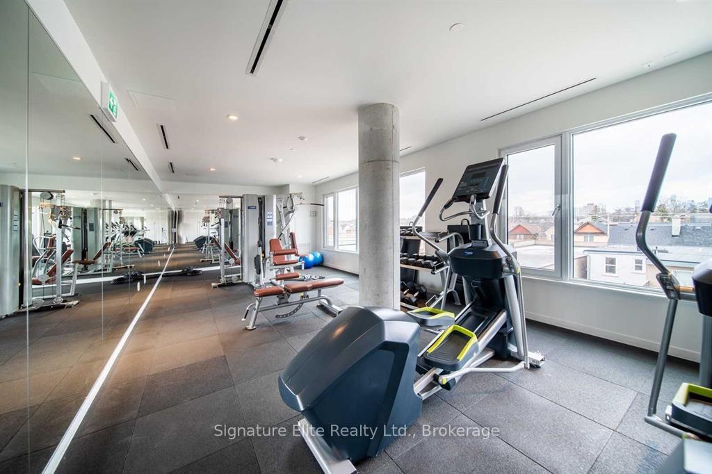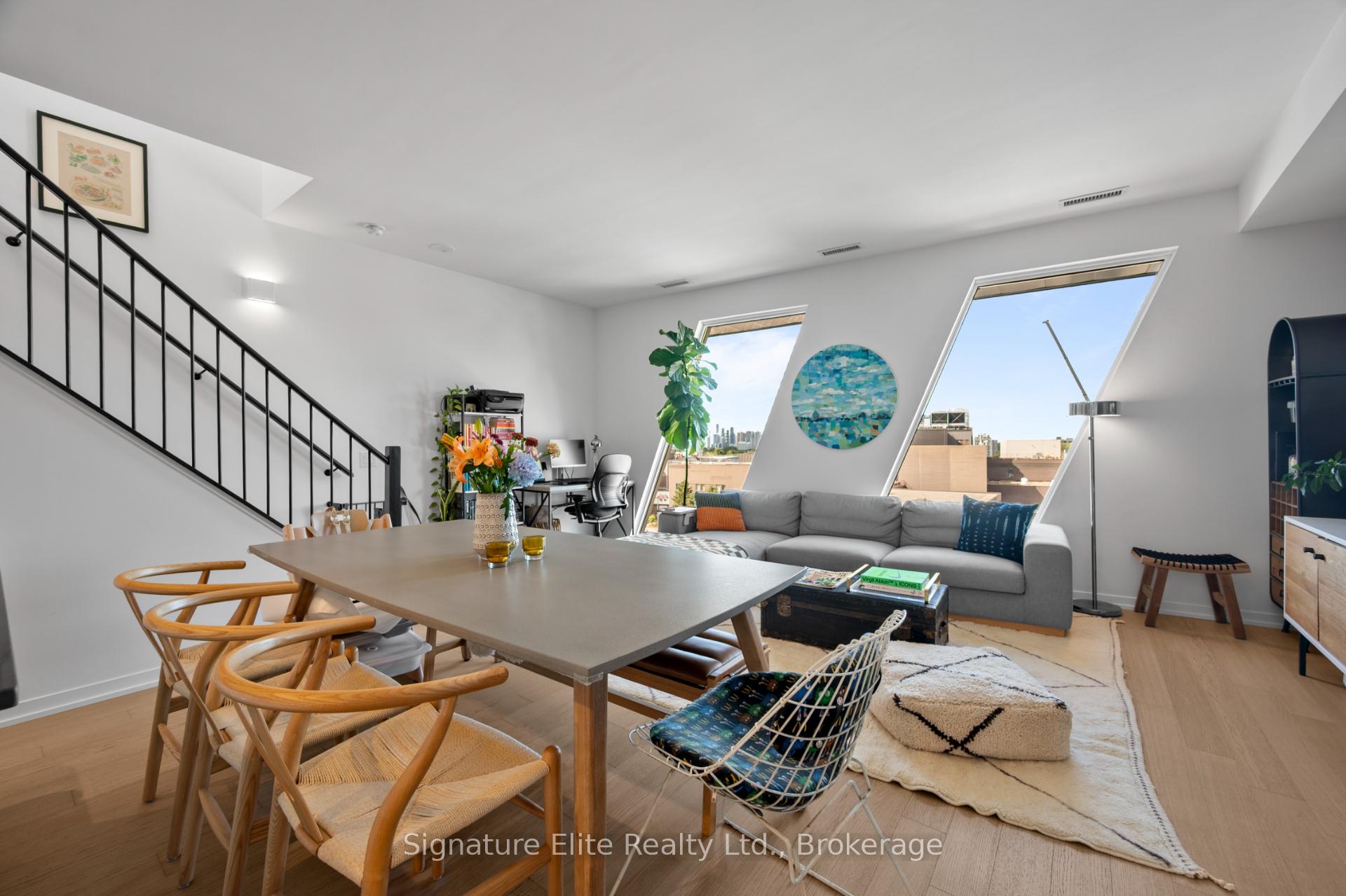 Experience Elevated Urban Living. Discover modern elegance in this stunning two storey penthouse loft at Enigma on the Park, a boutique residence surrounded by serene green space. This spacious suite features soaring nine foot ceilings, a skylight, and an open concept design filled with natural light. The gourmet kitchen offers a large island, gas range, and soft close cabinetry. The primary suite includes a spa inspired four piece ensuite, walk in closet, and a private terrace with lake views and beautiful southwestern sunsets. Queen-sized second bedroom with dresser and double closet! Three bathrooms, and two terraces, this home offers exceptional comfort and style. Additional highlights include upper level laundry, parking, locker, and proximity to top rated schools. Steps to MacGregor Park and minutes to the subway, GO Train, and UP Express. Enjoy a vibrant lifestyle close to Dundas West shops, cafes, and restaurants.