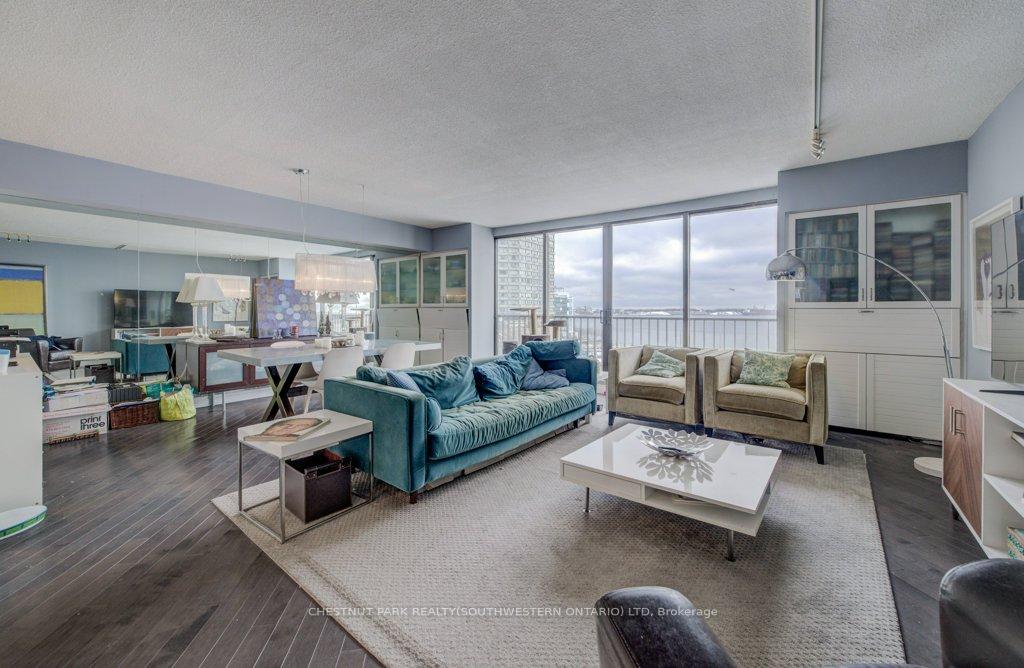 Welcome to Harbour Square Condos - where luxury living meets unforgettable lakefront views! This exceptional 2-bedroom plus den, 2-bathroom split-level suite offers approximately 1,400 sq. ft. of thoughtfully designed living space, highlighted by unobstructed south-facing views of Lake Ontario from nearly every room. The expansive open-concept living and dining area features gleaming hardwood floors and seamlessly flows into a well-appointed kitchen, complete with a breakfast bar ideal for casual dining or entertaining. Upstairs, the private primary bedroom boasts panoramic lake vistas and a 4-piece ensuite bath. A second spacious bedroom and a versatile den-perfect for a home office, guest room, or reading nook-provide added comfort and flexibility. Harbour Square offers a true resort-style lifestyle with unmatched amenities, including a 24-hour concierge, fitness centre, indoor pool, saunas, squash courts, party rooms, and a rooftop terrace with BBQs, gardens, and a private park. Additional conveniences include guest parking, a car wash, on-site management, and a complimentary downtown shuttle service. The building also features a secure underground connection to the Harbour Castle Hotel for easy year-round access. Situated just steps from the waterfront boardwalk, ferry terminal, restaurants, shopping, schools, and transit, this is premier downtown lakefront living-without the 2-3 hour drive to the cottage. A rare opportunity to enjoy Toronto's waterfront at its finest.