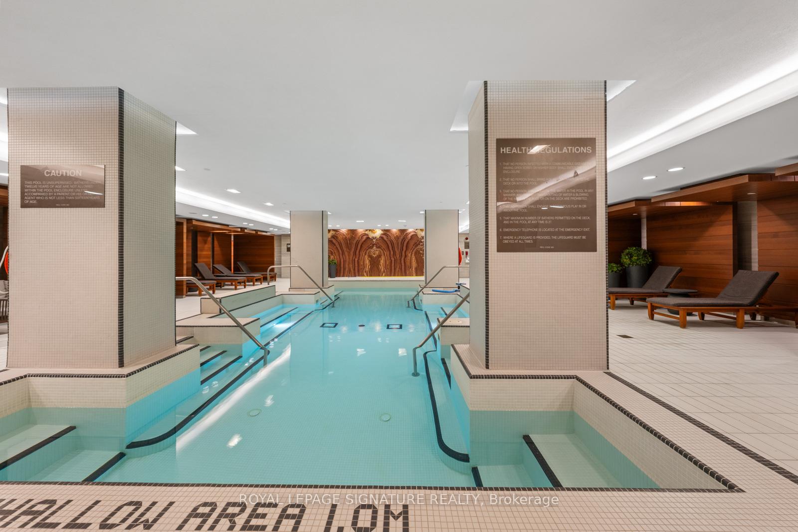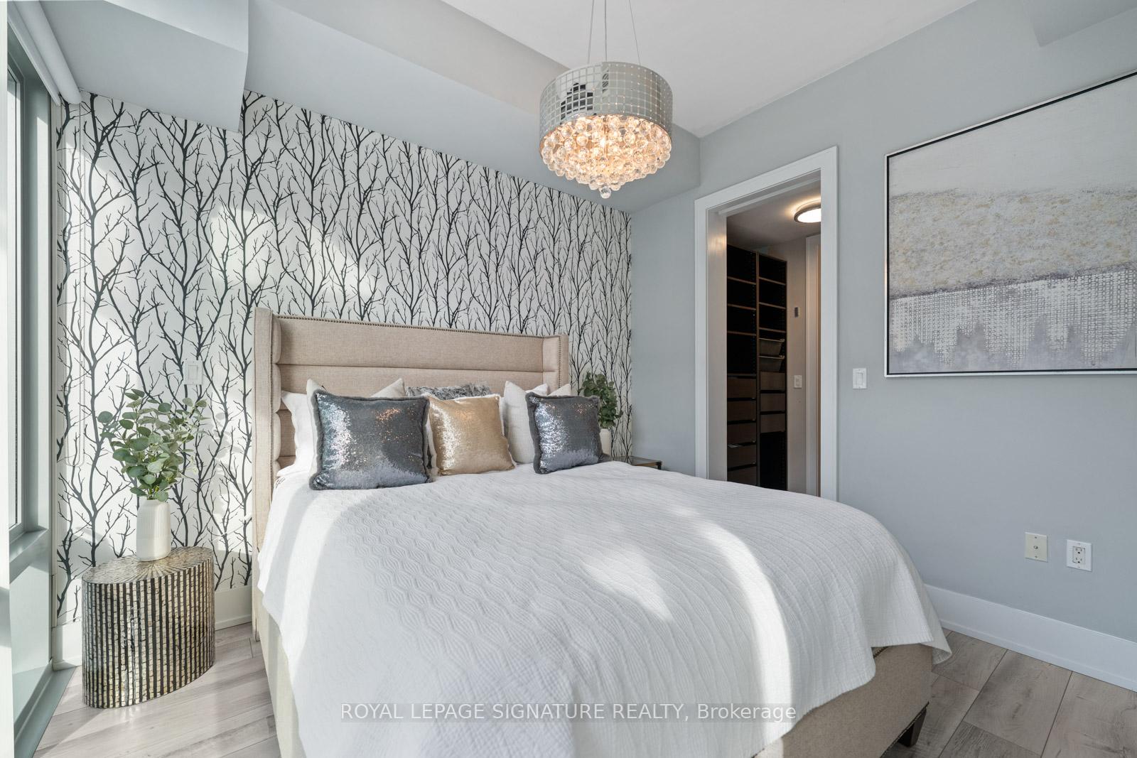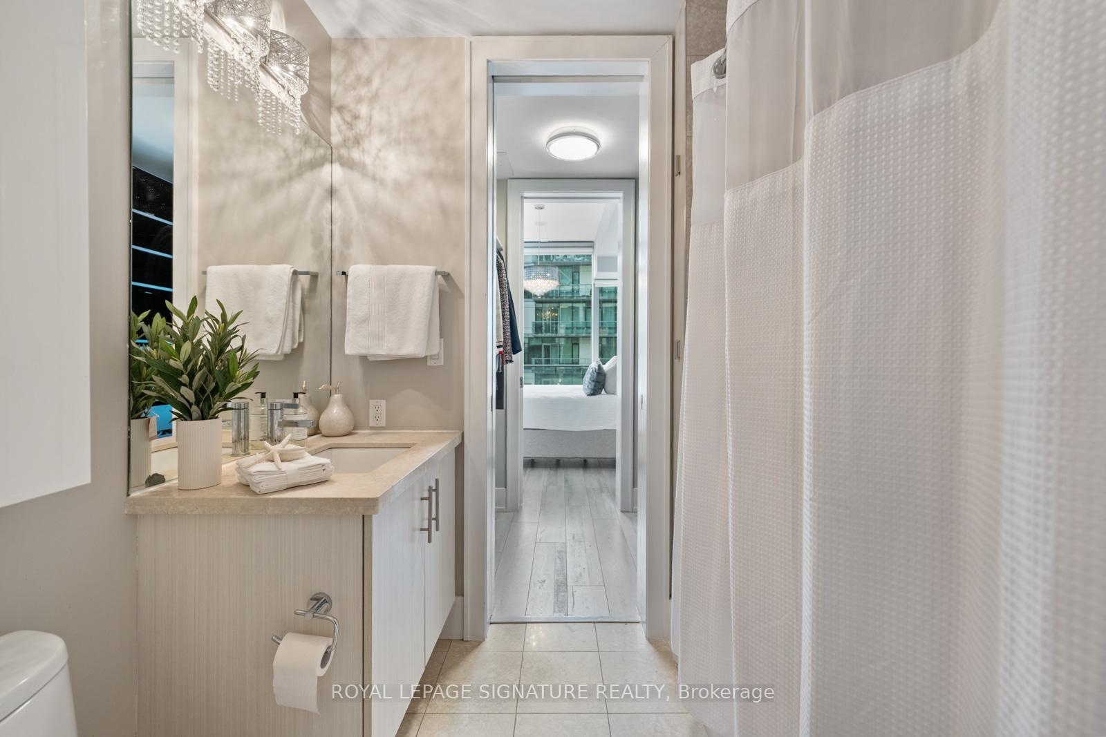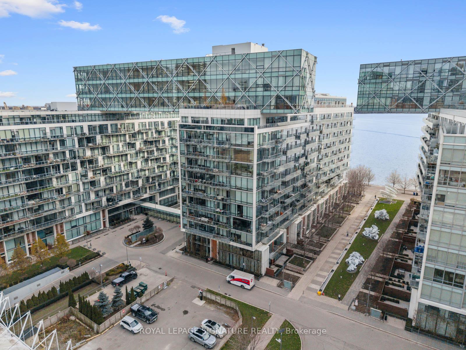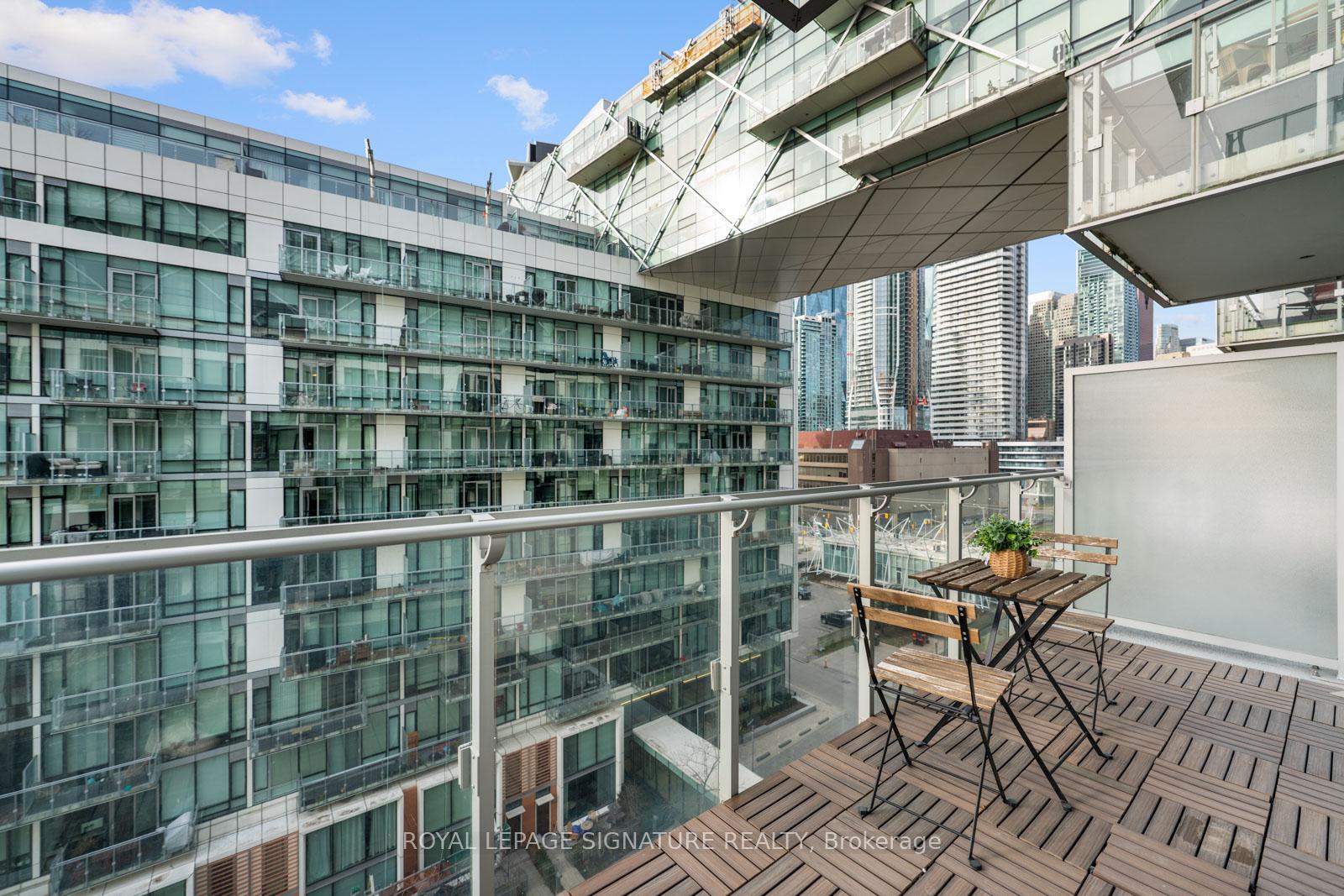 Perched on the 8th floor of a sought-after waterfront address, this one-bedroom plus den residence delivers an unparalleled urban living experience. Expansive windows frame stunning views of Lake Ontario and Toronto's iconic skyline, creating a dynamic backdrop for your everyday life. The spacious living area, enhanced by 10-foot ceilings and laminated floors, offers the flexibility to design your ideal setting, whether that's a cozy reading corner or an inviting entertainment space. The impressive chef-inspired kitchen features integrated Miele appliances, a Sub-Zero refrigerator, Quartz countertops, a glass-tile backsplash, and upgraded cabinetry, making meal prep both stylish and efficient. The tranquil bedroom offers a view of Lake Ontario, a serene retreat with ample, customized closet space, while the spa-like bathroom features a luxurious soaker tub/versatile shower, and a wall/built-in cabinet. Thoughtful upgrades include customized closet systems, designer LED lighting, a smart home thermostat, an in-suite alarm system, and motorized blackout blinds. Beyond your private sanctuary, the building offers exceptional wellness-focused amenities, including a fully equipped gym, indoor and outdoor pools, a sauna, a recreational room, guest suites, a party room, a game room, and dedicated treatment rooms. Neighborhood Highlights Grocery: Loblaws (600m), Farm Boy (400m), Kitchen Table (450m), St. Lawrence Market (1.1km)Transit: Union Station (1.2km), Union Station Bus Terminal (850m), Jack Layton Ferry Terminal (600m), Billy Bishop Airport(3km)Entertainment: Scotiabank Arena (900m), Meridian Hall (1km), Harbourfront Centre (1km), Rogers Centre (1.3km)Attractions: Toronto Music Garden (1.8km), Sugar Beach (600m)Embrace the vibrant waterfront lifestyle and elevate your everyday living in this sophisticated urban sanctuary.