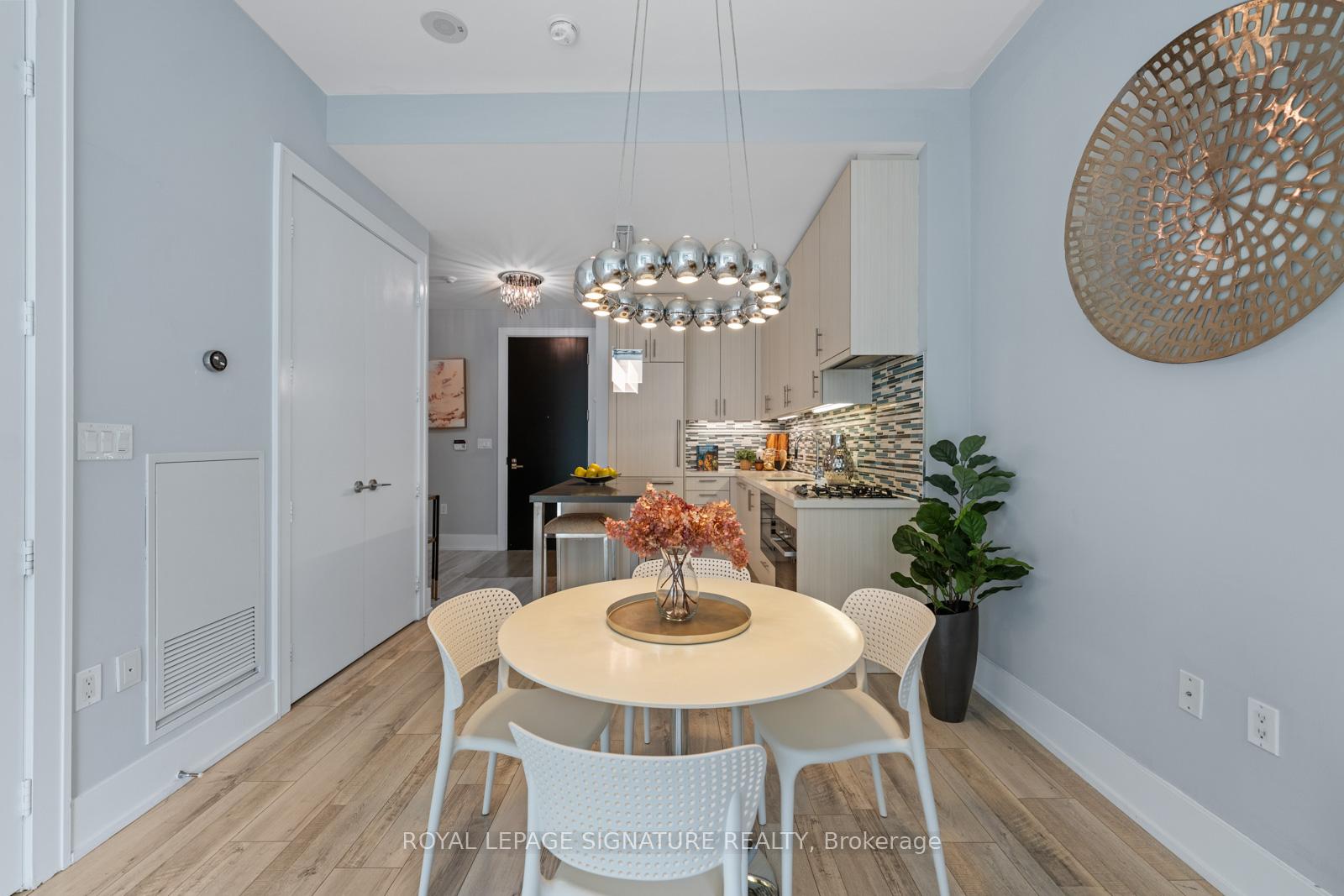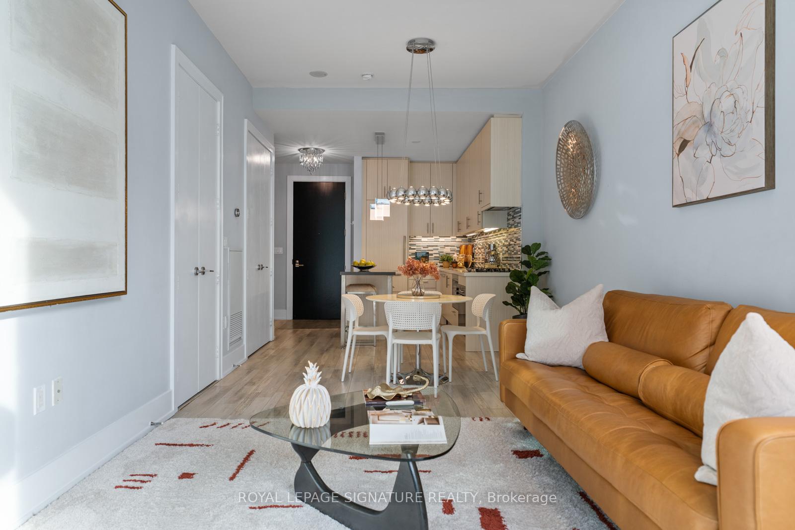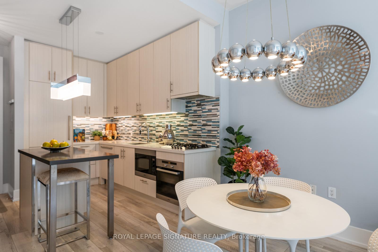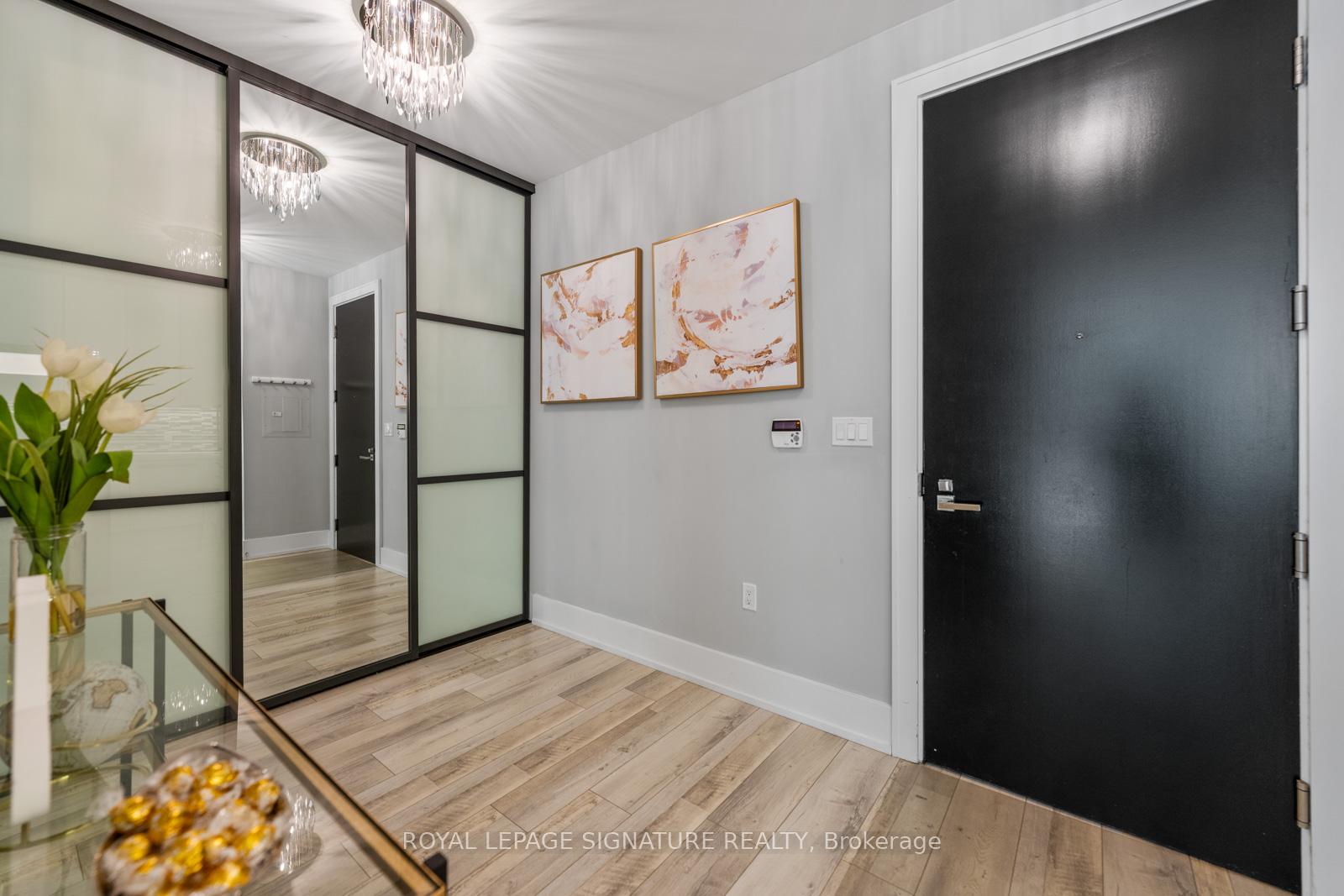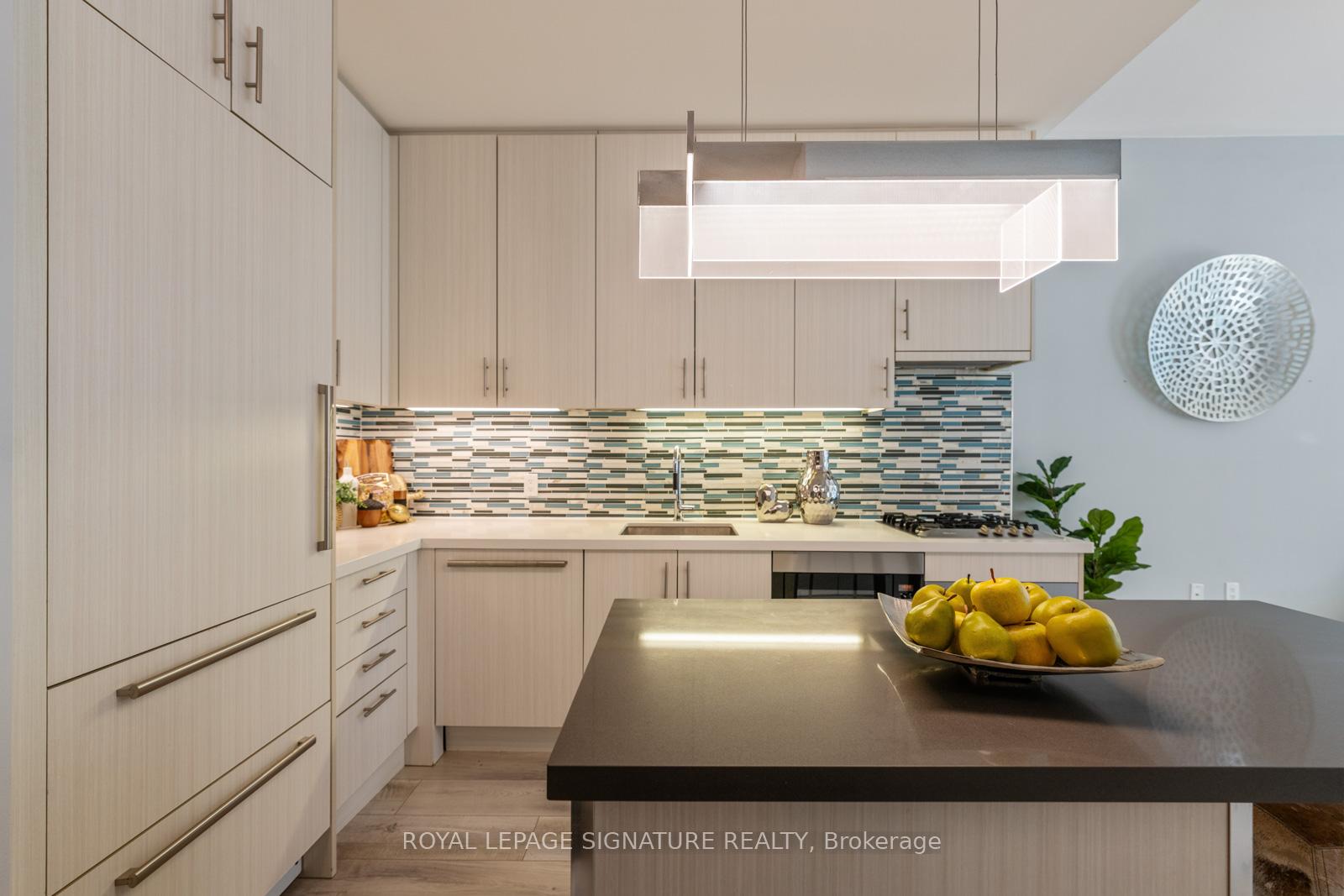 Perched on the 8th floor of a sought-after waterfront address, this one-bedroom plus den residence delivers an unparalleled urban living experience. Expansive windows frame stunning views of Lake Ontario and Toronto's iconic skyline, creating a dynamic backdrop for your everyday life. The spacious living area, enhanced by 10-foot ceilings and laminated floors, offers the flexibility to design your ideal setting, whether that's a cozy reading corner or an inviting entertainment space. The impressive chef-inspired kitchen features integrated Miele appliances, a Sub-Zero refrigerator, Quartz countertops, a glass-tile backsplash, and upgraded cabinetry, making meal prep both stylish and efficient. The tranquil bedroom offers a view of Lake Ontario, a serene retreat with ample, customized closet space, while the spa-like bathroom features a luxurious soaker tub/versatile shower, and a wall/built-in cabinet. Thoughtful upgrades include customized closet systems, designer LED lighting, a smart home thermostat, an in-suite alarm system, and motorized blackout blinds. Beyond your private sanctuary, the building offers exceptional wellness-focused amenities, including a fully equipped gym, indoor and outdoor pools, a sauna, a recreational room, guest suites, a party room, a game room, and dedicated treatment rooms. Neighborhood Highlights Grocery: Loblaws (600m), Farm Boy (400m), Kitchen Table (450m), St. Lawrence Market (1.1km)Transit: Union Station (1.2km), Union Station Bus Terminal (850m), Jack Layton Ferry Terminal (600m), Billy Bishop Airport(3km)Entertainment: Scotiabank Arena (900m), Meridian Hall (1km), Harbourfront Centre (1km), Rogers Centre (1.3km)Attractions: Toronto Music Garden (1.8km), Sugar Beach (600m)Embrace the vibrant waterfront lifestyle and elevate your everyday living in this sophisticated urban sanctuary.