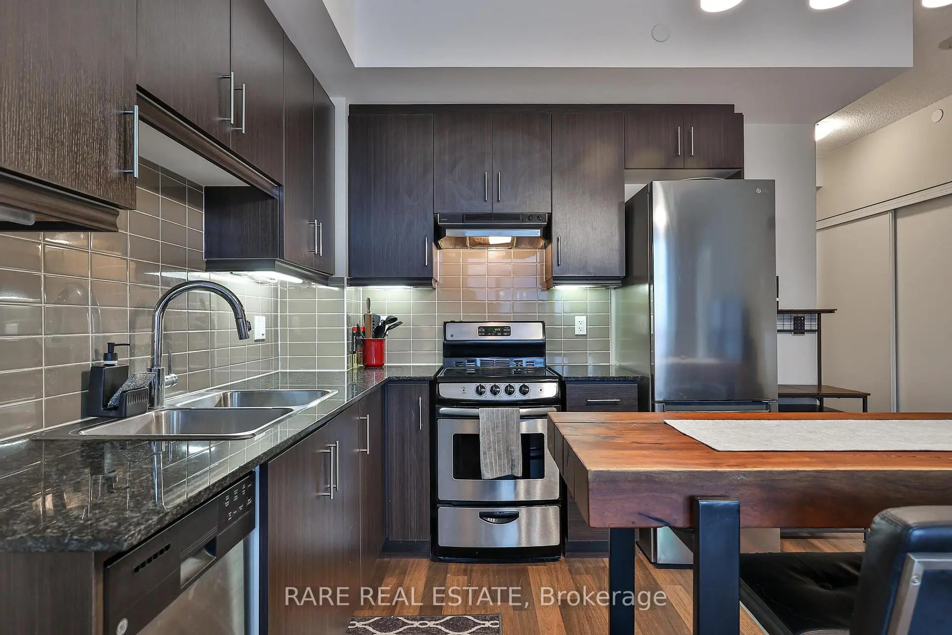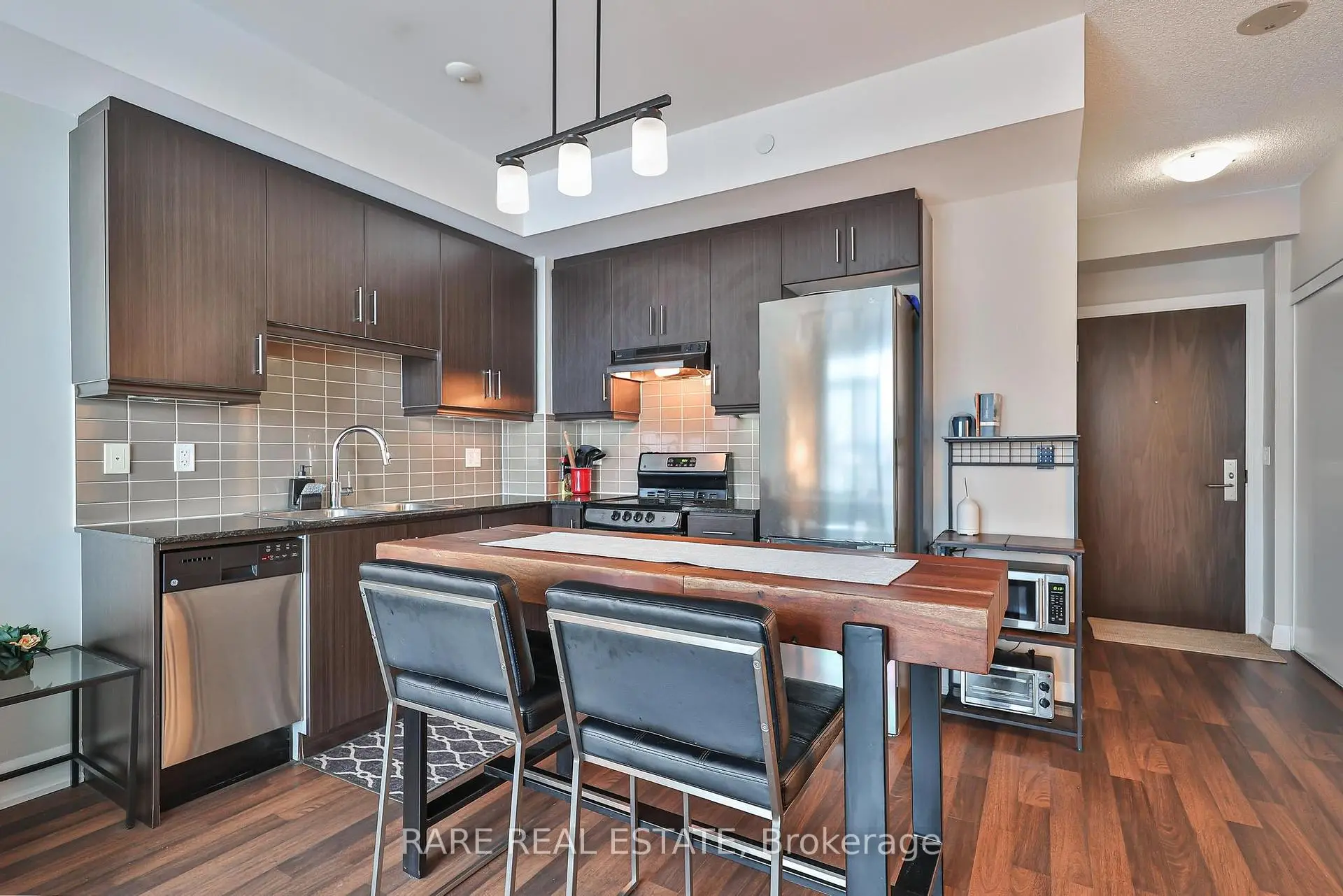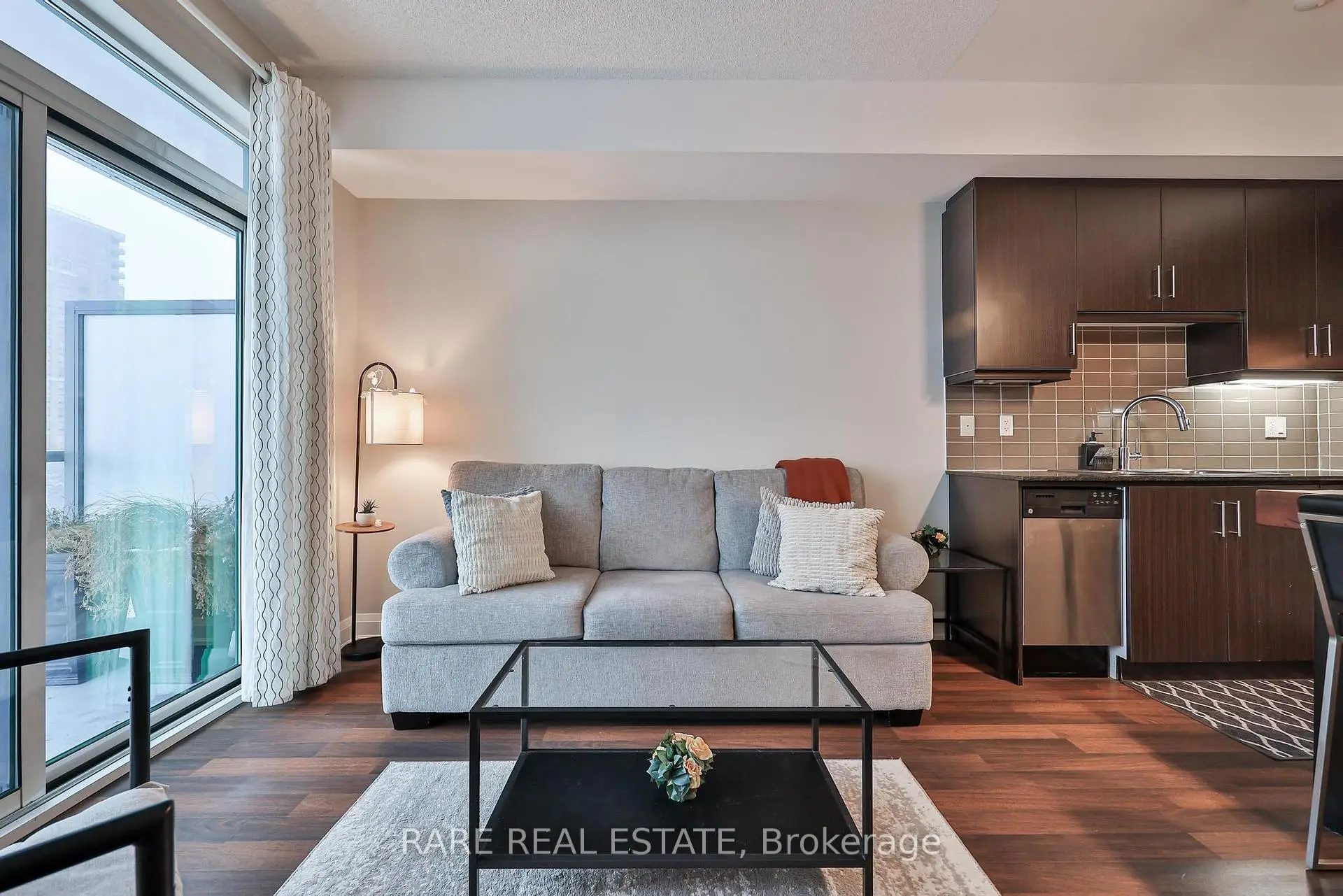 Welcome to this sun-filled one-bedroom residence in the desirable Willowdale community offering 531 square feet of thoughtfully designed living space with unobstructed views through expansive windows. The open-concept layout is enhanced by warm flooring and traditional cabinetry - a seamless flow between living and dining areas. The living area extends naturally to a private balcony overlooking the large terrace, creating an airy indoor-outdoor connection with your home and your community flooding an abundance of natural light throughout the day at Canterbury Place - tucked away in the quiet neighbourhood of busy Willowdale near highways and all the shops! The modern kitchen is both functional and stylish, featuring full-size stainless steel appliances, ample cabinetry, and a generous centre island that provides additional prep space and seating-ideal for everyday living or entertaining. The bedroom is generously sized with a comfortable layout and excellent storage, while the bathroom is finished with clean, contemporary touches. Located in a well-managed building within a vibrant neighbourhood with ample amenities, this bright and inviting home offers a perfect balance of comfort, light, and functionality for that first step into home ownership or the ideal investor.