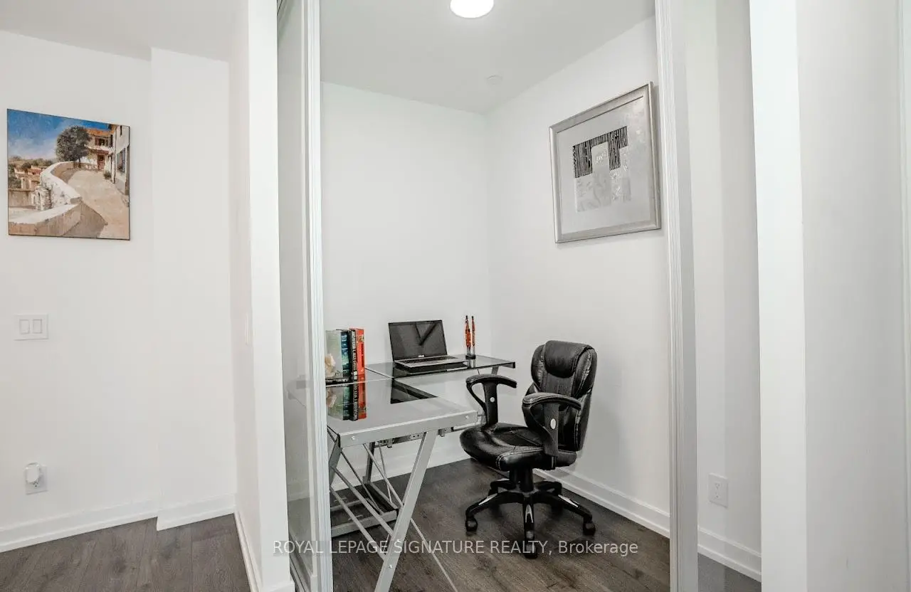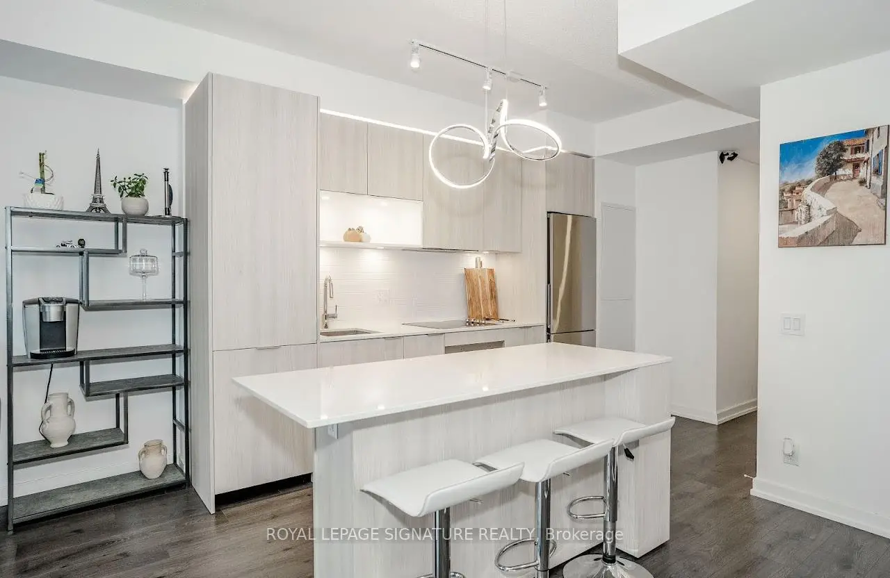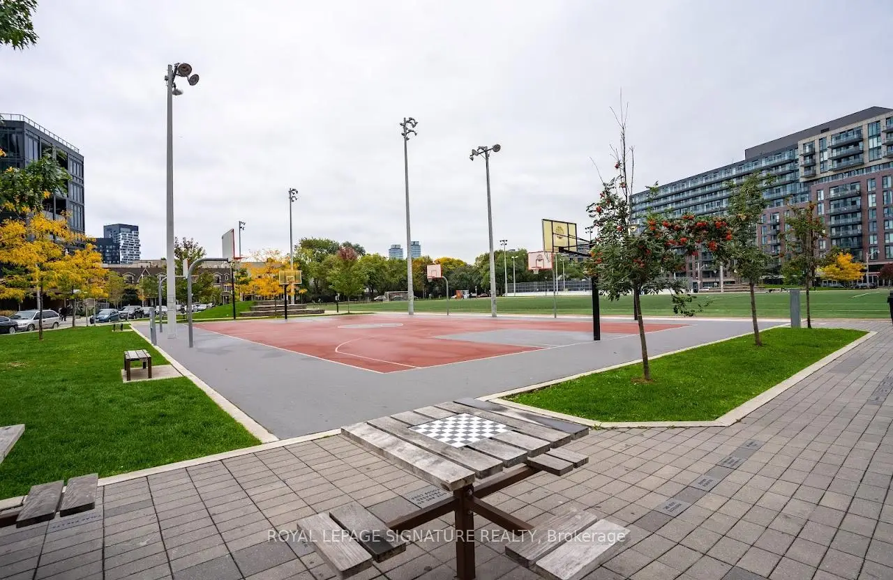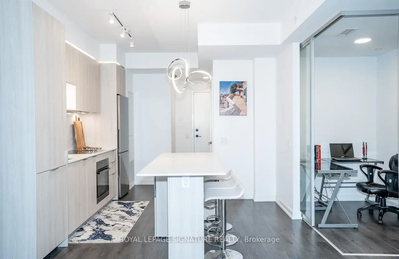 Welcome to "The Wyatt" by Daniel Corp. Modern, Bright and Sleek 1+ Den/Office Unit With 1 Parking Space and 1 Storage. Functional and Well Designed Layout With 9 foot Ceiling, Laminate Flooring Throughout, Huge Windows Flood The Space With Natural Light. Freshly Updated Unit Presents Like New, Featuring Professional Repainting And Detailed Touch-Ups. Modern Upgraded Kitchen With Centre Island, Quartz Countertops, Cabinet Lighting, and Built-In Stainless Appliances. The Unit Boasts a Massive Balcony Overlooking Clear South-West City And Park Views. Amazing Amenities Include Gym, Party Room, Roof Top Terrace, BBQ's, Rock Climbing Room and Lounge. Steps From TTC Streetcars, Easy Access To DVP, Community Centre, Soccer Field, Basketball Court, Aquatic Centre and Parks all in Walking Distance. Great Opportunity To Live Or Invest In Great Community In Regent Park.