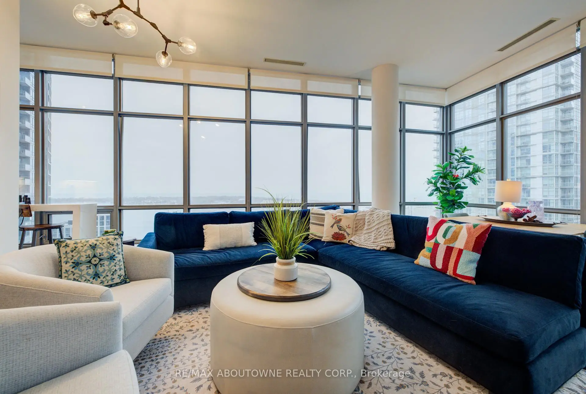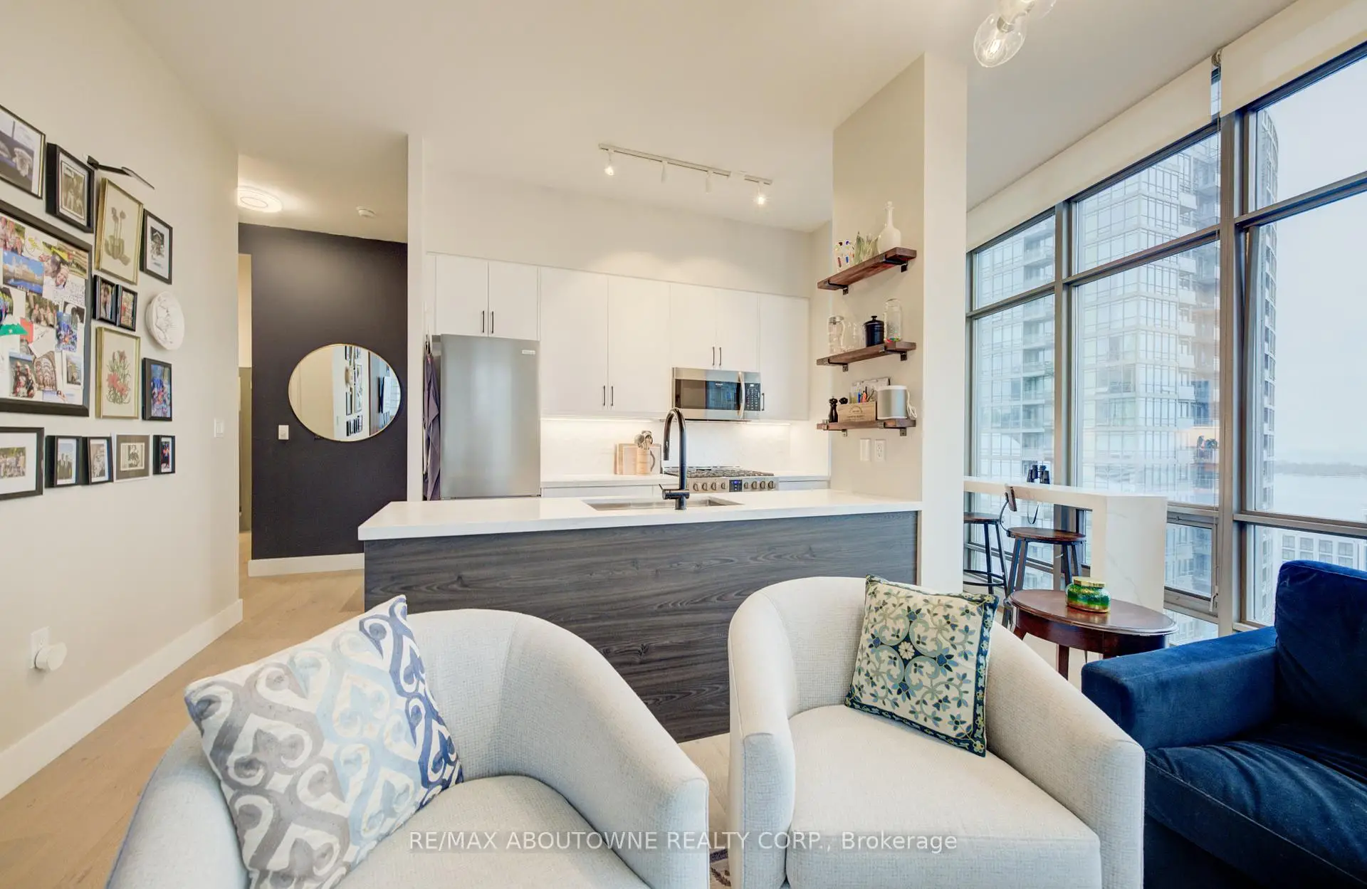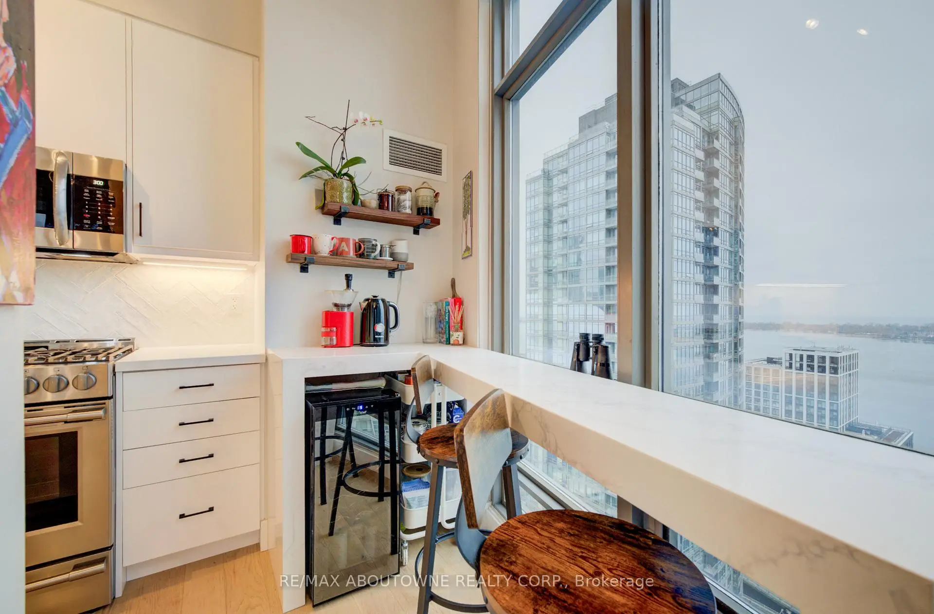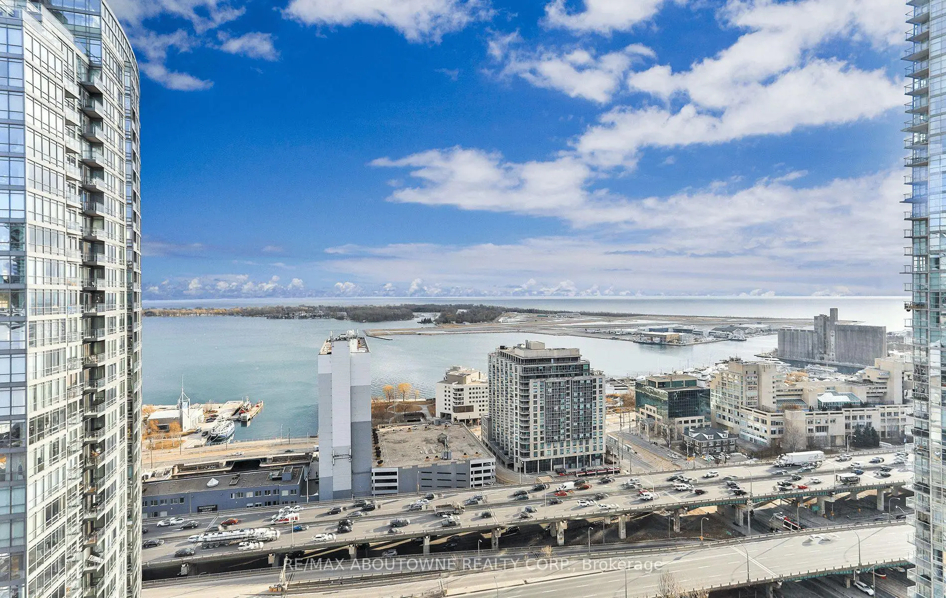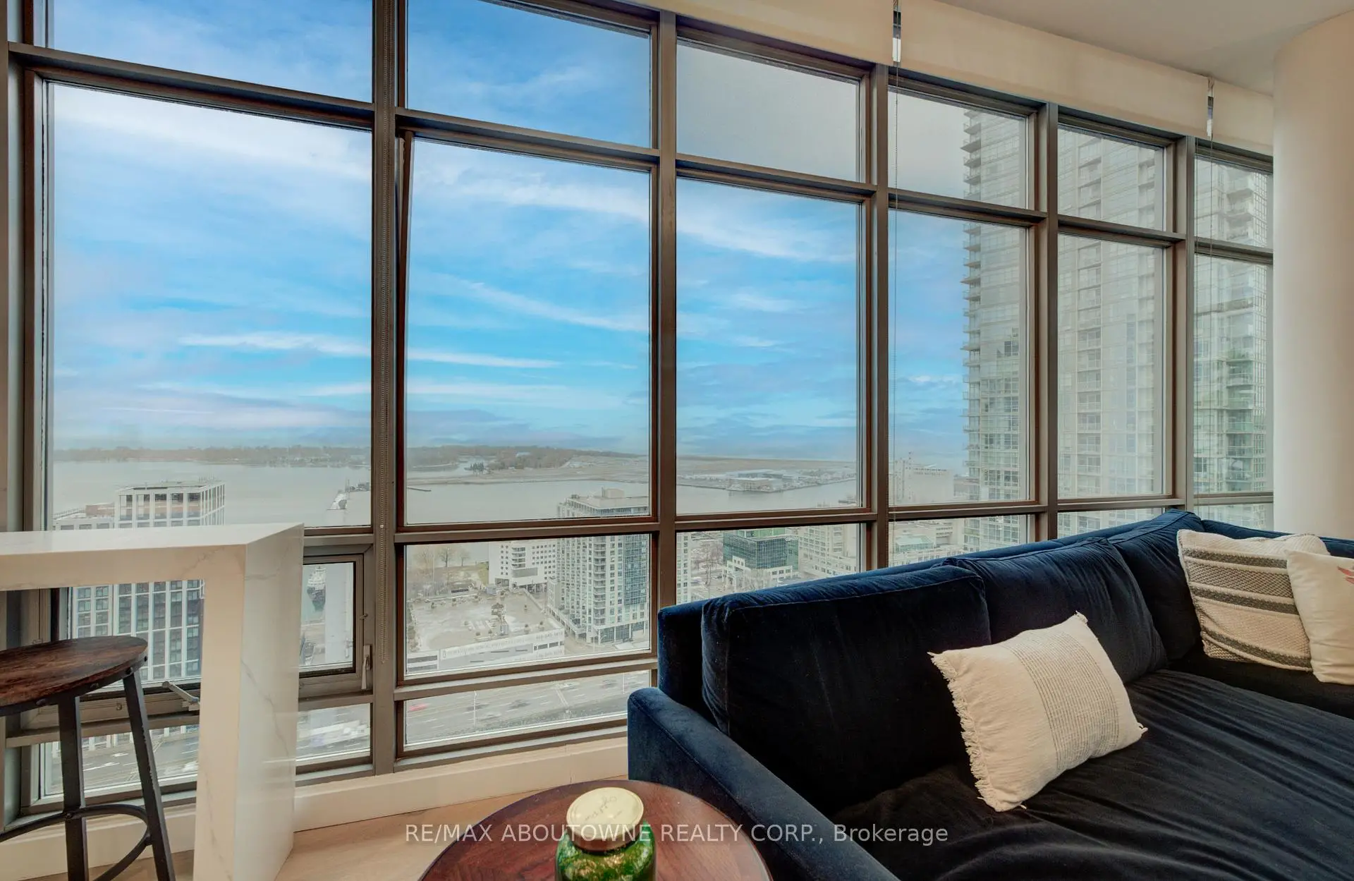 Live at the Lake in a rare Penthouse Corner Suite. Experience elevated living in this stunning penthouse suite featuring 10-ft floor-to-ceiling panoramic windows with breathtaking south views of Lake Ontario & the Island Airport. Located in sought-after Harbour View Estates, residents enjoy exclusive access to the renowned "Super Club"-a separate facility with indoor access offering an indoor pool, gym, BB courts, squash, tennis, & more. This fully renovated home offers approximately 1,100 sq. ft. of thoughtfully designed space, including a bonus room ideal for a home office, complete with 10-ft ceilings & glass French doors. The open-concept kitchen features quartz countertops, stainless steel appliances, a 5-burner gas stove, built-in microwave, breakfast bar with lake views, island stainless steel sink, & a dedicated coffee/beverage bar. The suite showcases high-end 5" engineered hardwood flooring T/O the living areas, custom window coverings, & a neutral designer colour palette. Both bathrooms have been beautifully renovated with oversized tiles, glass enclosures, & quartz finishes. The primary ensuite feat a rain shower with an oversized glass shower, while the main bath offers a full-sized tub. Two generously sized bedrooms incl double closets, the unit is equipped with full-size ensuite laundry. Penthouse living is complemented by two side-by-side parking spaces, conveniently located just steps from the building entrance. Ideally situated at 3 Navy Wharf, this location is steps to the Rogers Centre, minutes to Scotiabank Arena, the CN Tower, & the Well entertainment district. Quick access to the Gardiner via Spadina, & seamless transit options including GO Train, UP Express, & subway are all nearby. The building offers 24-hour concierge service, an excellent elevator-to-unit ratio with only 30 floors & 3 elevators. If you're seeking a rarely offered penthouse corner suite with balcony, spectacular lake views, an unbeatable downtown lifestyle, this is it!