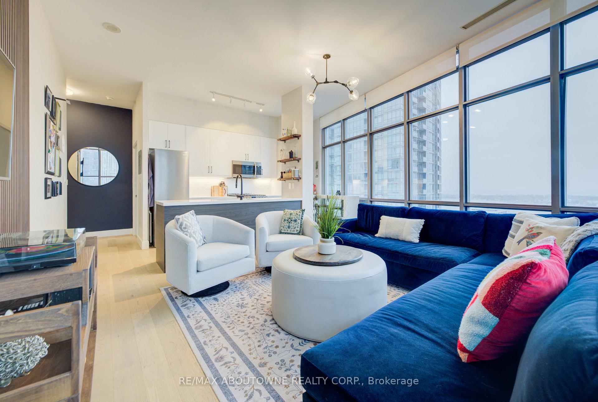 Live at the Lake in a rare Penthouse Corner Suite. Experience elevated living in this stunning penthouse suite featuring 10-ft floor-to-ceiling panoramic windows with breathtaking south views of Lake Ontario & the Island Airport. Located in sought-after Harbour View Estates, residents enjoy exclusive access to the renowned "Super Club"-a separate facility with indoor access offering an indoor pool, gym, BB courts, squash, tennis, & more. This fully renovated home offers approximately 1,100 sq. ft. of thoughtfully designed space, including a bonus room ideal for a home office, complete with 10-ft ceilings & glass French doors. The open-concept kitchen features quartz countertops, stainless steel appliances, a 5-burner gas stove, built-in microwave, breakfast bar with lake views, island stainless steel sink, & a dedicated coffee/beverage bar. The suite showcases high-end 5" engineered hardwood flooring T/O the living areas, custom window coverings, & a neutral designer colour palette. Both bathrooms have been beautifully renovated with oversized tiles, glass enclosures, & quartz finishes. The primary ensuite feat a rain shower with an oversized glass shower, while the main bath offers a full-sized tub. Two generously sized bedrooms incl double closets, the unit is equipped with full-size ensuite laundry. Penthouse living is complemented by two side-by-side parking spaces, conveniently located just steps from the building entrance. Ideally situated at 3 Navy Wharf, this location is steps to the Rogers Centre, minutes to Scotiabank Arena, the CN Tower, & the Well entertainment district. Quick access to the Gardiner via Spadina, & seamless transit options including GO Train, UP Express, & subway are all nearby. The building offers 24-hour concierge service, an excellent elevator-to-unit ratio with only 30 floors & 3 elevators. If you're seeking a rarely offered penthouse corner suite with balcony, spectacular lake views, an unbeatable downtown lifestyle, this is it!