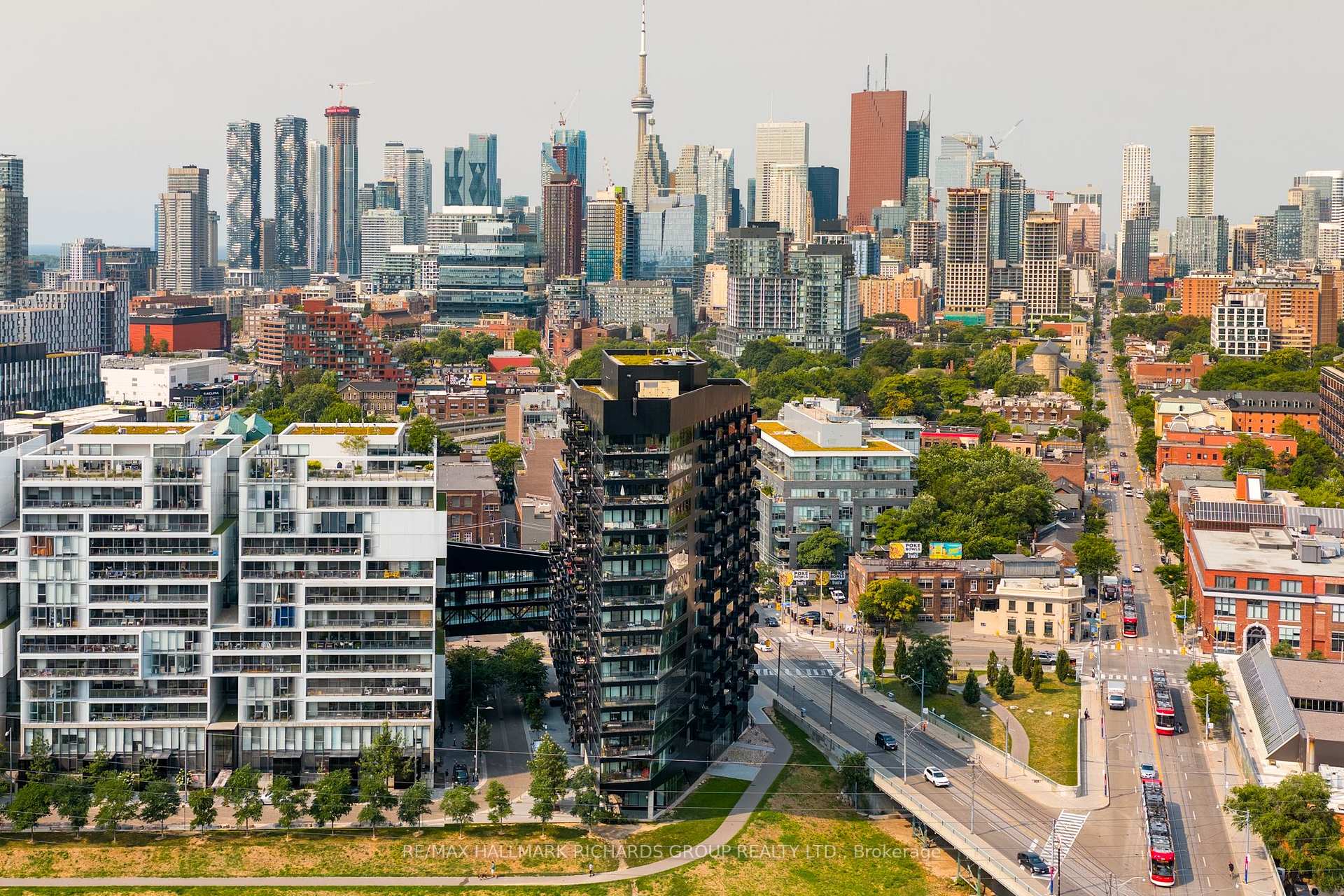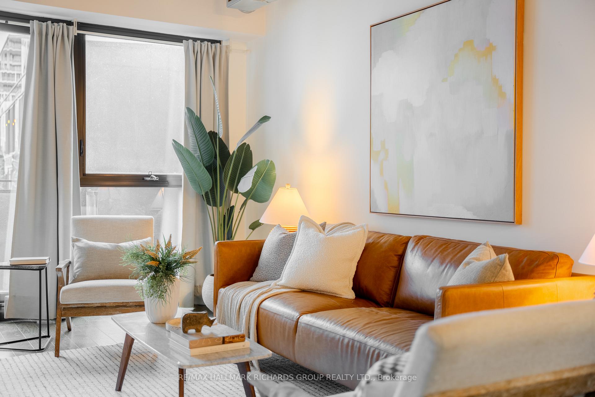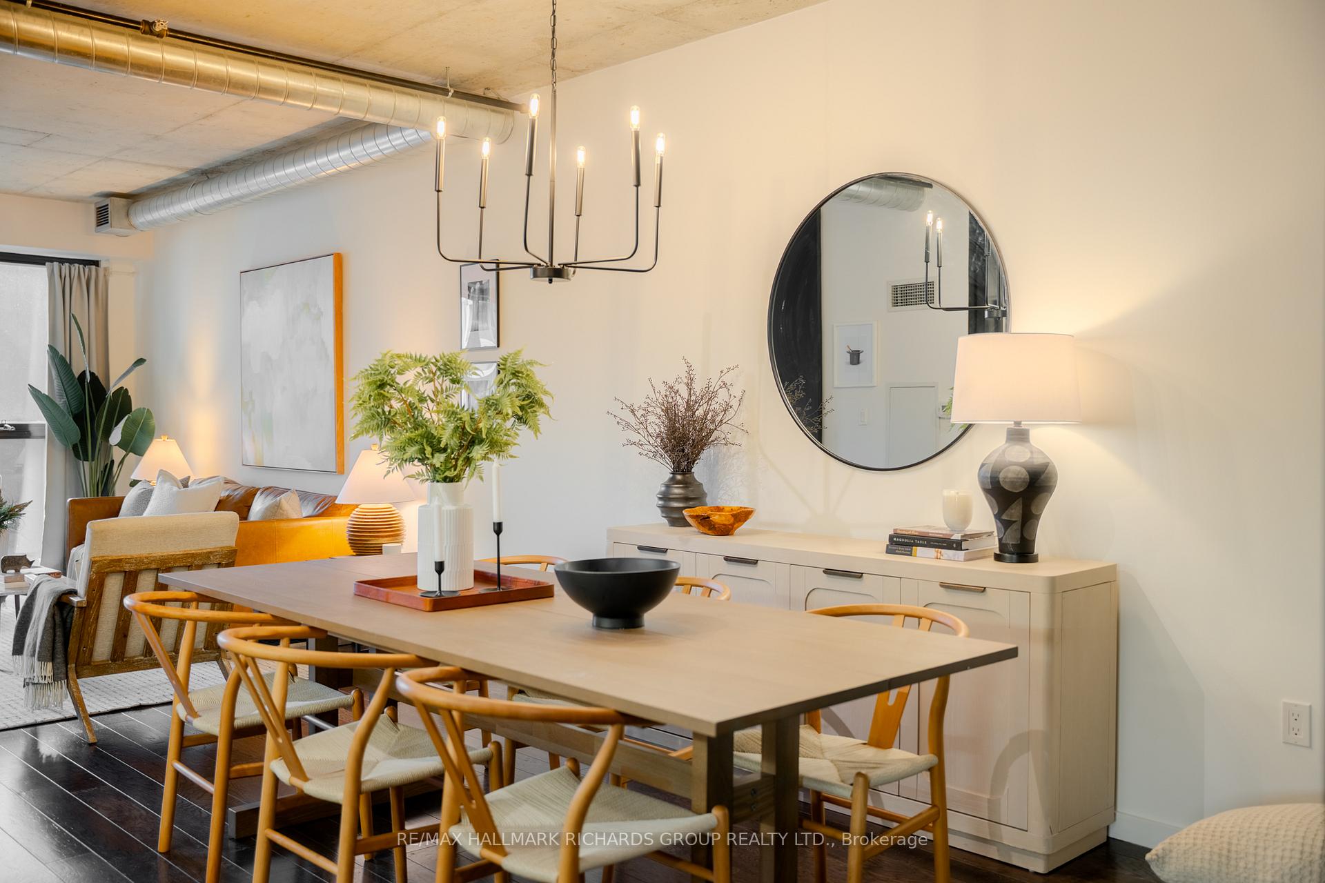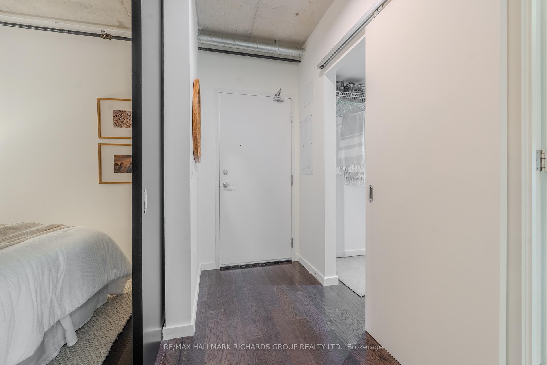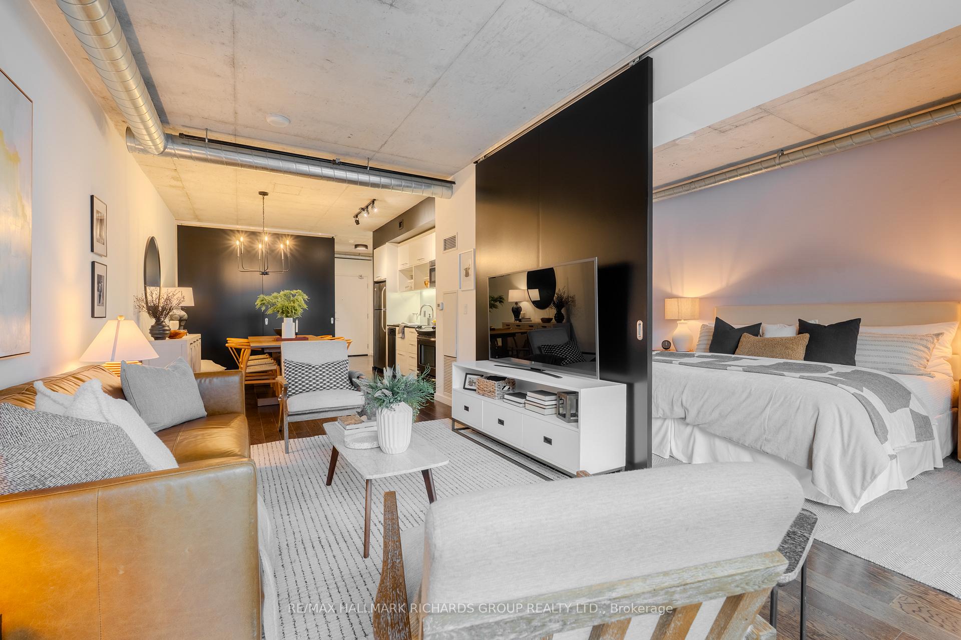 A thoughtfully designed loft-style residence that delivers exceptional flexibility, natural flow, and a lifestyle-forward setting in the heart of the Canary District. This open-concept one-bedroom plus den offers a rare level of versatility, with a generously sized den that comfortably functions as a true second bedroom. A collapsible wall allows the space to open seamlessly for entertaining or close off for privacy, work-from-home needs, or guests. Concrete ceilings and warm hardwood floors create a modern, architectural backdrop, while the kitchen integrates effortlessly with the living and dining areas for everyday ease and hosting alike. Storage is both abundant and intentionally planned, highlighted by an oversized walk-in closet located in the front hall, making it ideal as additional storage for a second bedroom or den setup. The semi-ensuite, dual-access bathroom is complemented by extended cabinetry and linen storage above a brand new washer/dryer combo (2025) for added functionality. Step outside to an open balcony overlooking the landscaped courtyard and outdoor pool, offering a resort-like atmosphere that truly shines in the warmer months. Surrounded by some of downtown Toronto's most thoughtfully planned green space, including the expansive Corktown Commons just steps away, perfect for morning walks, sunset runs, or relaxed afternoons outdoors. Enjoy downtown living without the chaos, while in close proximity to the Distillery District, St. Lawrence Market, Riverside, and Leslieville, with easy TTC access to King and Queen streetcars and seamless connectivity to the DVP, Lakeshore, and Bayview Extension. Everyday conveniences abound, from parks and trails to fitness centres, grocery options, dog-friendly cafes, and standout dining destinations such as The Broadview Hotel rooftop. A well-managed building with 24/7 security and impeccably maintained common areas completes the offering - a refined, flexible home designed for modern urban living.
