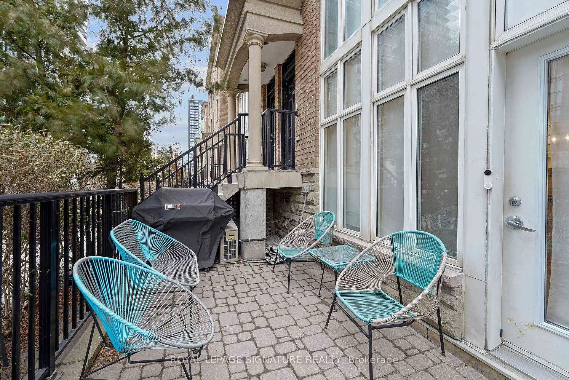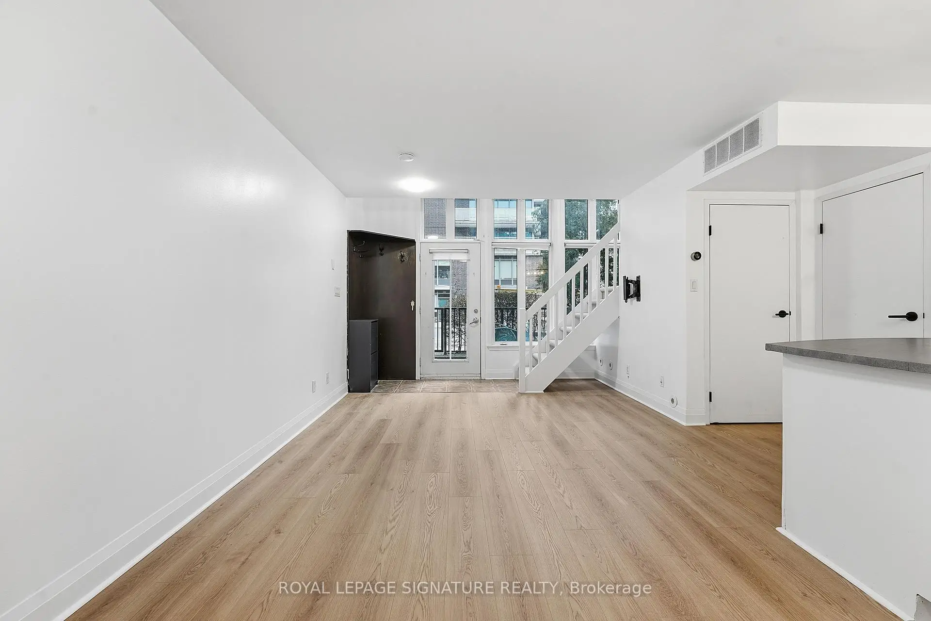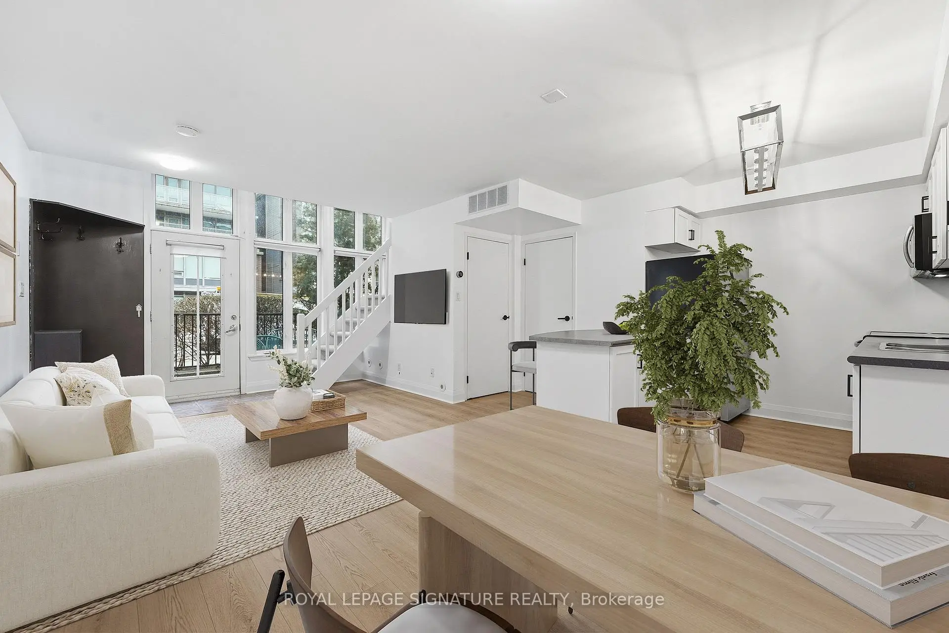 Bright south-facing two-storey loft-style townhouse in the heart of Liberty Village, offering 810 square feet of well-designed interior living space. This main level above grade townhome features 1 bedroom plus den and two bathrooms, including a main-level powder room, brand new flooring, paint and lighting. The open-concept main level is filled with natural light and offers a functional kitchen with full-size stainless steel appliances, generous counter space and an area for a dining table. The living space walks out to a large private terrace, ideal for everyday use and entertaining. The upper level features a spacious primary bedroom with an ensuite bathroom, along with a versatile den well suited for a home office or flexible living space. Parking and locker included, all the mechanical items are owned. Steps to Altea gym, the new Farmhouse market, plus all the shops, restaurants, transit, and everyday amenities you expect downtown.
