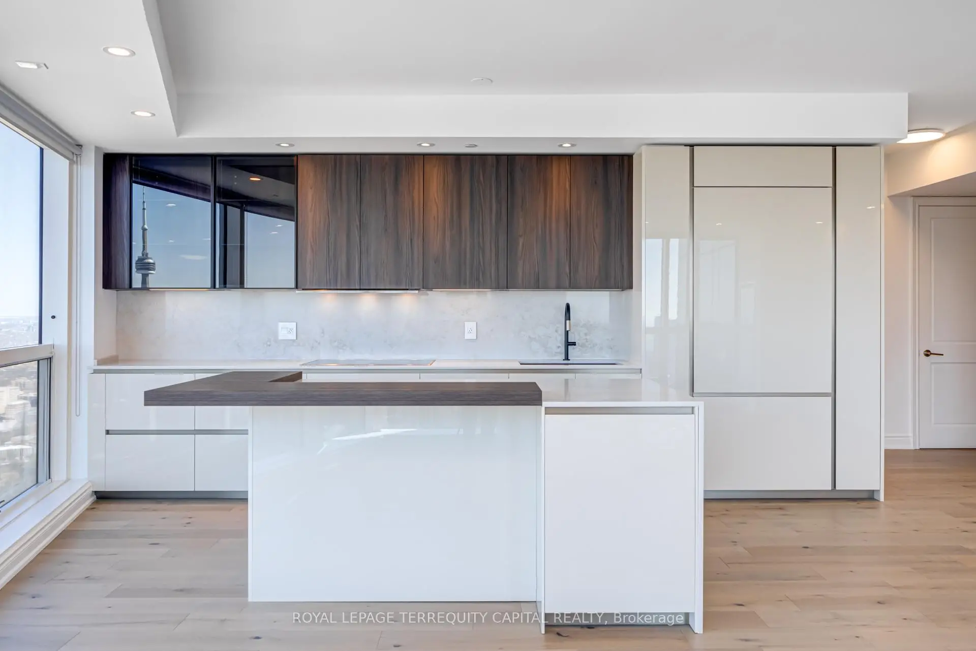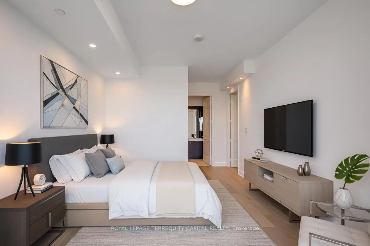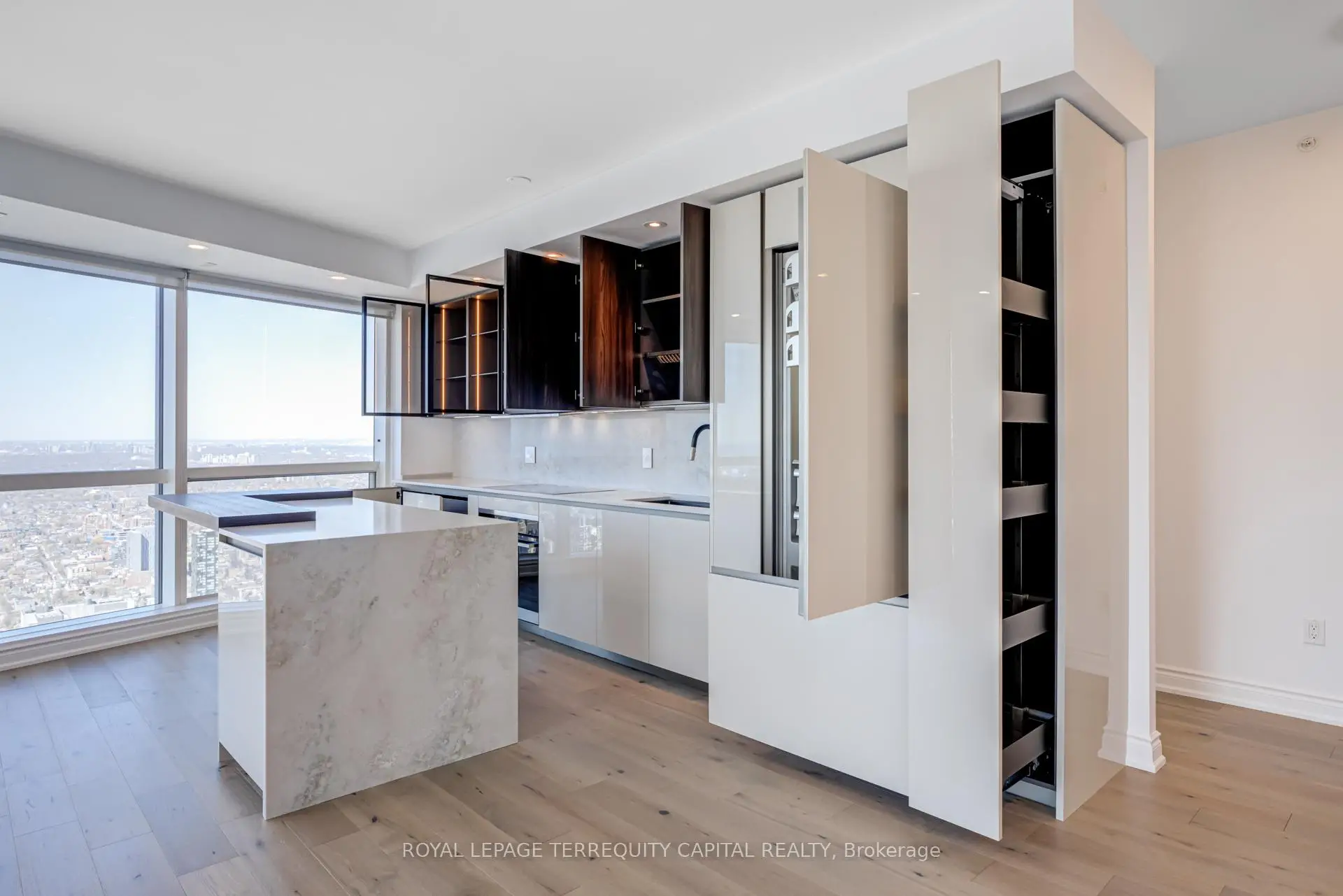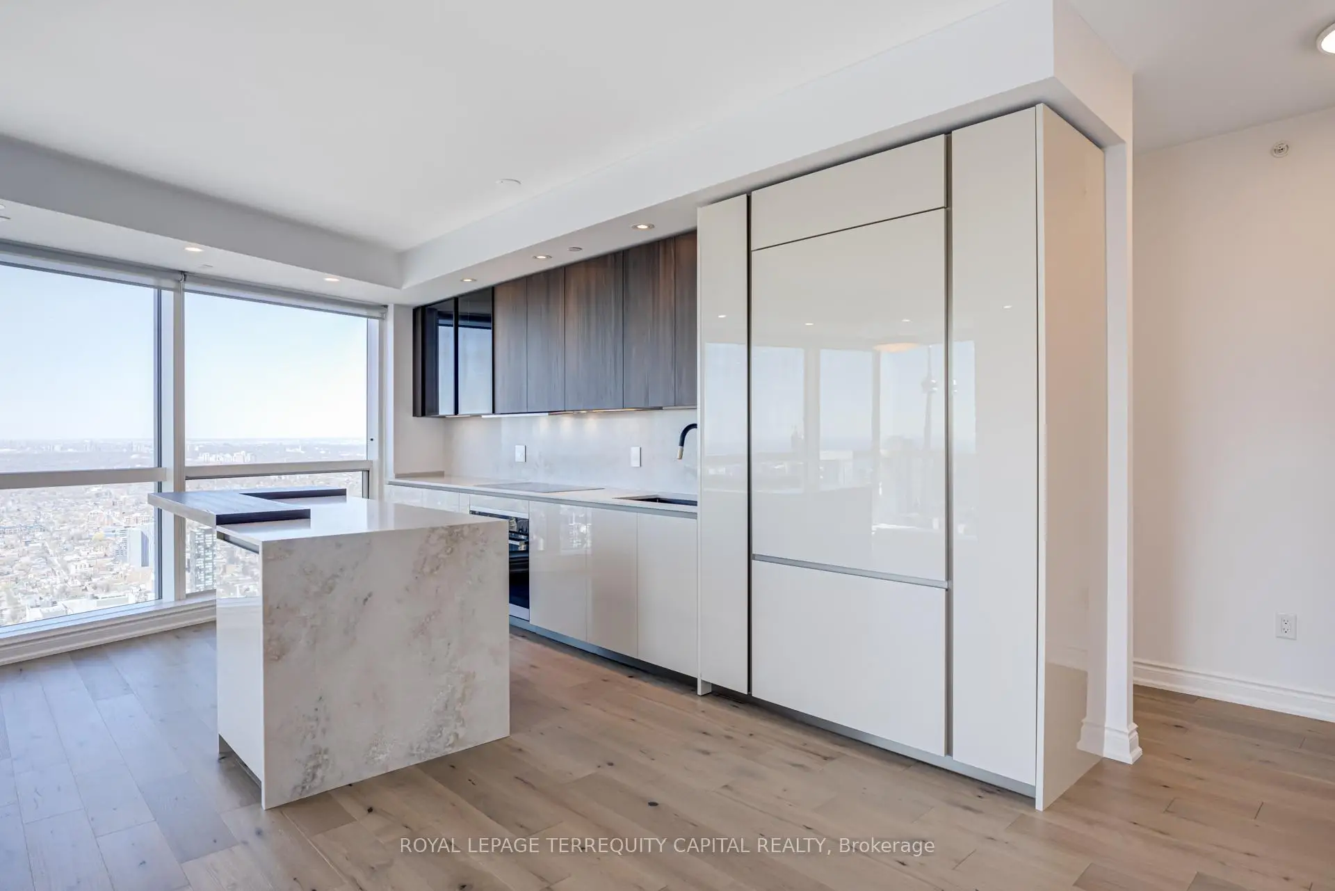 Welcome to Aura at College Park- a landmark address in the vibrant heart of Downtown Toronto. This stunning southwest corner suite offers 1,252 sq. ft. of luxurious living space, FULLY RENOVATED TOP TO BOTTOM. featuring 2 bedrooms + den, 9-ft ceilings, and floor-to-ceiling windows framing unobstructed CN Tower and Lake Ontario views. Custom European finishes, this home exudes sophistication and quality craftsmanship. The custom Italian kitchen and built-in closets (valued at $140K+) are complemented by top-of-the-line appliances- Miele (Germany), Fhiaba (Italy), and AEG (Italy)- along with a built-in wine cellar, engineered hardwood floors, pot lights, and smooth ceilings throughout. The open-concept layout features a spacious kitchen and oversized island ideal for entertaining. The versatile den can serve as a third bedroom or home office, offering flexibility for any lifestyle. Enjoy unparalleled convenience with direct indoor access to IKEA, Marshalls, and the TTC subway. Steps to the Eaton Centre, Financial District, U of T, TMU, and Toronto's top hospitals and research centres, Aura is perfect for urban professionals. Residents enjoy access to the Higher Ground Health Club, a grand lobby, and world-class amenities in this prestigious tower. With a Walk Score of 99 and Transit Score of 100, everything you need is right at your doorstep. A must-see suite in one of Toronto's most iconic buildings!
