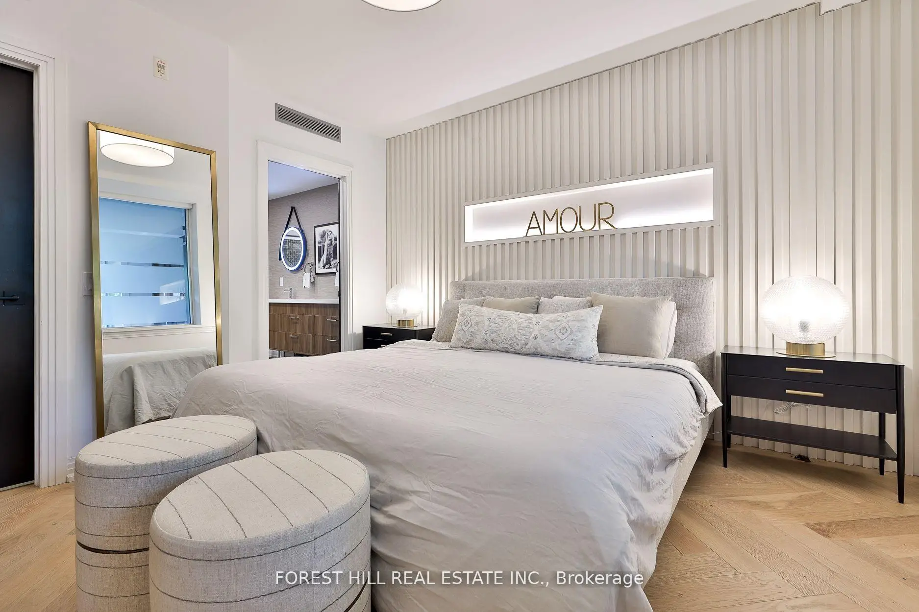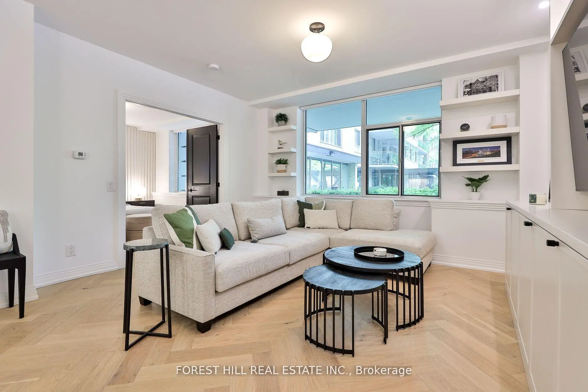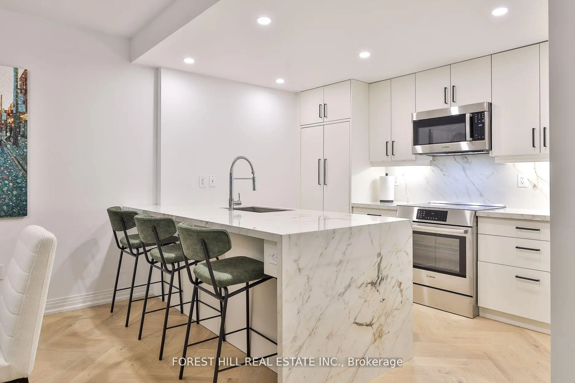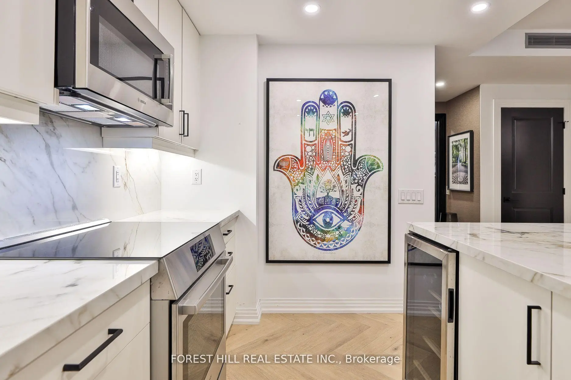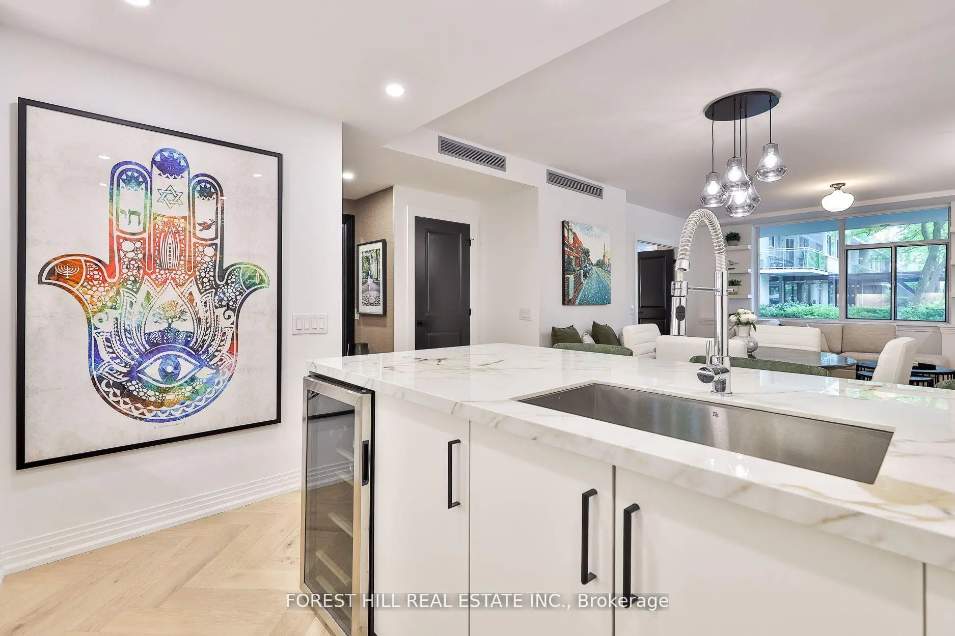Sophisticated and serene main-level suite in the emblamatic Benvenuto. This beautifully redesigned 1-bedroom plus den residence offers 956 sq. ft. of refined living, with no need for elevators simply valet your car & walk right in from the main floor for ultimate ease and privacy. Thoughtfully renovated to enhance functionality and flow, the kitchen has been expanded and features a large island, marble countertops, and a clean, modern layout ideal for entertaining. Wide-plank white oak herringbone flooring runs throughout the space, adding timeless elegance. The spa-inspired bathroom is generously sized, with striking hexagon tile, a seamless glass shower equipped with full body jets and a rain shower head, plus a large double-sink vanity with excellent storage. The bedroom includes custom wall panelling, a smartly designed walk-in closet and semi-ensuite access to the bath. A separate den, accessible through sliding doors, offers a flexible space for a home office or reading nook. West-facing exposure brings in soft afternoon light, complementing features like the custom built-ins throughout, custom built ins in the living room and den w/lighting, and remote controlled blinds. Enjoy the comfort and security of valet parking and the prestige of living in a mid-century architectural gem also home to the celebrated Scaramouche Restaurant. An ideal choice for those looking to downsize in style or enjoy a turnkey pied-a-terre with unmatched convenience.