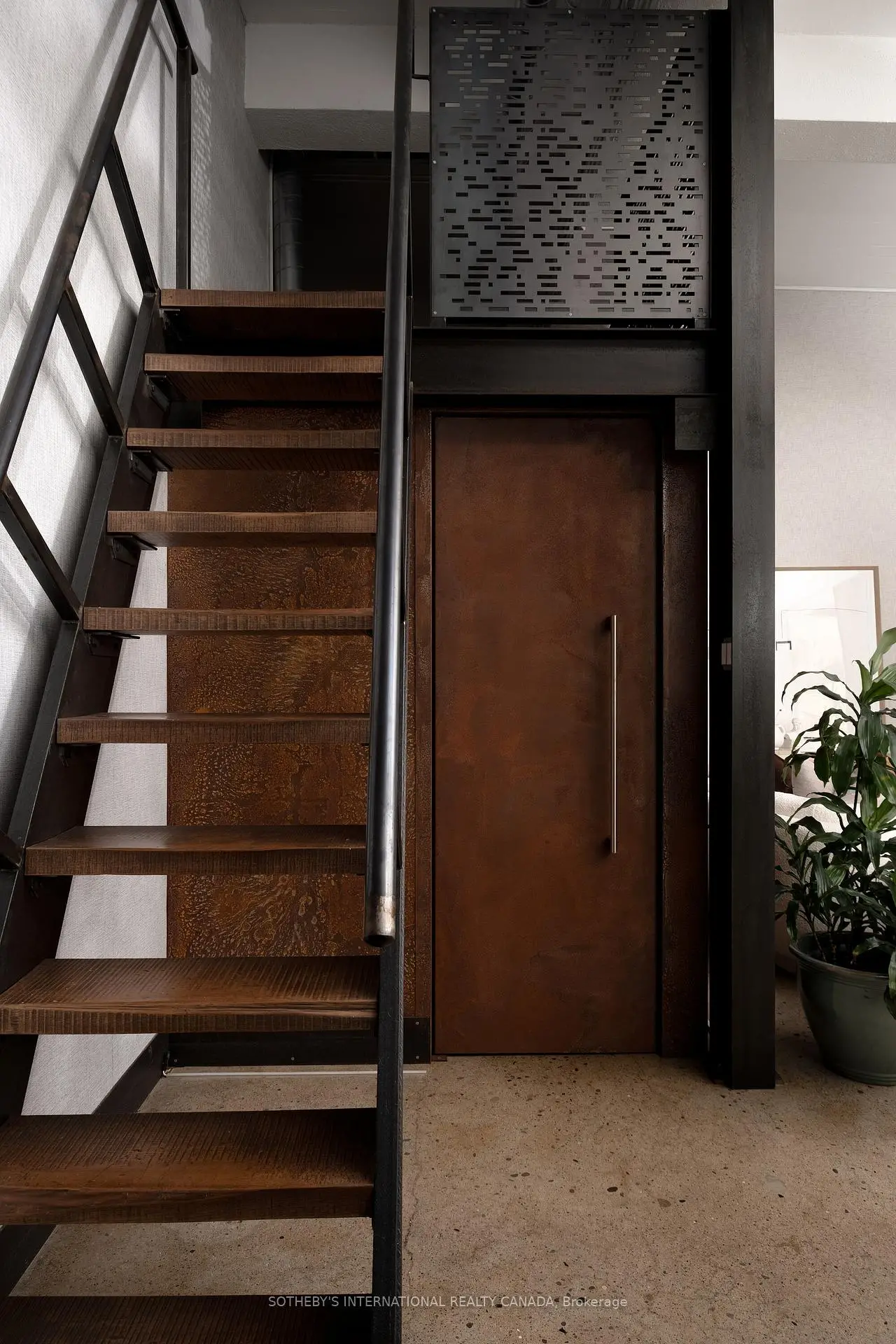 Set within the former Evening Telegram building, this two-storey loft captures the clarity of authentic industrial architecture - open yet intimate, expressive yet composed. Designed to support both living and creative work, the space unfolds with quiet intention.The main level is defined by an open, fluid plan integrating the primary bedroom and ensuite, a flexible lounge, and a mezzanine alcove suited to reading or listening. Polished concrete floors and patinated steel establish a grounded architectural framework, softened by the warmth of the bedroom's custom Brazilian cherry headboard with integrated storage and full closet. The ensuite extends this sense of retreat through a restrained palette of veined marble radiant floors, perforated metal, and glass surround, shaping an atmosphere that feels calm, tactile, and restorative. Above, the kitchen, dining, and secondary living area flow together beneath a skylight that draws natural light across brick, black tile, and steel. A sculptural Ortal fireplace anchors the space-contemporary in form, timeless in presence-while polished concrete floors maintain continuity with the level below. A second bedroom and full bathroom complete the upper floor, offering flexibility for guests, work, or quiet retreat.Connected by a spiral staircase, each level also benefits from independent access, allowing the loft to move seamlessly between residential and creative use. A private rooftop terrace provides an outdoor counterpoint, and parking is included-an uncommon offering within this intimate heritage conversion.Balanced, deliberate, and quietly expressive, this loft brings past and present into alignment-a design-led space defined by light, material, and a distinct architectural presence.